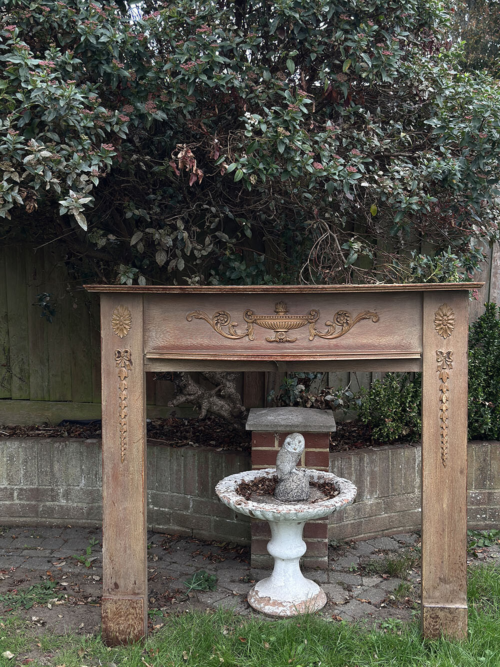 이 빈티지 오크 파이어 서라운드는 가구라기보다는, 벽난로를 중심으로 공간의 인상을 완성하던 건축적 장식 요소에 가까운 물건입니다. 본래는 파이어플레이스를 감싸는 구조물로 설치되어, 난로 주변을 하나의 장면처럼 정리해주는 역할을 했죠. 지금처럼 벽난로가 없는 환경에서도 독립적인 월 오너먼트로 활용되는 경우가 많은 이유이기도 해요.