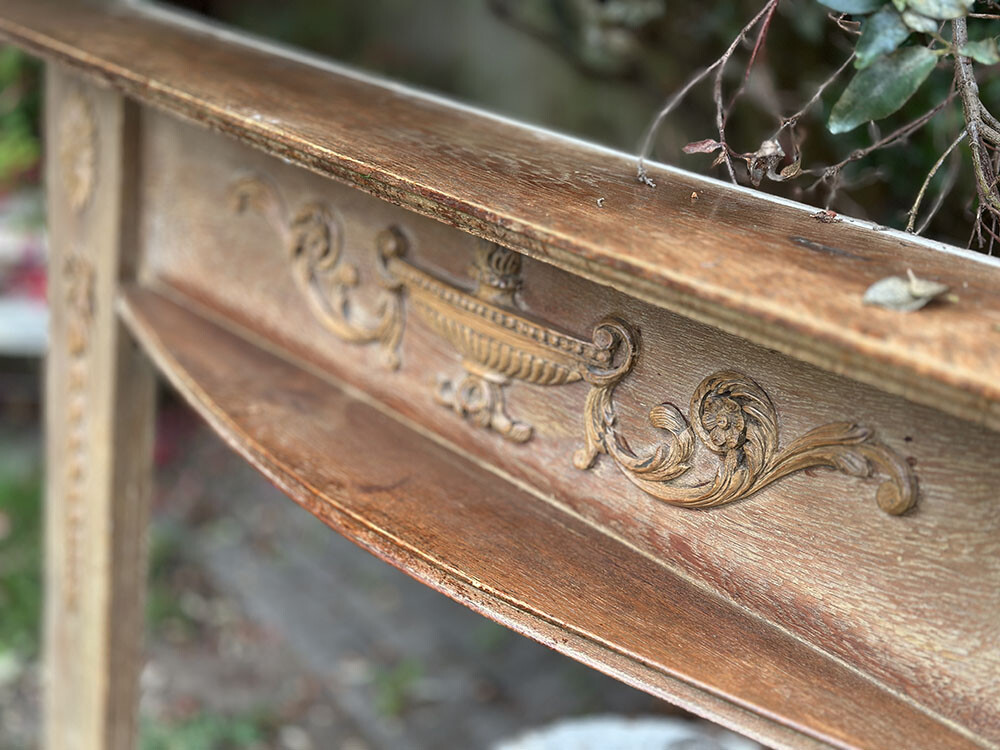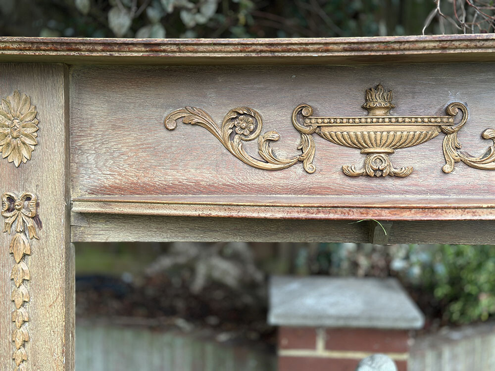 형태와 장식 어휘를 보면 신고전주의적 흐름이 또렷하게 드러납니다. 중앙부에는 부조 형태의 언(urn)이 자리하고, 그 좌우로 양 기둥에는 파테라와 리본, 벨 플라워 모티프가 더해져 있는데, 이런 요소들은 1600년대 이래 유럽에서 오랫동안 반복되어 온 전형적인 장식 언어죠. 좌우 비례와 중심축이 명확하게 잡혀 있다는 점이 인상적입니다.