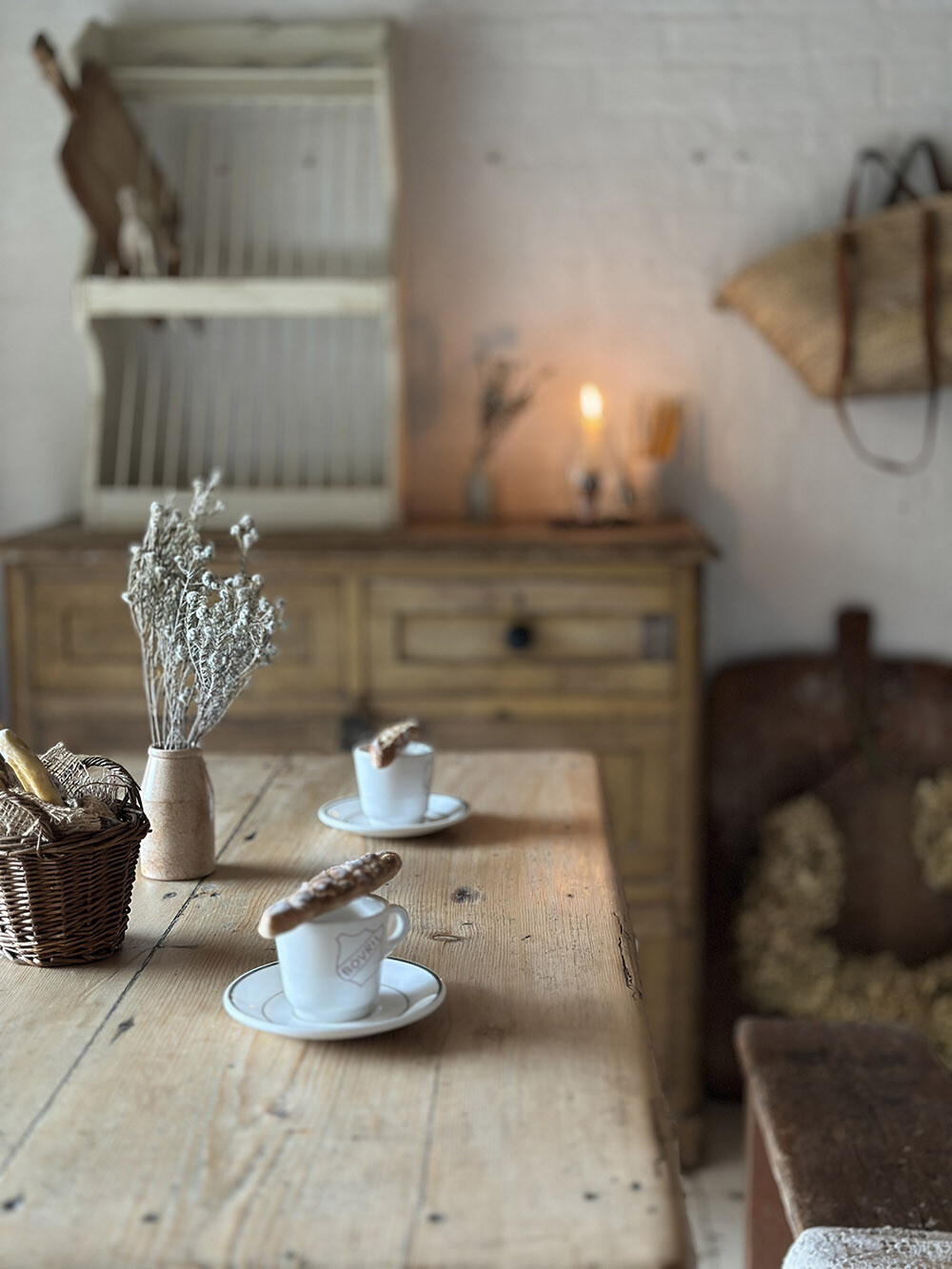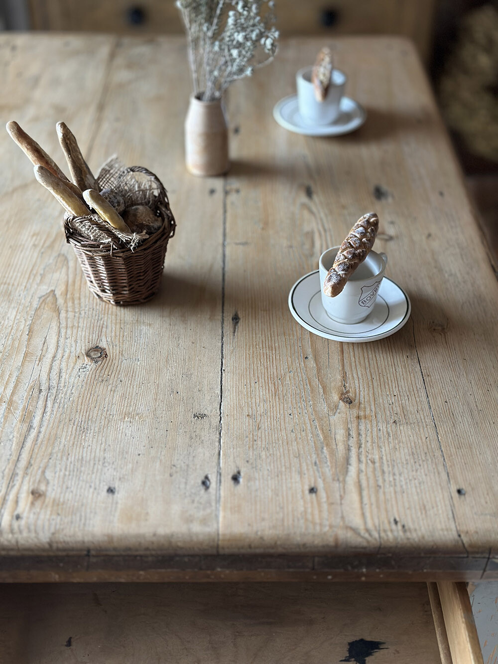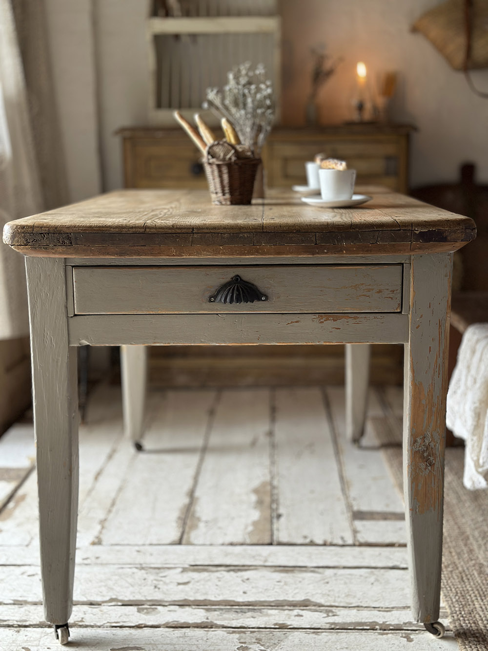 따뜻한 파인 상판과 그레이 컬러의 쉐비 시크 페인팅이 대비를 이루는 올드 빈티지 파인 테이블입니다. 상판은 여러 장의 파인 패널로 구성되어 있으며, 시간이 지나며 판재가 뒤틀리는 것을 방지하기 위해 하부에 보강 패널을 덧대는 방식으로 제작되어 있습니다. 덕분에 구조적으로 안정감을 유지하면서도 파인 목재 특유의 결와 색감, 그리고 오랜 사용 속에서 만들어진 자연스러운 표정이 잘 살아 있습니다.