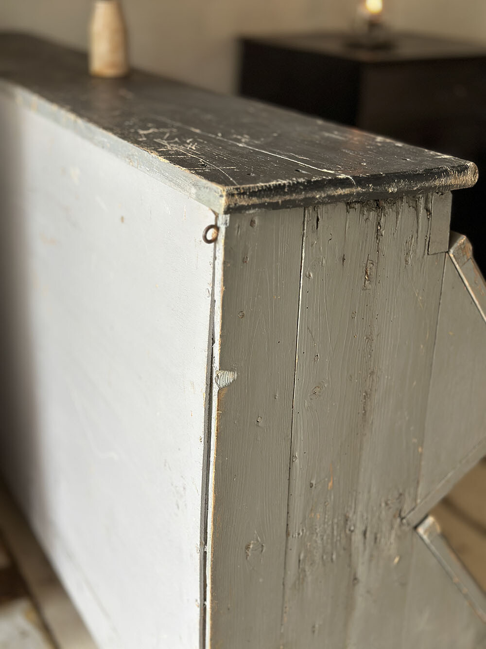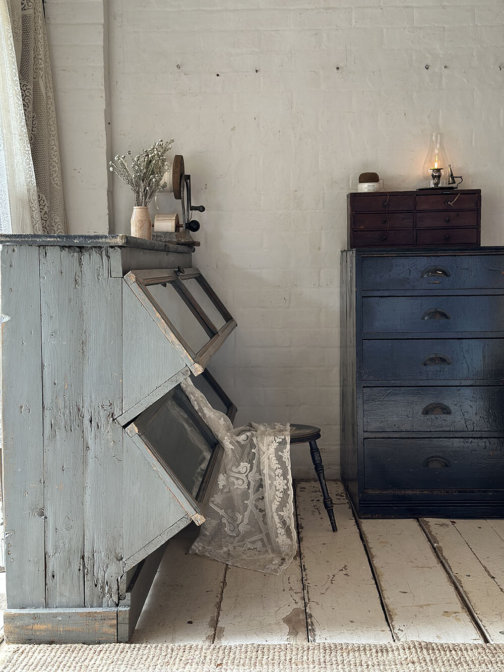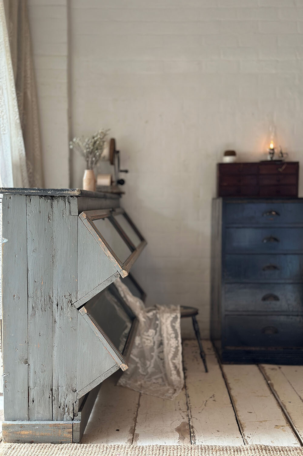 쉐비 시크 페인팅 아래로 드러나는 목재의 결, 모서리와 프레임에 남은 마모는 인위적인 연출이 아니라 오랜 사용 끝에 쌓인 흔적입니다. 칠이 벗겨진 지점마다 시간의 결과 손길이 남아 있어서, 상업 공간은 물론 갤러리나 스튜디오처럼 전시가 중요한 공간에도 설득력 있게 들어가죠.