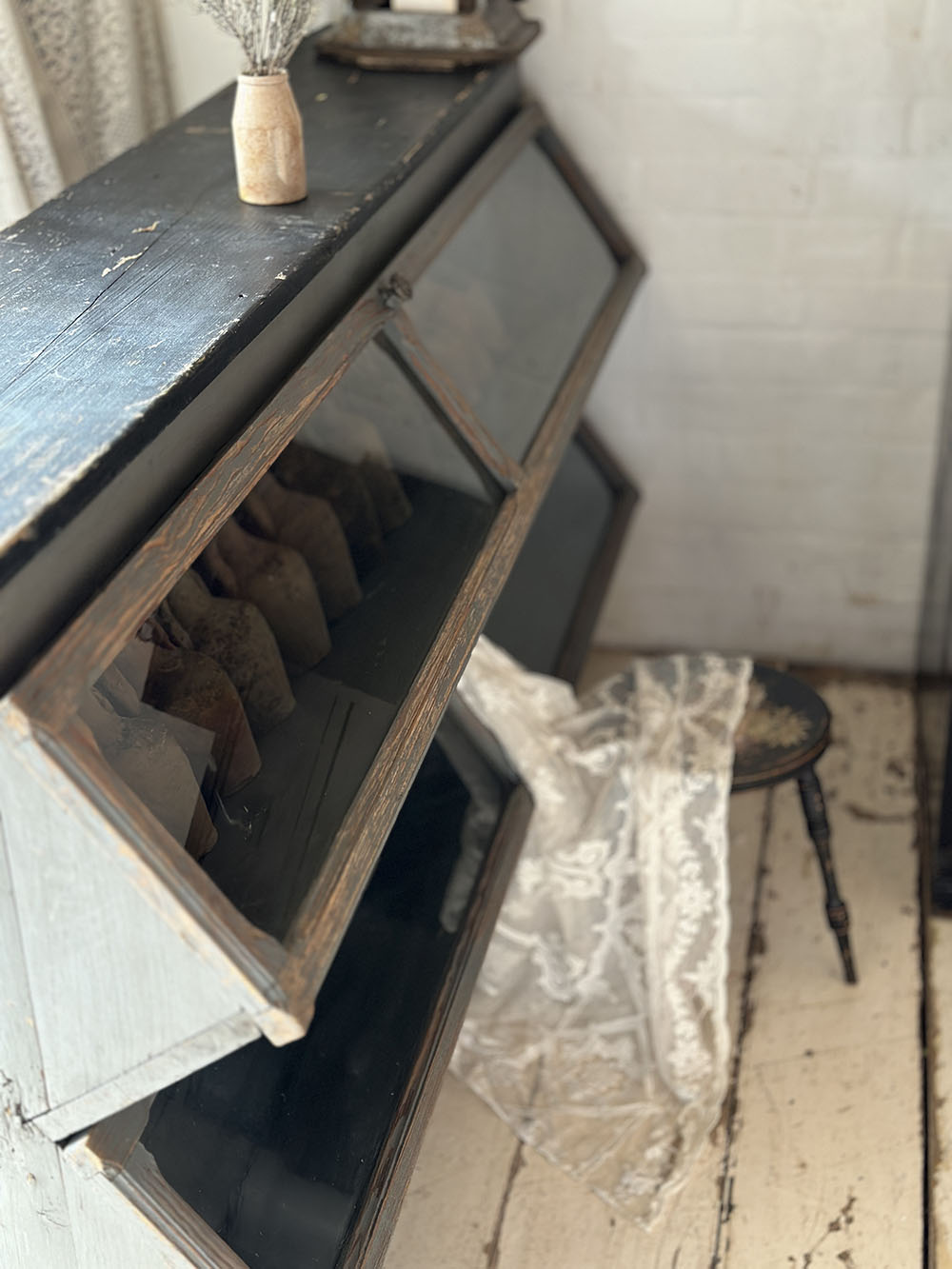 이 올드 빈티지 쉐비 시크 샵 디스플레이 캐비넷은 본래 상업 공간에서 실제로 사용되던 디스플레이 가구를 수집한 피스입니다. 상·하 2단으로 길게 구성된 스토리지는 약 45도 각도로 기울어져 있어, 서 있는 상태에서도 내부가 자연스럽게 시야에 들어오도록 설계되어 있어요. ‘수납’보다는 ‘전시’를 전제로 한 구조라는 점에서 이 가구의 성격이 분명합니다.