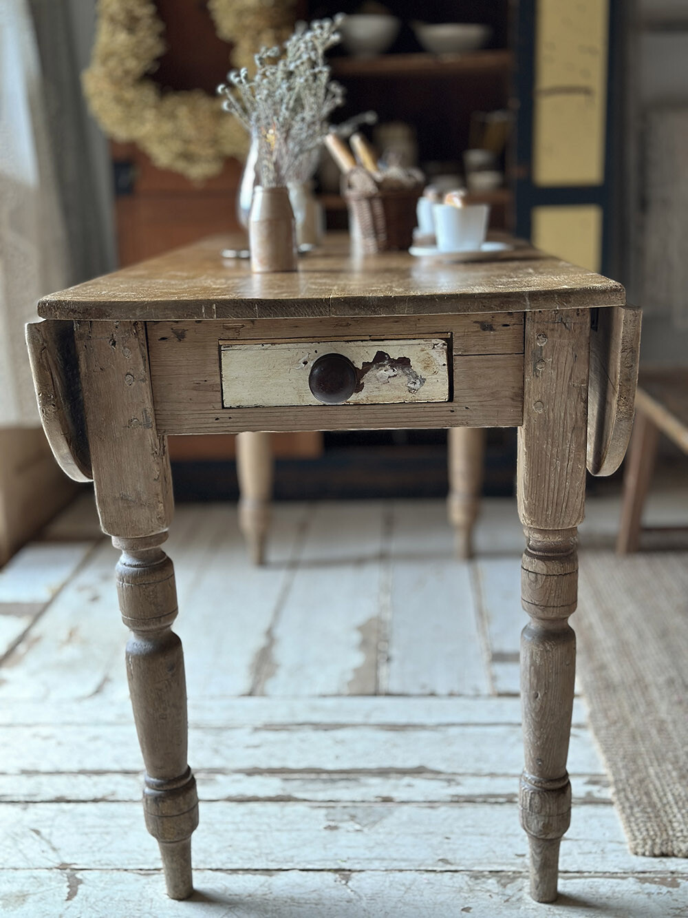 양쪽에 드랍리프 상판이 달린 구조로, 필요에 따라 상판을 펼치거나 접어 사용할 수 있는 실용적인 다이닝 테이블이에요. 전체적인 비례는 단정하고 안정감 있게 구성되어 있으며, 잉글리쉬 컨트리 퍼니쳐에서 흔히 볼 수 있는 생활 가구의 전형적인 형태를 잘 담아내고 있습니다.