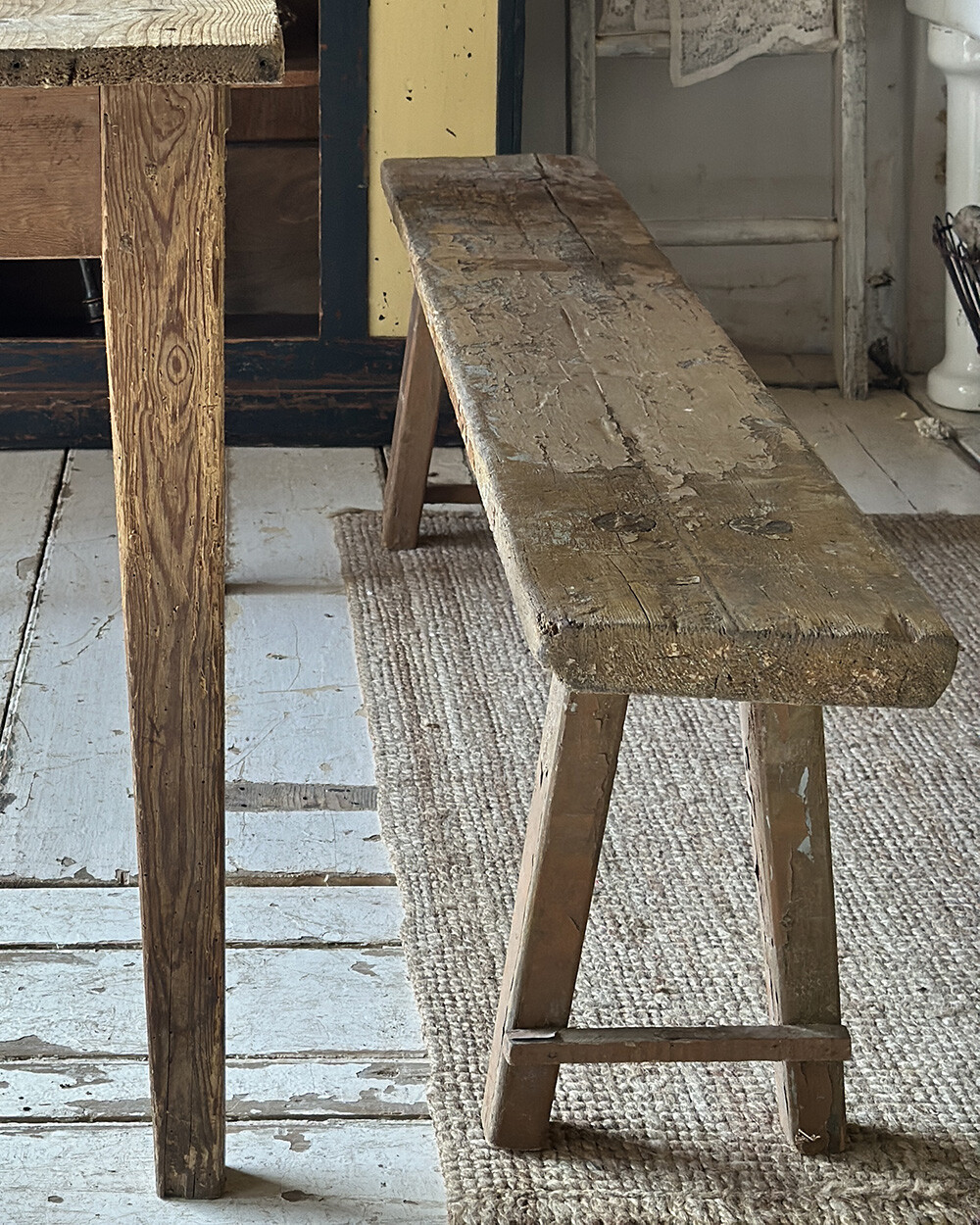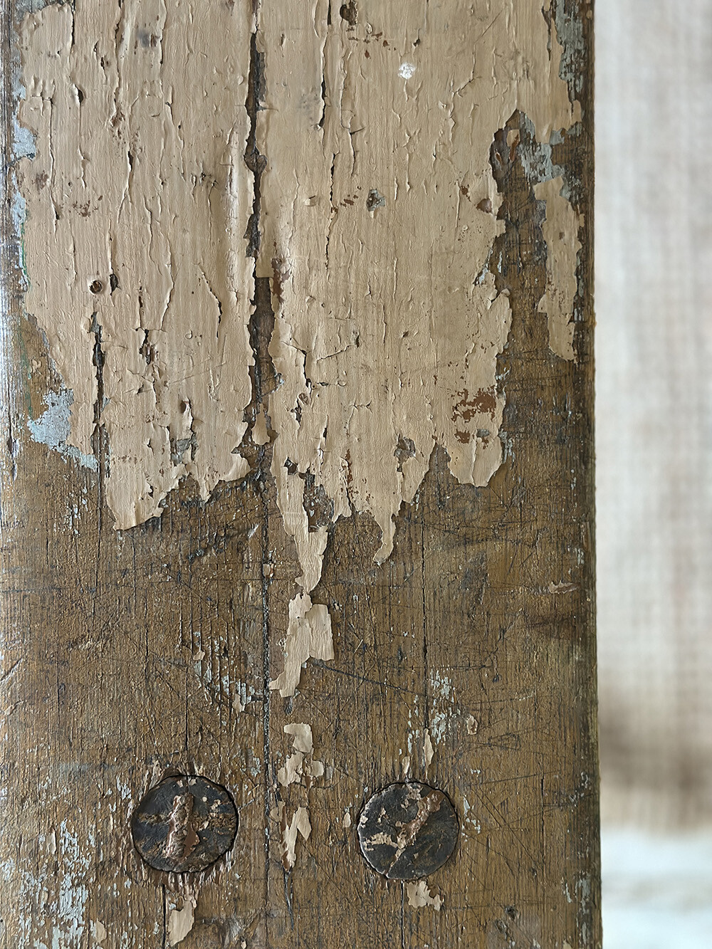 표면에는 사용을 거치며 자연스럽게 벗겨진 쉐비 시크 페인팅이 넓게 자리하고 있습니다. 균일하게 닳은 것이 아니라, 손이 닿고 마찰이 있었던 부분을 중심으로 층층이 드러난 흔적들이 그대로 남아 있죠. 전체적인 프레임은 장부 맞춤 방식으로 견고하게 결구되어 있어, 단순한 빈티지 오브제를 넘어 실제 사용까지 충분히 염두에 둘 수 있는 피스입니다.