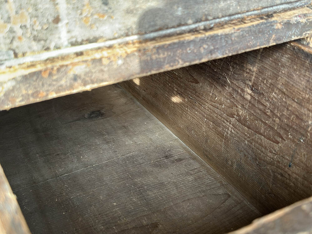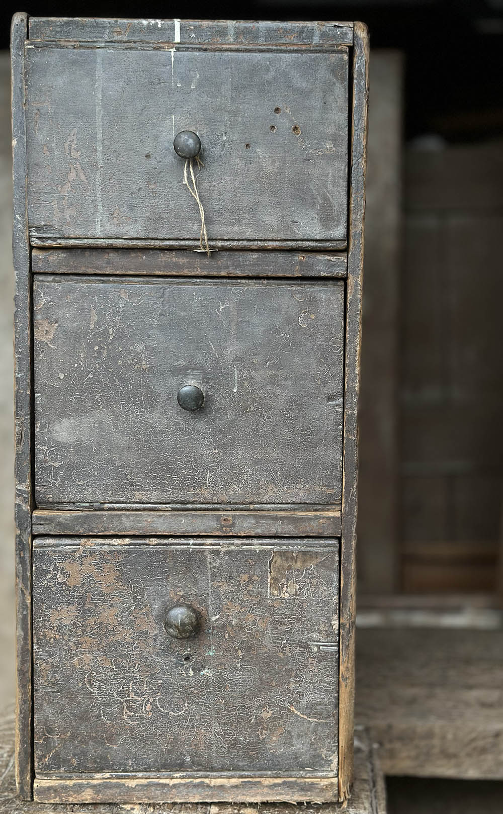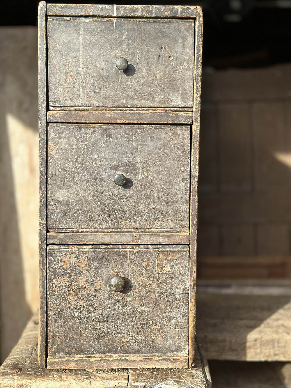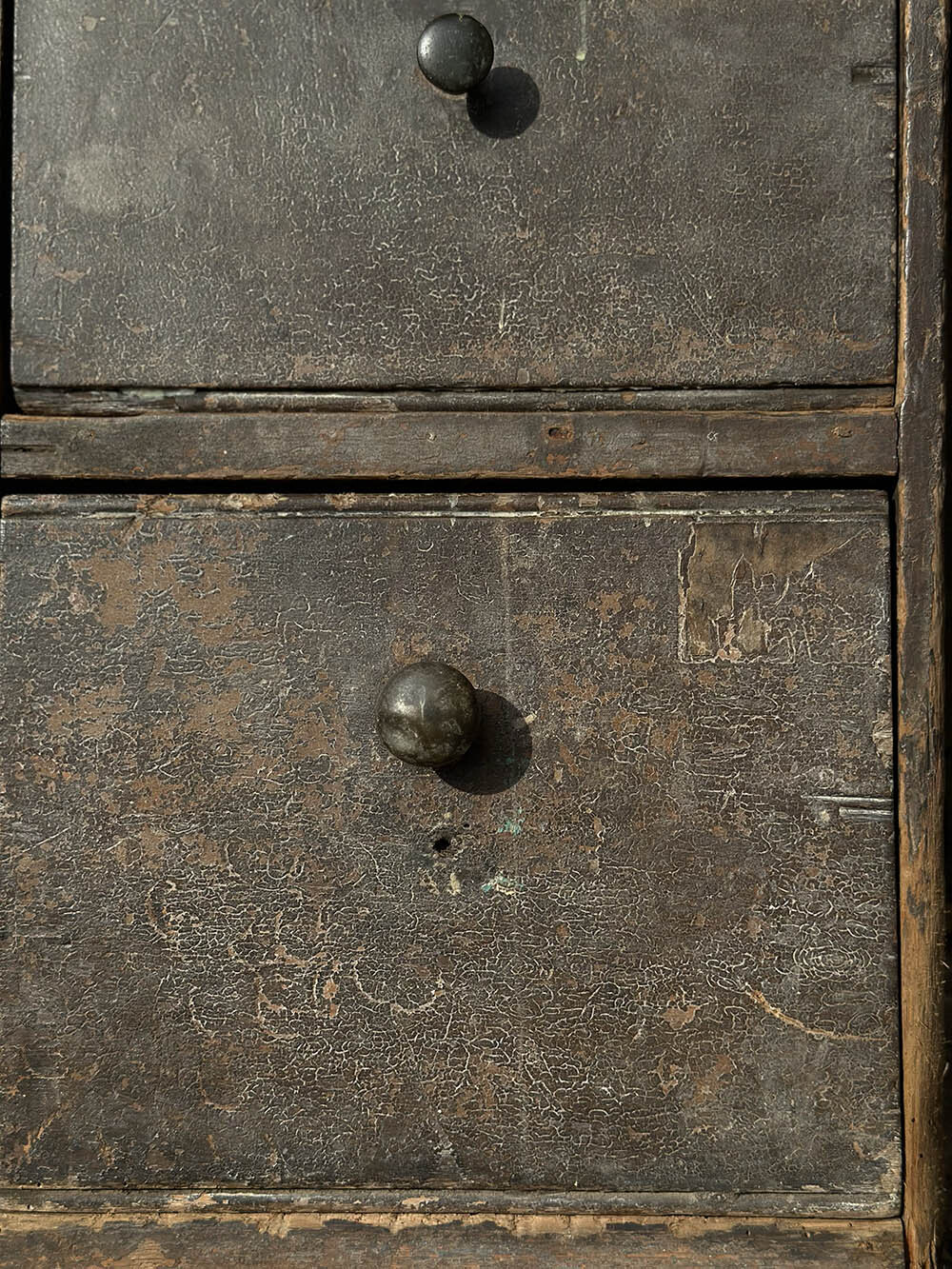 3단 구조의 비교적 단순한 형태를 가지고 있지만, 이 서랍장을 특별하게 만드는 건 결국 이 색의 결입니다. 손에 닿는 자리마다 다르게 닳고 남아 있는 흔적들이 하나의 표면을 이루고 있고, 장부 맞춤으로 짜여진 구조 위에 그렇게 축적된 시간이 그대로 얹혀 있습니다. 하나의 색으로 정의할 수 없는 이 층위가 공간 안에 들어왔을 때, 가구 이상의 존재감으로 작용하는 지점이 분명히 있습니다.
