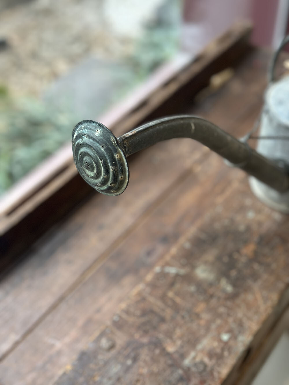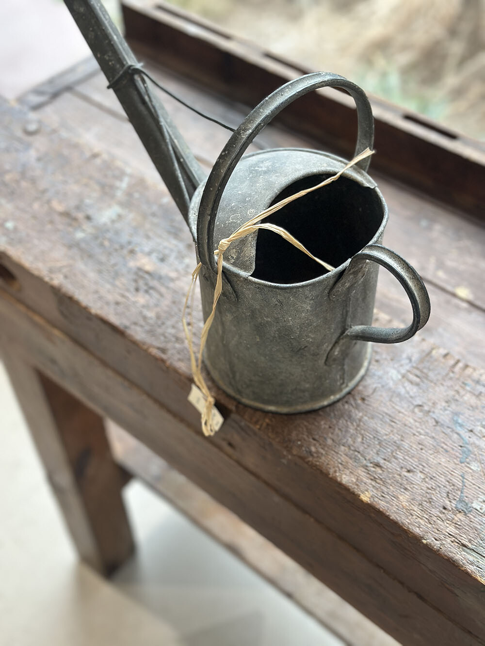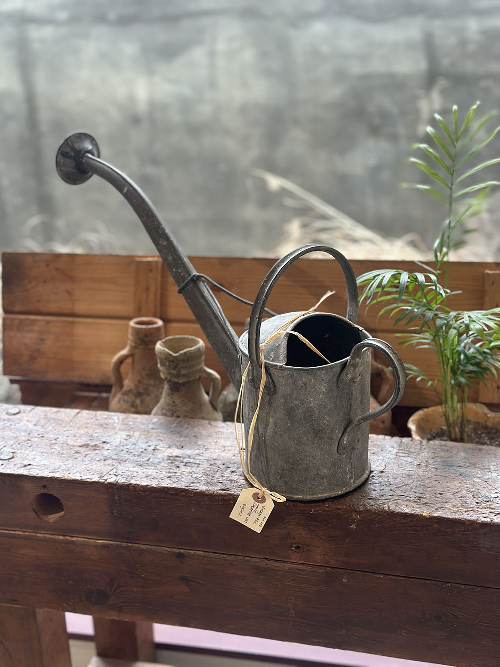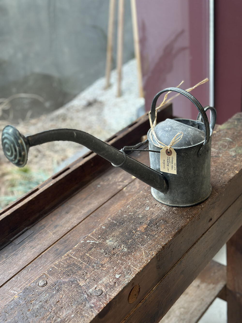 빈티지 스몰 워터링 캔으로, 징크(zinc) 소재 특유의 묵직한 무게감과 두께감이 그대로 느껴지는 피스입니다. 길게 뻗은 스파웃과 컴팩트한 바디, 상부 핸들이 결합된 전형적인 구조를 갖추고 있으며, 소형이지만 실사용을 전제로 제작된 만큼 안정감 있는 비례를 보여주죠. 특히 최근 앤틱·빈티지 가든 영역에서는 이러한 스몰 사이즈 워터링 캔의 수급이 점점 어려워지면서, 희소성이 크게 높아진 아이템 중 하나로 꼽힙니다.
