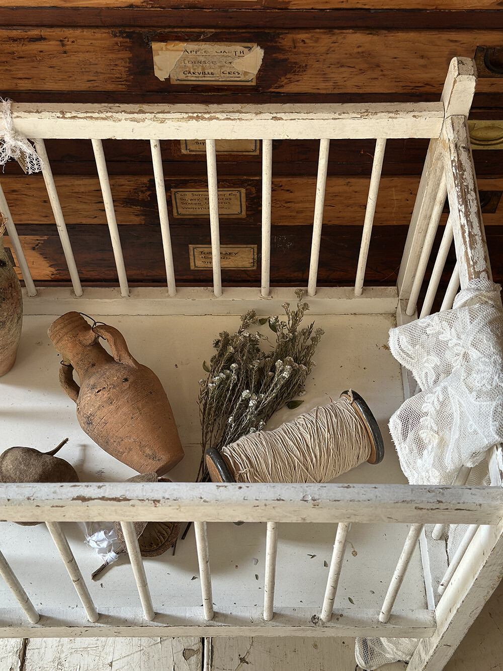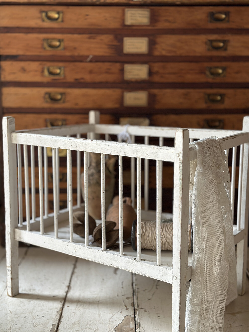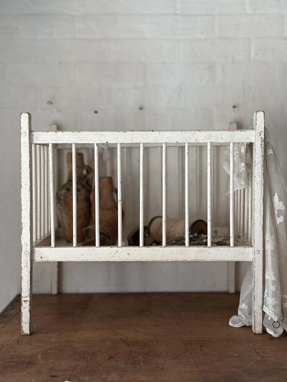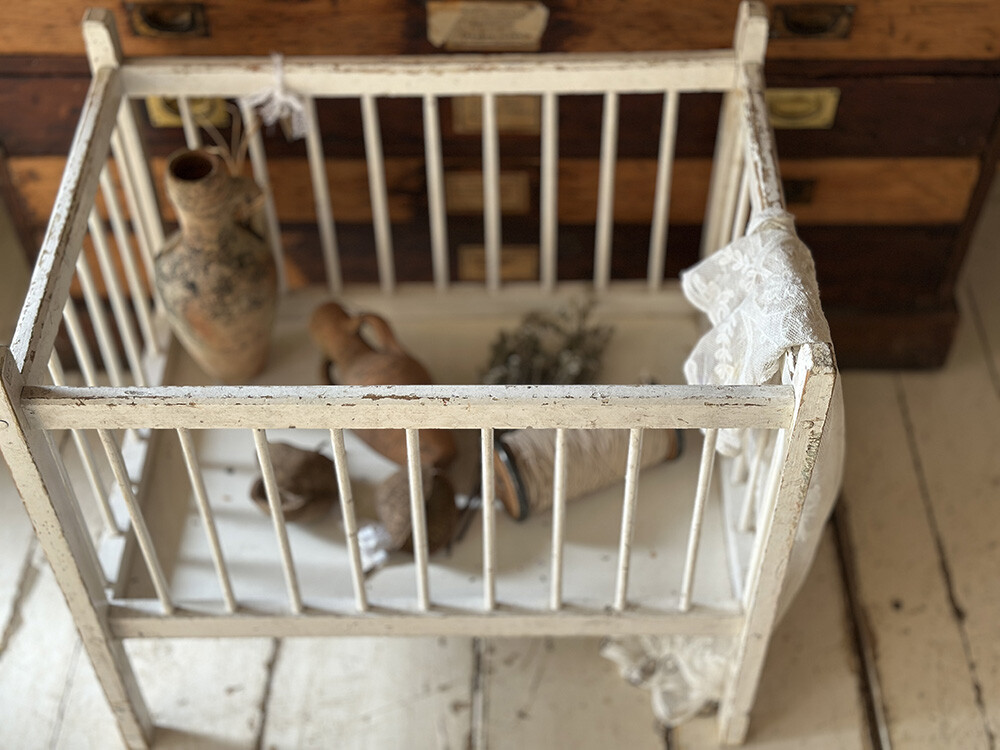 원목으로 제작된 프레임 위에 화이트 컬러의 쉐비 시크 페인팅이 더해져 있으며, 사방을 둘러싼 슬랫 구조로 이루어진 전형적인 소형 베이비 베드 형태를 가지고 있어요. 실제로는 아주 어린 아기를 위한 용도였거나, 혹은 인형을 위한 돌 콧으로 사용되었을 가능성이 높은 구조입니다. 표면 곳곳에는 페인트가 자연스럽게 마모되며 드러난 원목과 사용 흔적이 고르게 남아 있어, 오랜 시간의 흐름이 만들어낸 파티나가 잘 느껴집니다. 패브릭이나 소형 소품을 담아 두는 디스플레이 용도로 활용해도 충분히 매력적인 피스예요.