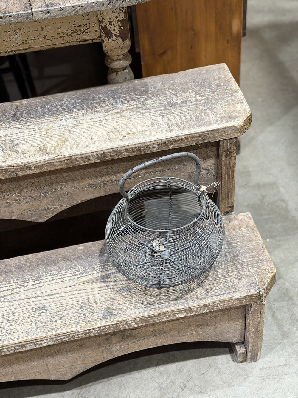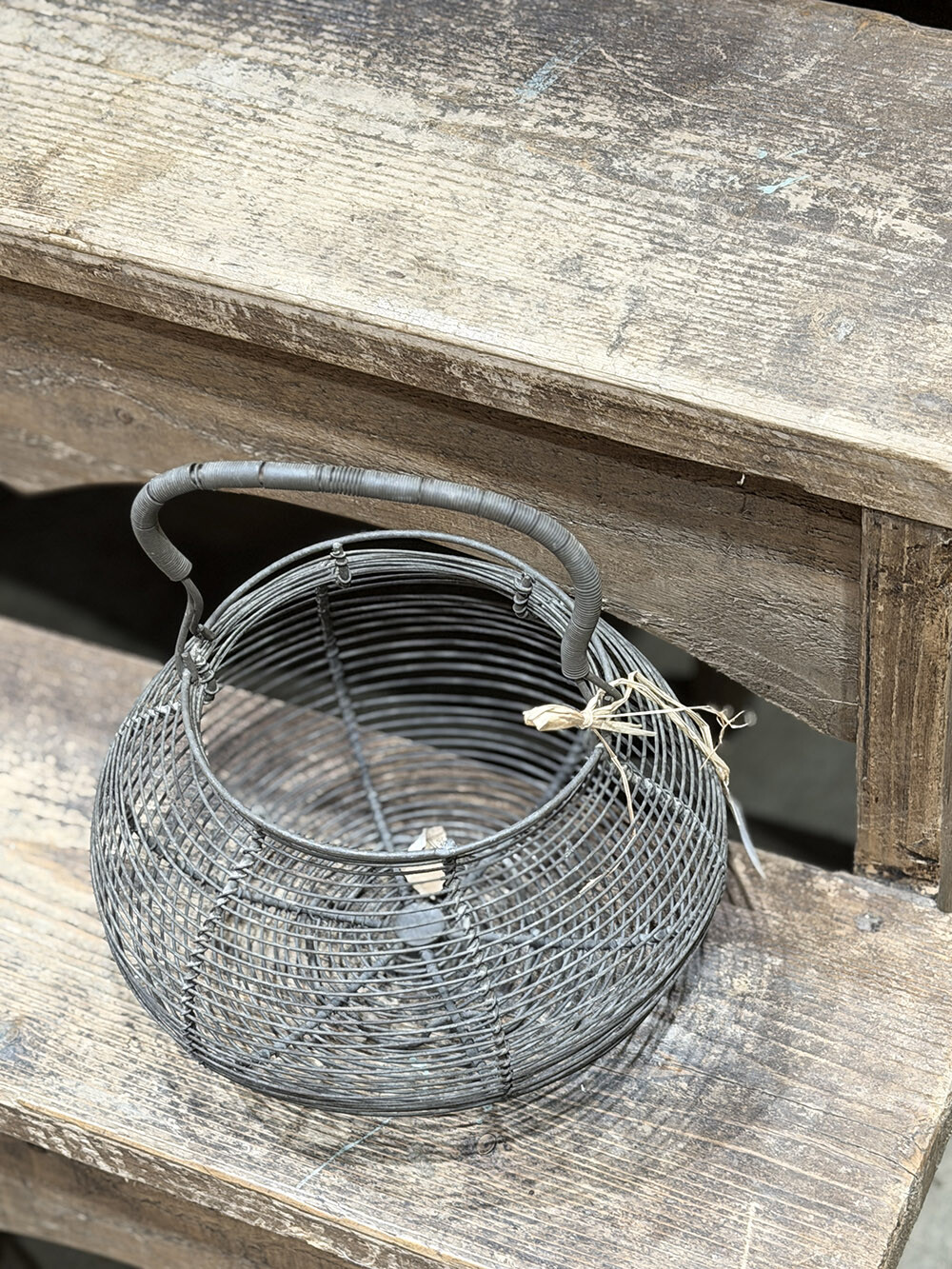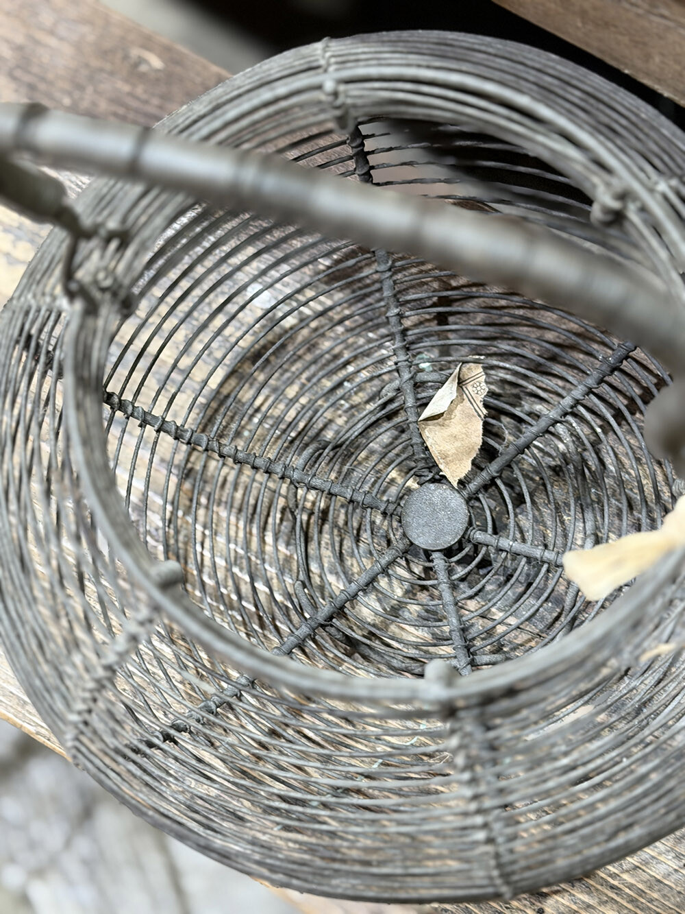 빈티지 와이어 메쉬 바스켓으로, 철 와이어를 촘촘하게 엮어 둥근 형태로 제작된 실용적인 바구니입니다. 계란을 담아두거나 소량의 채소, 허브, 꽃 등을 수확해 옮기던 용도로 사용되던 타입으로, 바닥이 살짝 떠 있는 구조와 손잡이의 균형이 기능적으로도 잘 짜여 있죠. 긴 시간이 흐르면서 생성된 철 특유의 파티나가 분명하게 드러나며 시간의 층위를 느끼게 합니다.