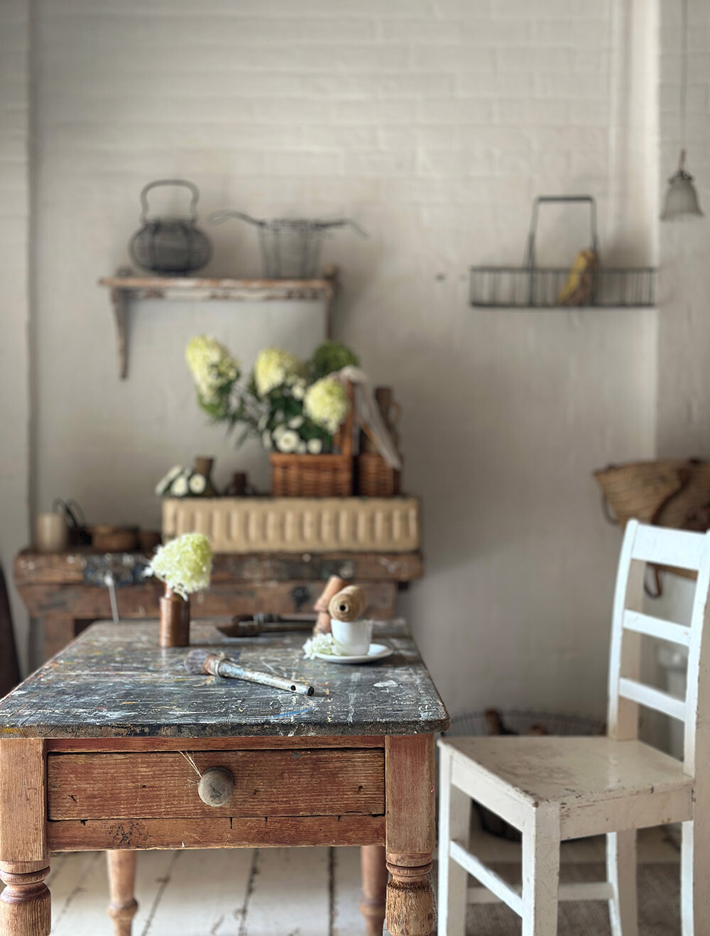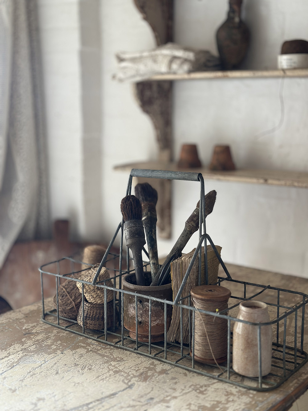 빈티지 와이어 밀크 딜리버리 바스켓으로, 영국에서 우유를 배달할 때 사용되던 실용적인 운반 도구입니다. 철선으로 엮어 만든 구조와 상단의 핸들은 이동과 적재를 전제로 한 형태로, 단순하지만 목적에 충실한 디자인이 특징이죠. 여러 병을 안정적으로 담아 이동하기 위해 구획감 있게 나뉜 구조 역시 이 바스켓의 쓰임을 잘 보여줍니다.