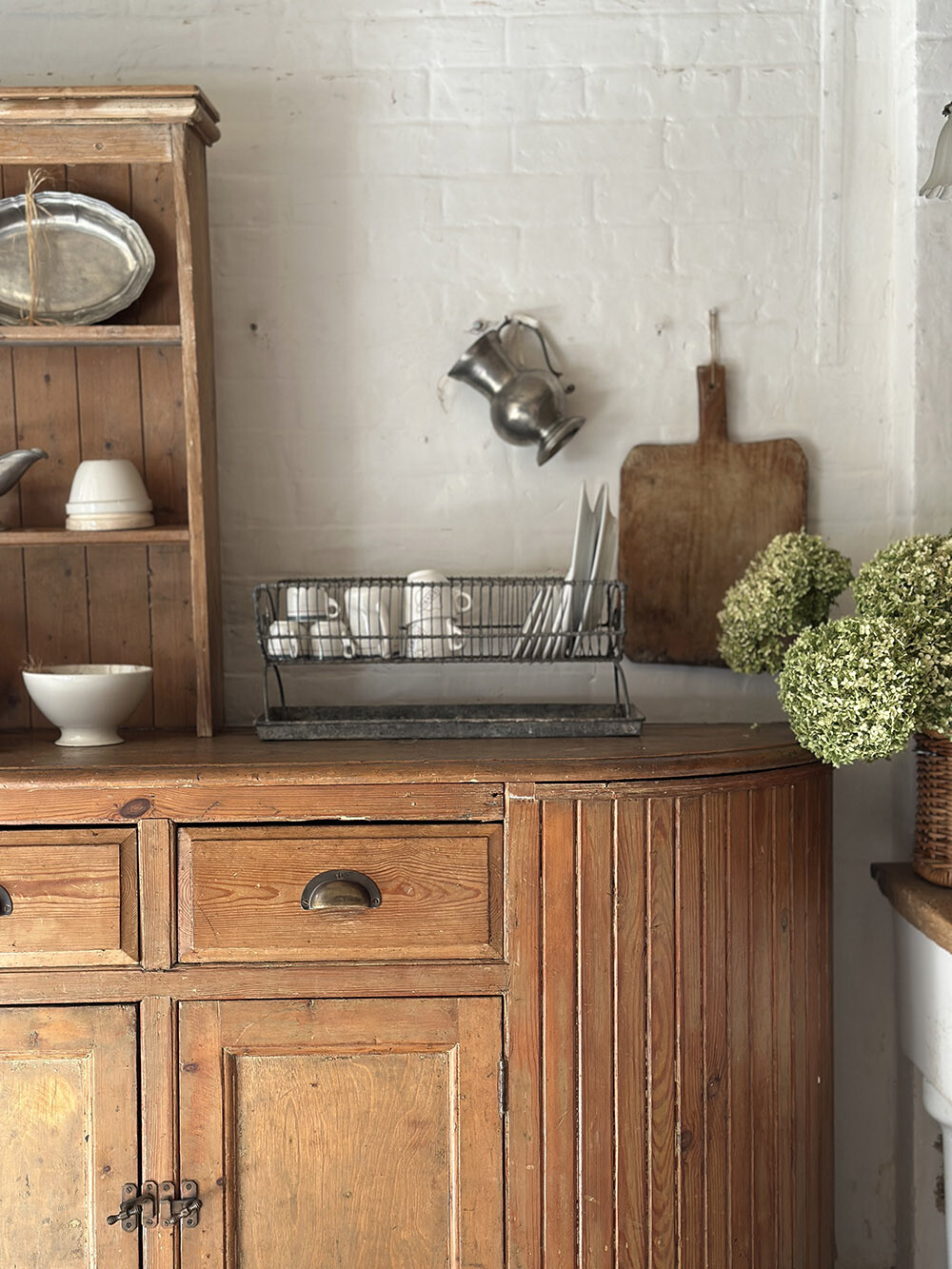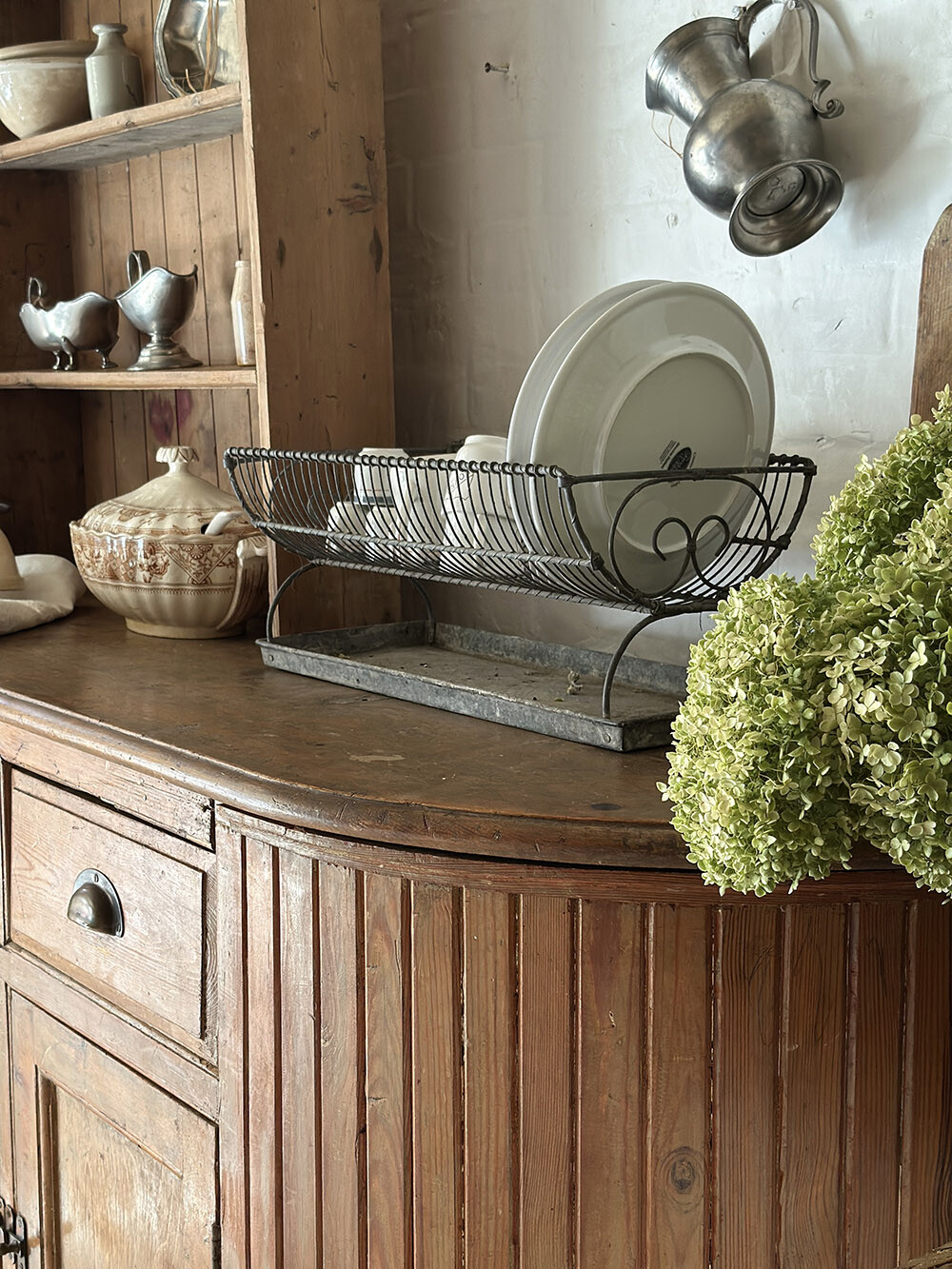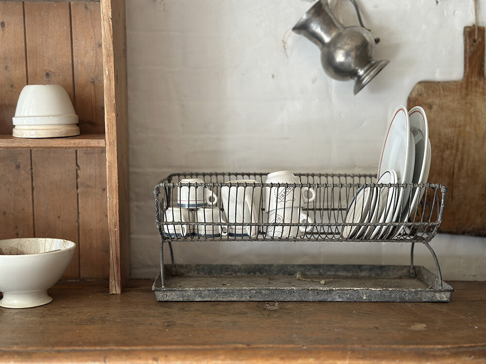 프렌치 징크 특유의 묵직한 질감이 잘 살아 있는 플레이트 랙입니다. 비교적 두텁게 사용된 징크 소재로 만들어져 안정감이 느껴지며, 구조 자체도 단단하게 잡혀 있어 실사용을 염두에 둔 오브제라는 점이 자연스럽게 전해집니다. 선반 위에 올려 두는 것만으로도 공간에 프렌치 키친 특유의 분위기를 만들어주는 아이템이죠.