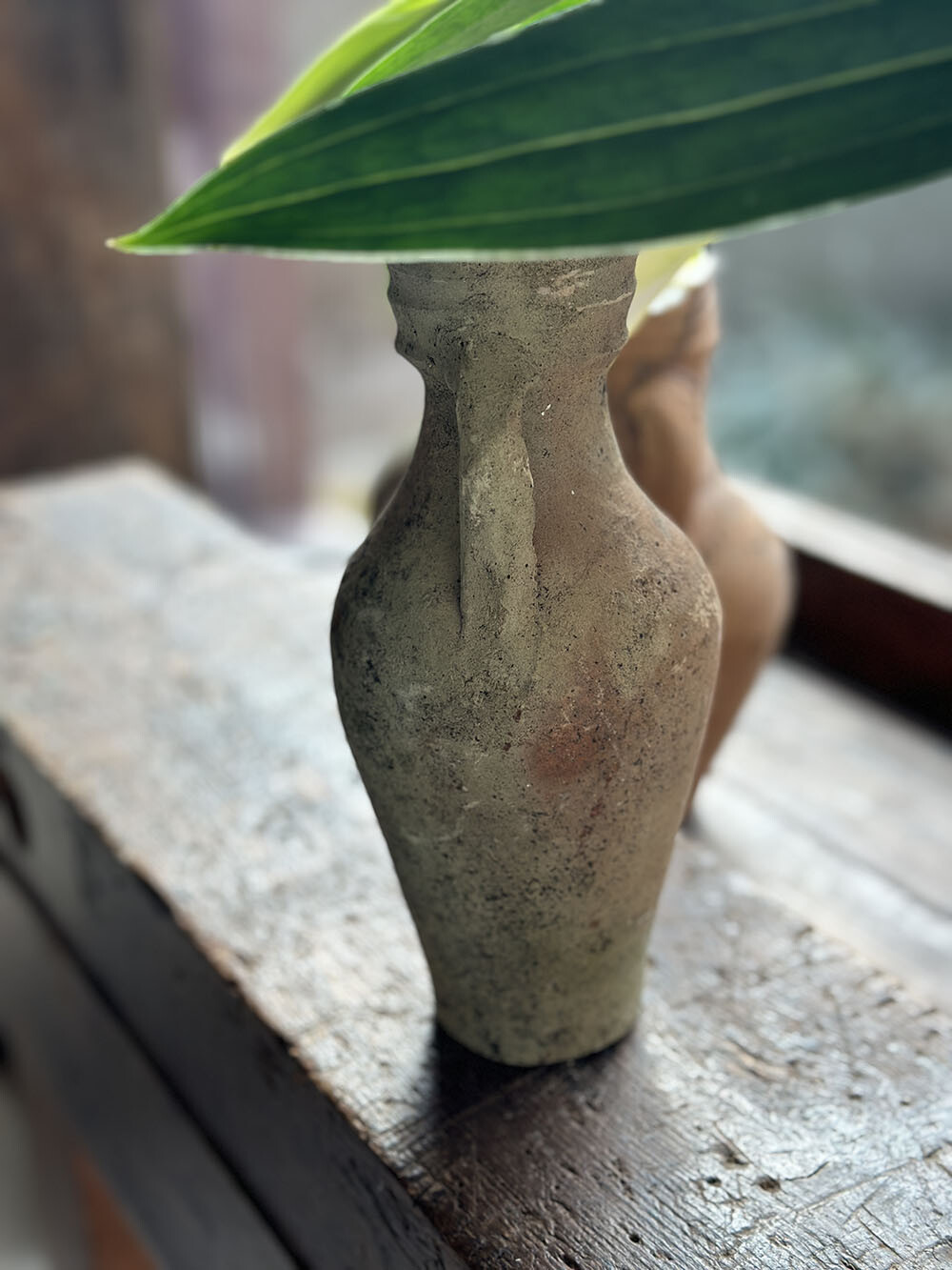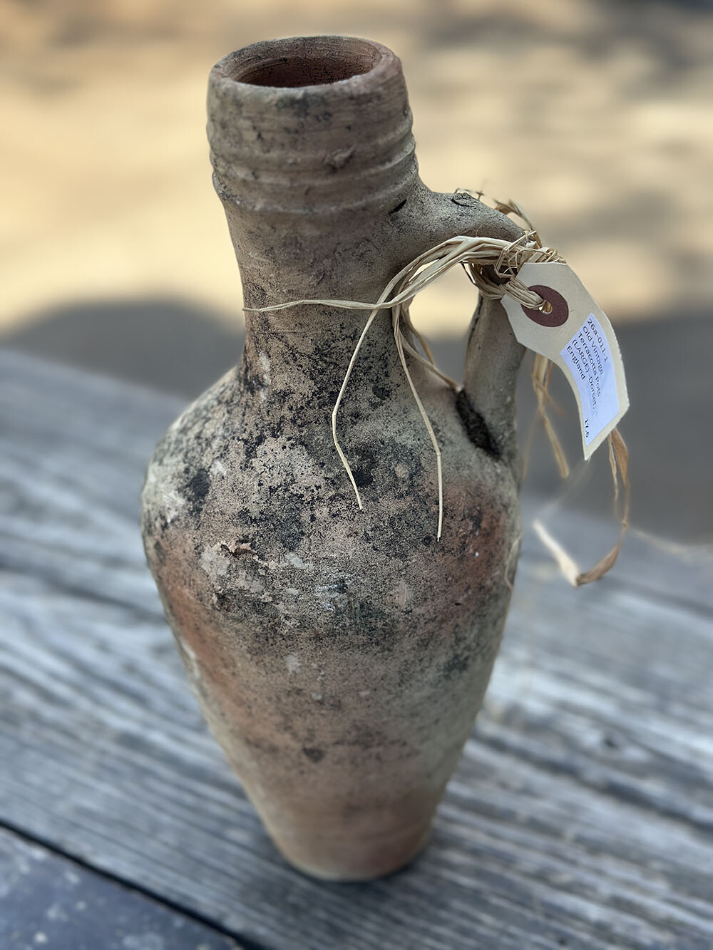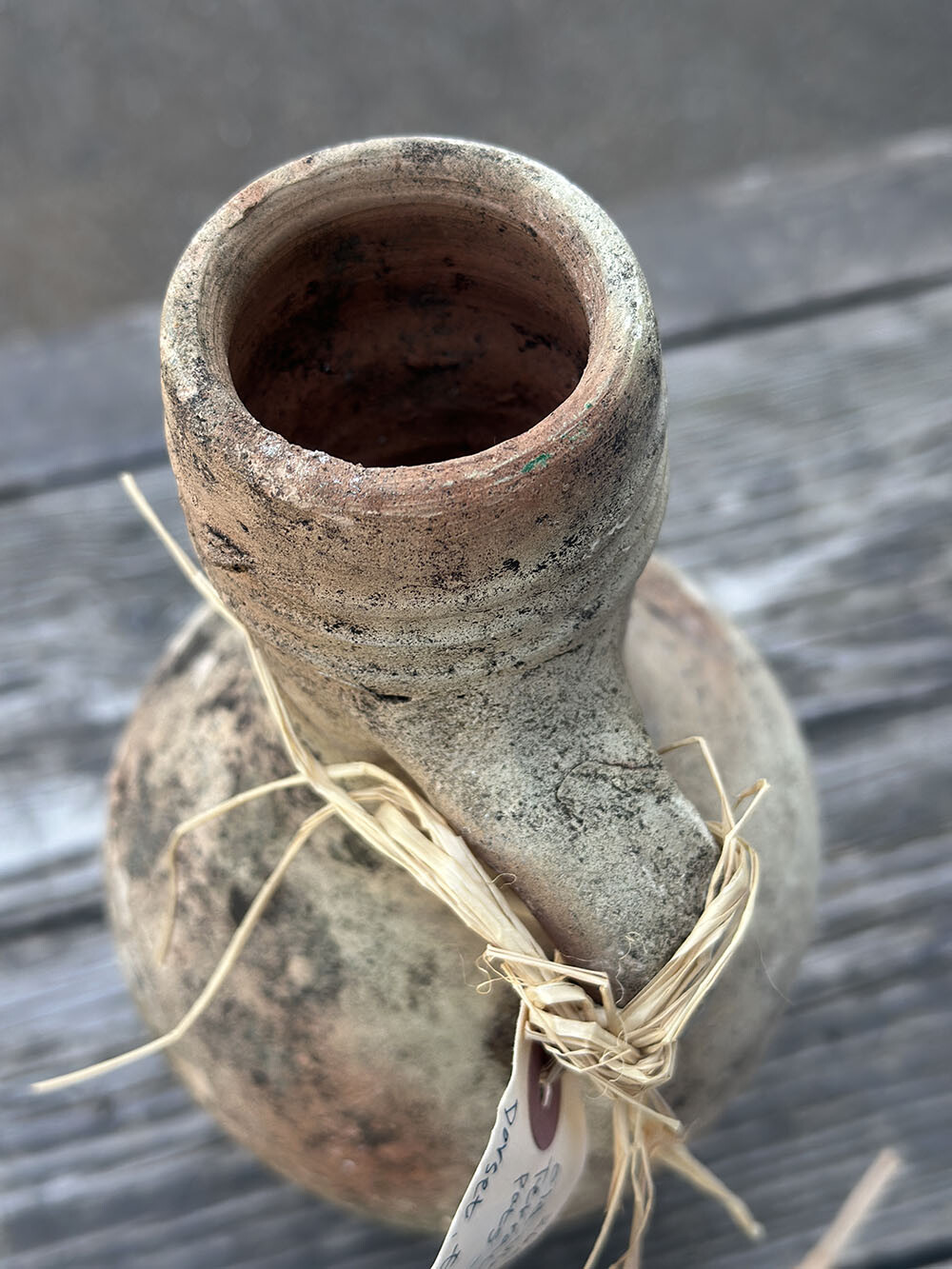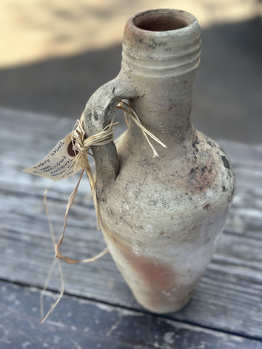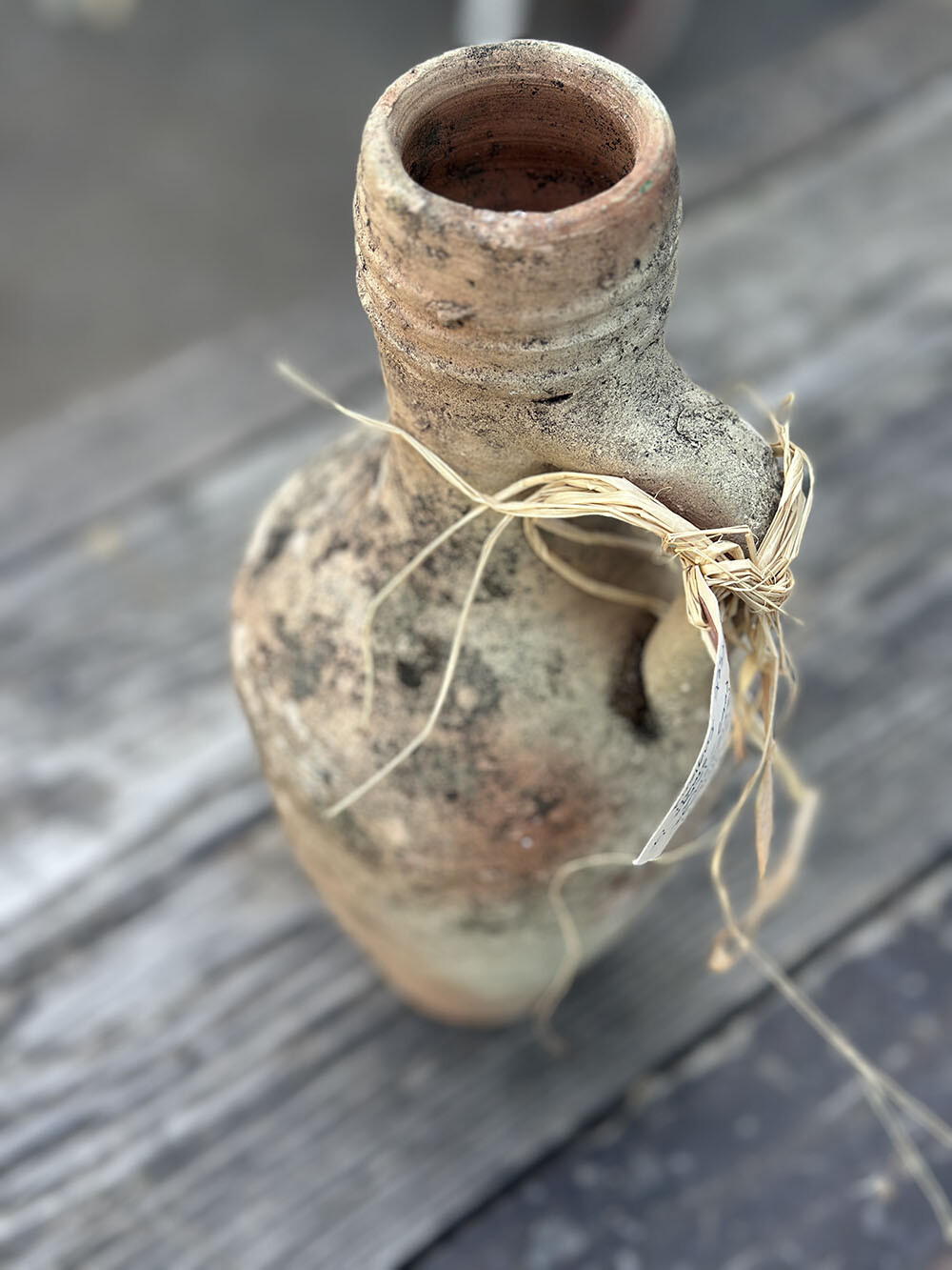 손에 쥐었을 때 가장 먼저 느껴지는 건 표면의 거친 입자감과 건조하게 올라온 흙의 질감입니다. 유약을 입히지 않은 테라코타 특유의 숨 쉬는 표면 위로, 오랜 시간 외부 환경을 지나오며 축적된 얼룩과 변색이 자연스럽게 겹겹이 쌓여 있습니다. 좁게 올라간 넥과 한쪽에 붙은 핸들 구조는 운반과 사용을 전제로 한 실용적인 형태이고, 입구 주변의 링 형태 마감은 마개나 천으로 입구를 막아 쓰던 흔적을 짐작하게 하죠.