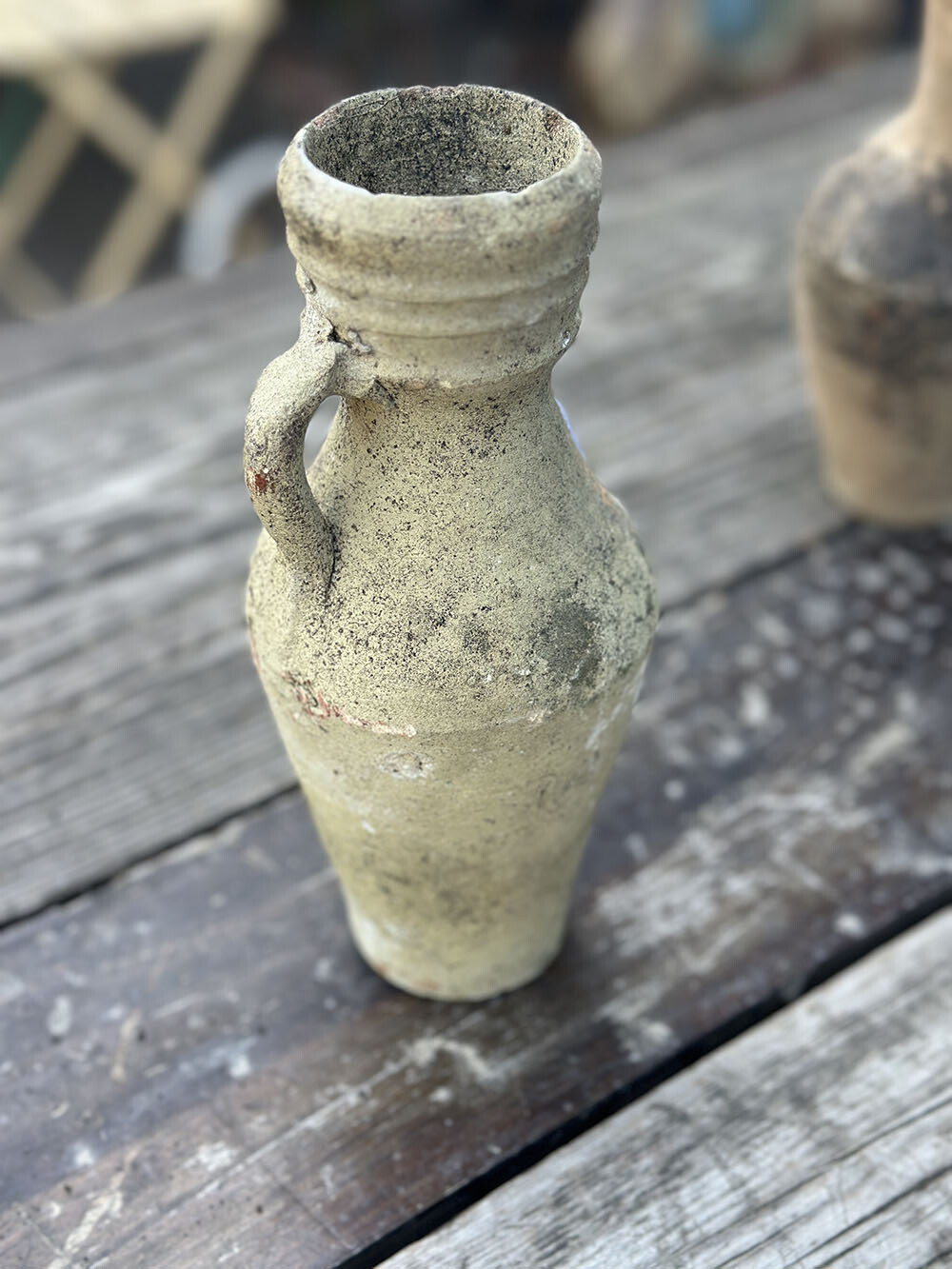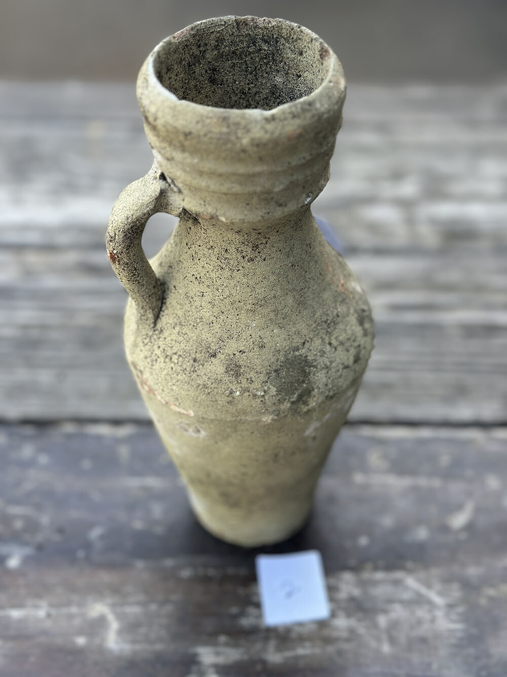손에 쥐었을 때 가장 먼저 느껴지는 건 표면의 거친 입자감과 건조하게 올라온 흙의 질감입니다. 유약을 입히지 않은 테라코타 특유의 숨 쉬는 표면 위로, 오랜 시간 외부 환경을 지나오며 축적된 얼룩과 변색이 자연스럽게 겹겹이 쌓여 있습니다. 좁게 올라간 넥과 한쪽에 붙은 핸들 구조는 운반과 사용을 전제로 한 실용적인 형태이고, 입구 주변의 링 형태 마감은 마개나 천으로 입구를 막아 쓰던 흔적을 짐작하게 하죠.