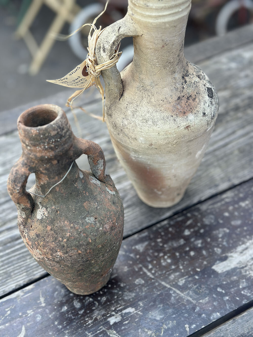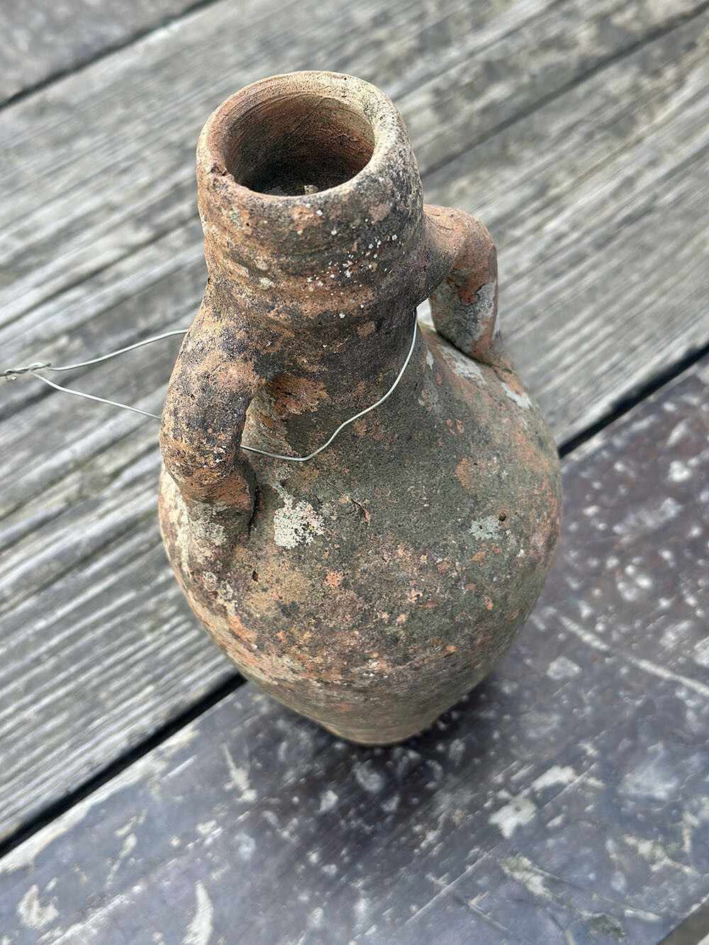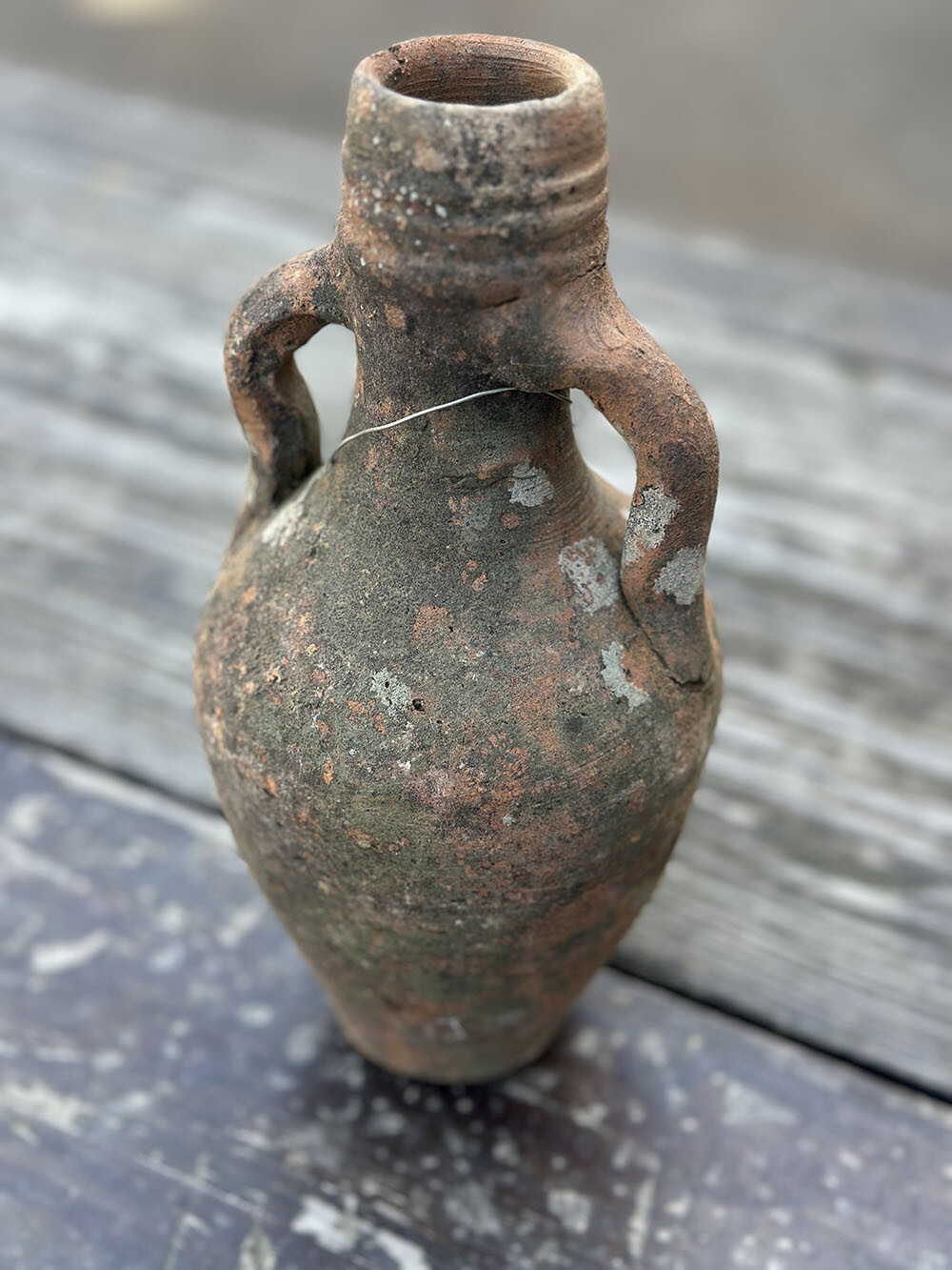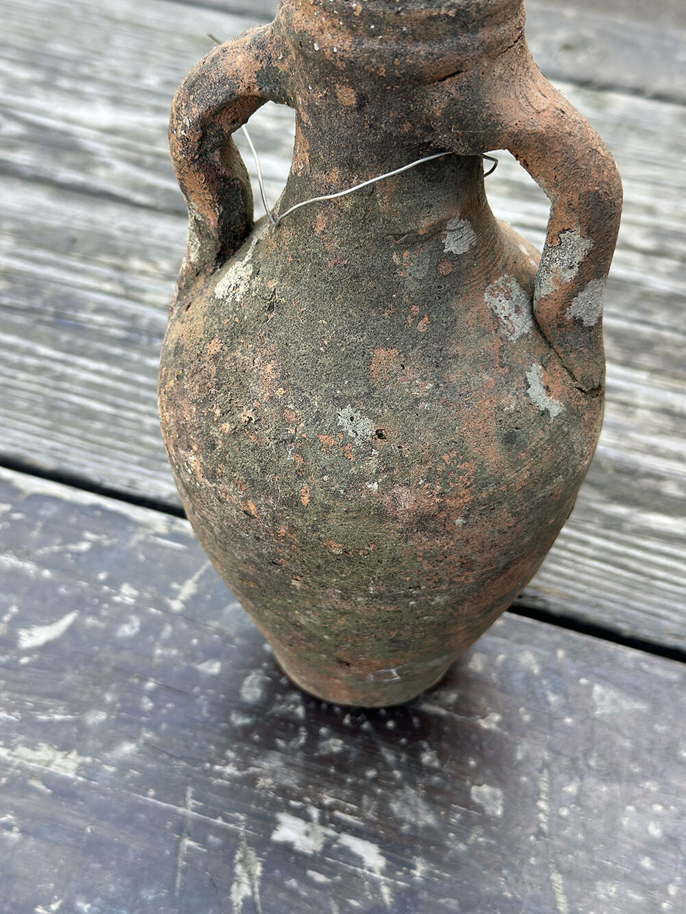 손에 쥐었을 때 가장 먼저 느껴지는 건 표면의 거친 입자감과 건조하게 올라온 흙의 질감입니다. 유약을 입히지 않은 테라코타 특유의 숨 쉬는 표면 위로, 오랜 시간 외부 환경을 지나오며 축적된 얼룩과 변색이 자연스럽게 겹겹이 쌓여 있습니다. 좁게 올라간 넥과 한쪽에 붙은 핸들 구조는 운반과 사용을 전제로 한 실용적인 형태이고, 입구 주변의 링 형태 마감은 마개나 천으로 입구를 막아 쓰던 흔적을 짐작하게 하죠.