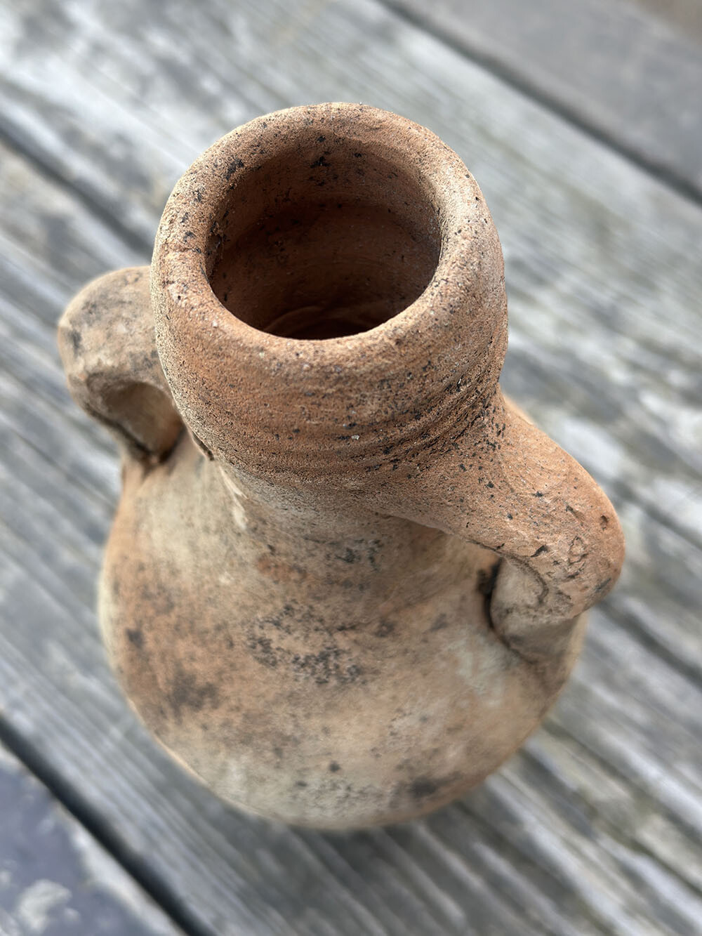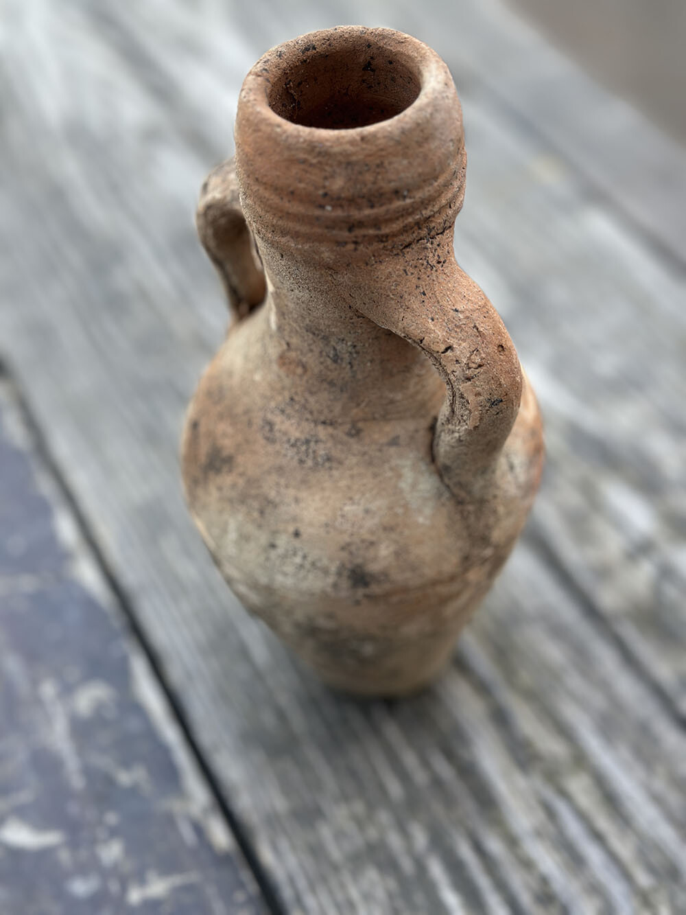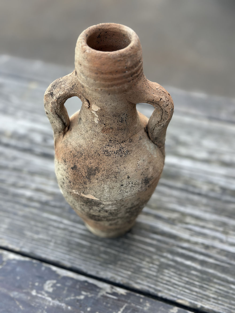 손에 쥐었을 때 가장 먼저 느껴지는 건 표면의 거친 입자감과 건조하게 올라온 흙의 질감입니다. 유약을 입히지 않은 테라코타 특유의 숨 쉬는 표면 위로, 오랜 시간 외부 환경을 지나오며 축적된 얼룩과 변색이 자연스럽게 겹겹이 쌓여 있습니다. 좁게 올라간 넥과 한쪽에 붙은 핸들 구조는 운반과 사용을 전제로 한 실용적인 형태이고, 입구 주변의 링 형태 마감은 마개나 천으로 입구를 막아 쓰던 흔적을 짐작하게 하죠.