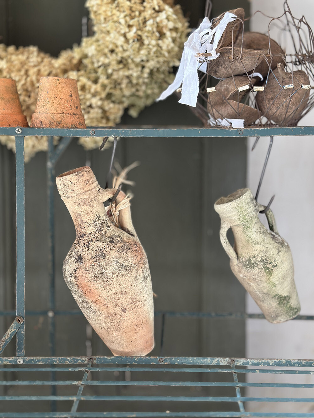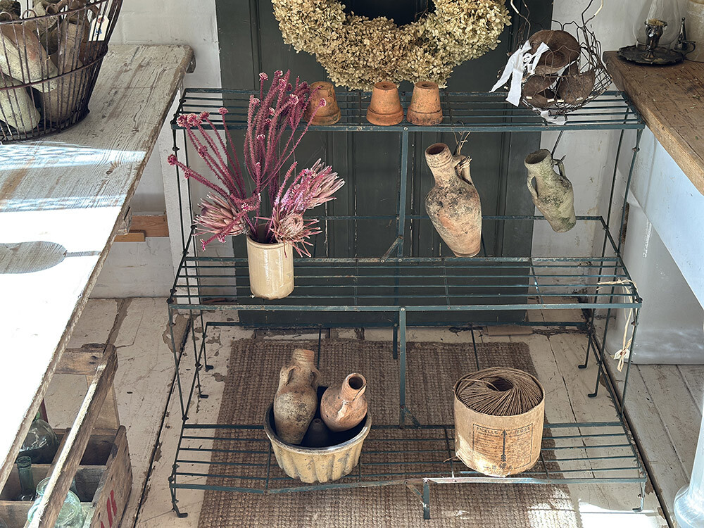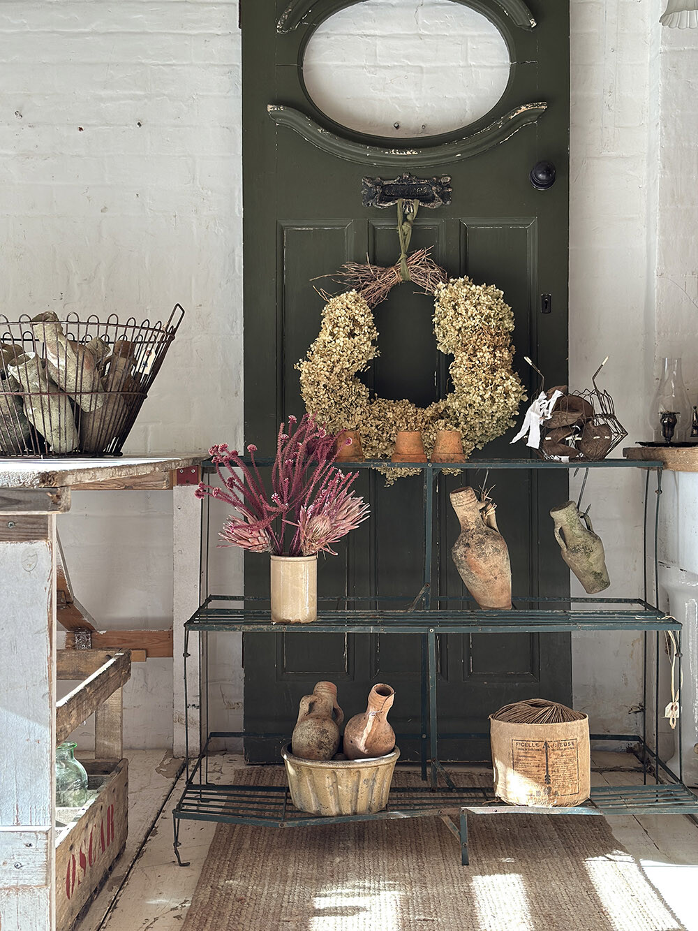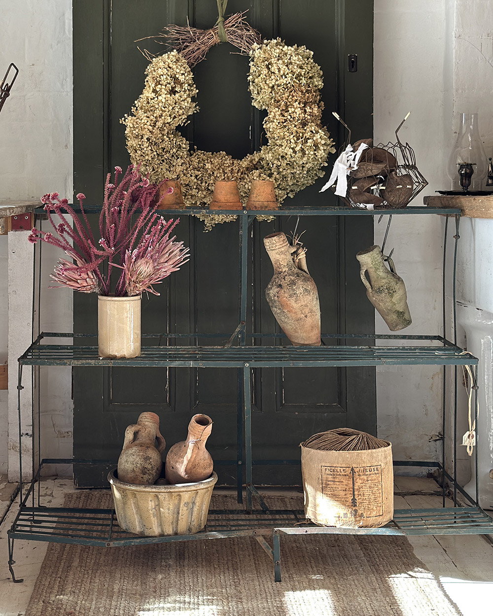 컬러는 깊이감 있는 잉글리쉬 그린으로 마감되어 있어, 식물과 자연스럽게 어우러지면서도 공간에 차분한 포인트를 만들어줍니다. 시간이 지나며 생긴 미세한 변색과 표면의 흔적들이 더해져 단순한 철제 구조를 넘어서는 분위기를 만들어내고 있고, 가든 스탠드로는 물론 다양한 오브제를 올려두는 디스플레이 선반으로도 활용도가 높은 아이템입니다.