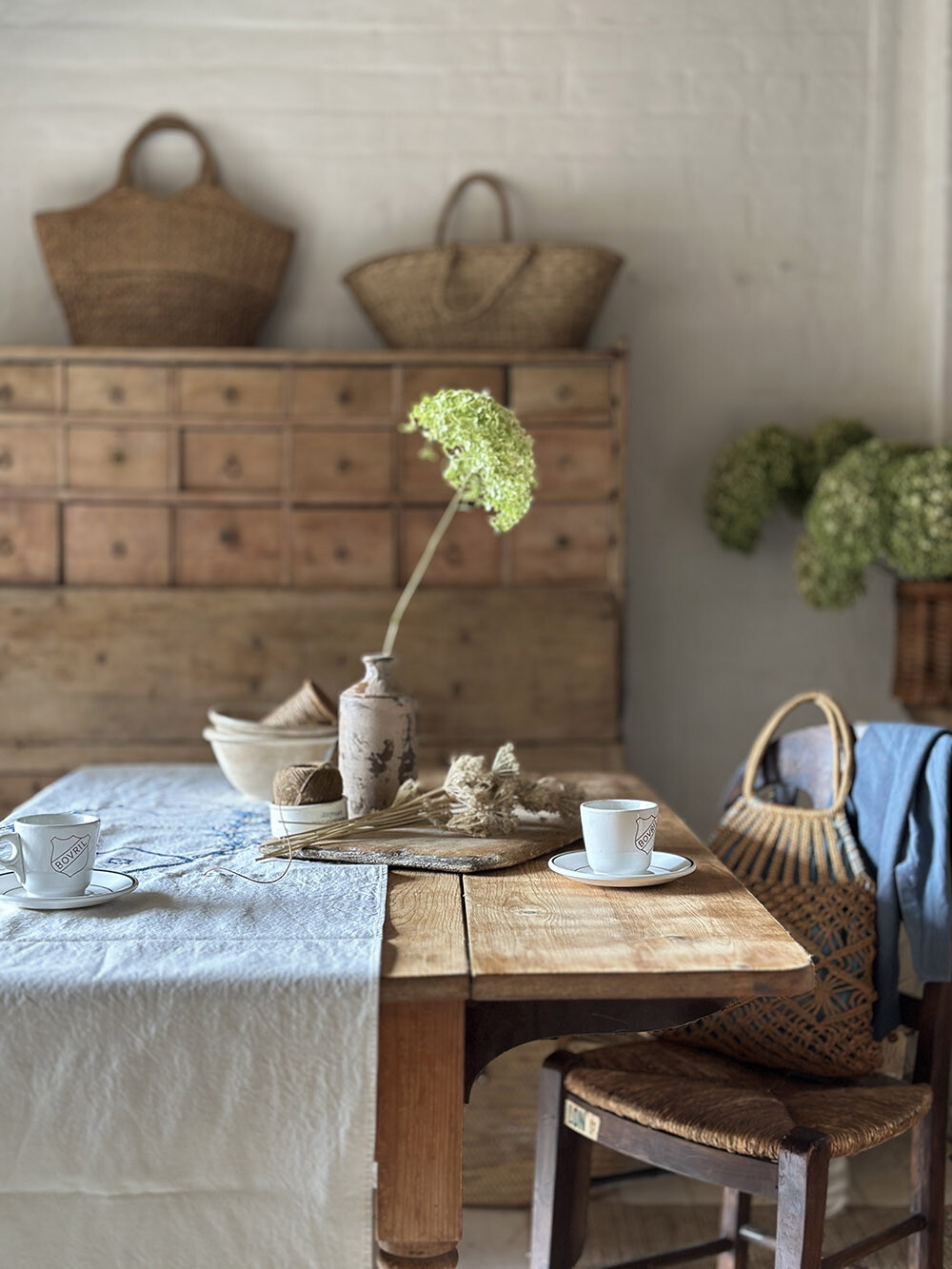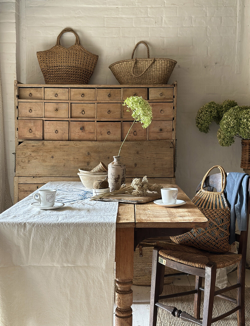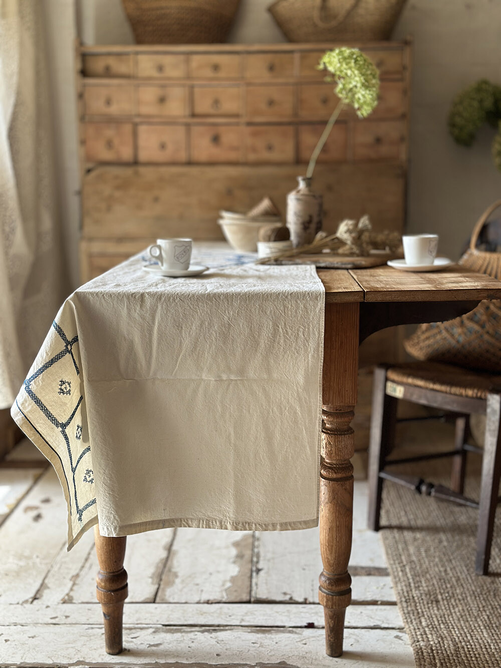 프렌치 리넨으로 제작된 빈티지 테이블 러너로, 여유 있게 떨어지는 길감이 인상적인 피스입니다. 약 230cm 이상의 길이를 가지고 있어 일반적인 다이닝 테이블은 물론, 보다 긴 테이블에도 자연스럽게 대응할 수 있는 사이즈를 갖추고 있습니다. 테이블 위에 단정하게 펼쳐 두기만 해도 공간의 분위기를 한층 안정감 있게 정리해주죠.