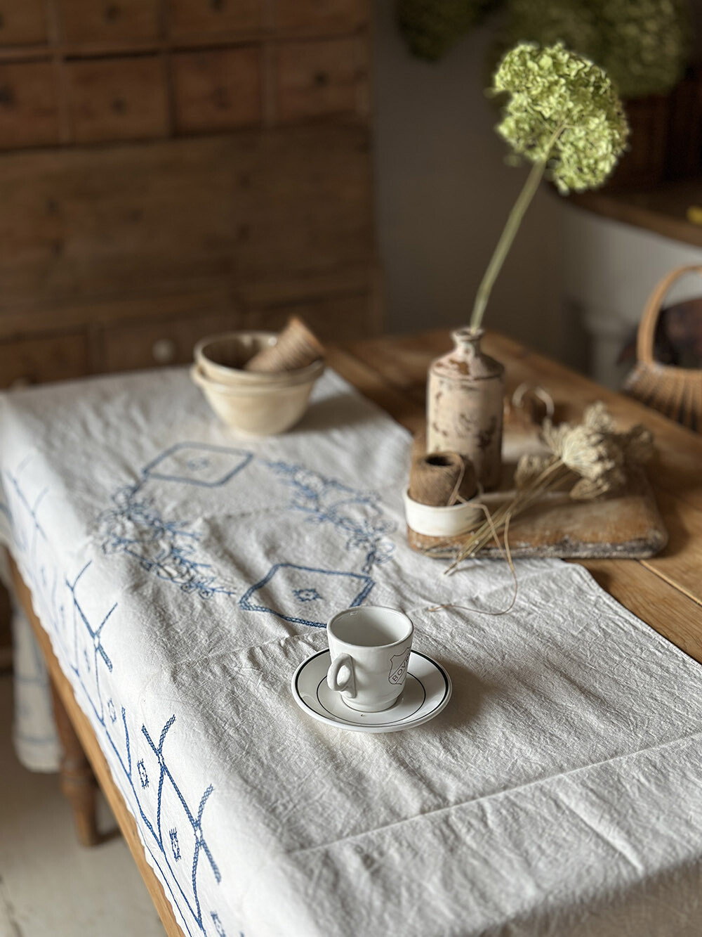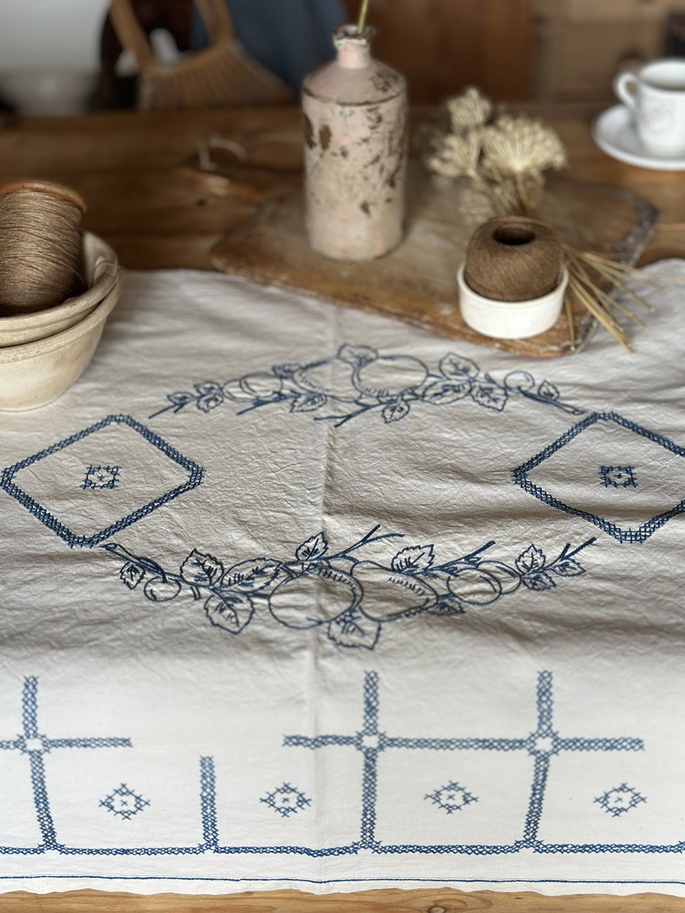 표면에는 블루 컬러의 자수가 더해져 있어, 과일과 기하 패턴이 은은하게 반복되며 리넨 특유의 담백한 질감 위에 섬세한 포인트를 만들어냅니다. 시간의 흐름을 지나오며 생긴 자연스러운 사용감과 리넨의 결이 어우러져, 단순한 패브릭을 넘어서는 깊이를 느끼게 해줍니다. 다양한 길이의 테이블에 유연하게 대응하면서, 공간에 차분한 리듬을 더해줍니다.