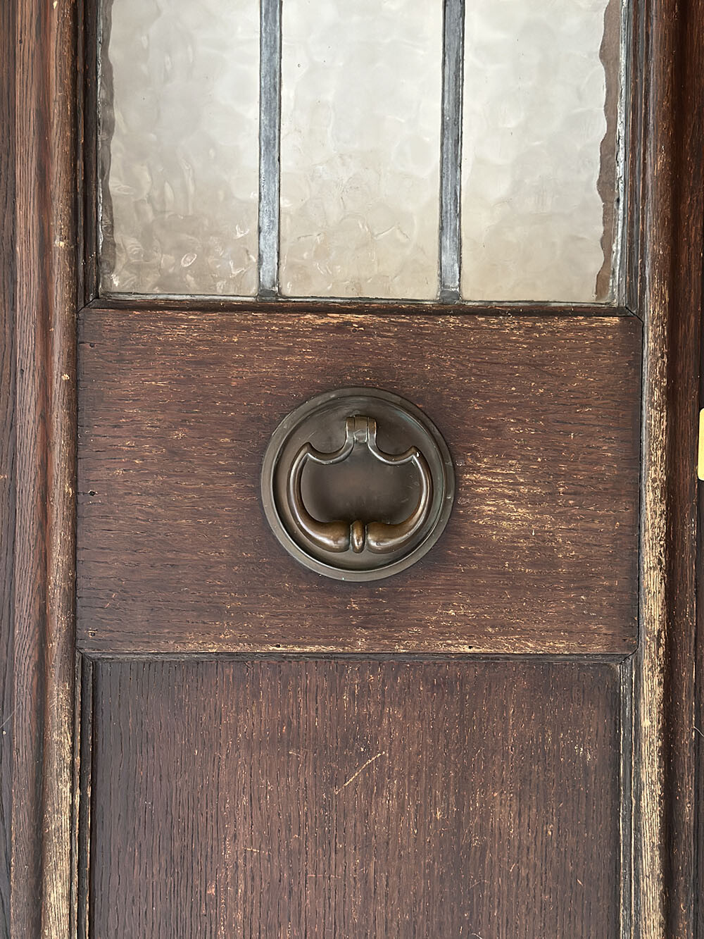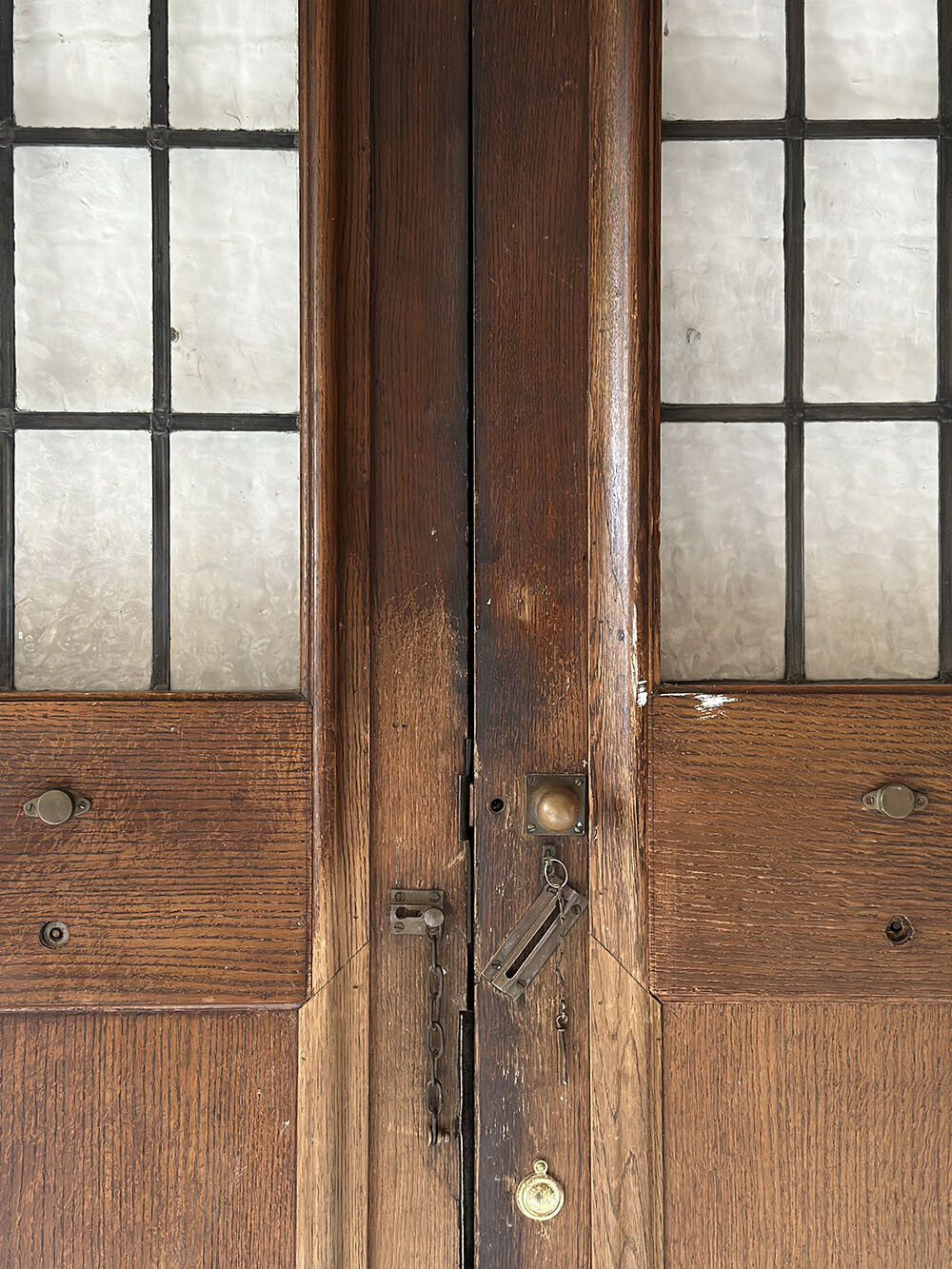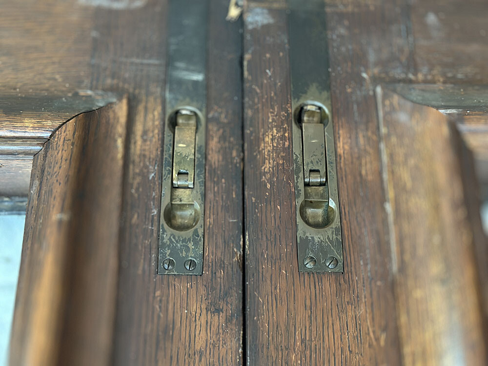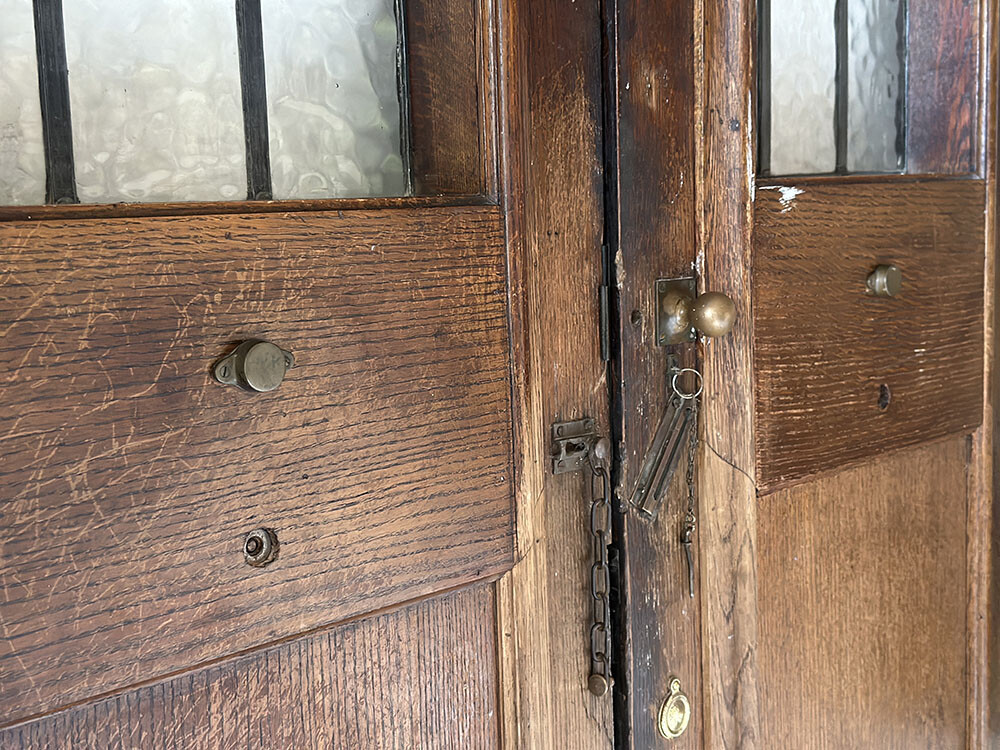무채색의 스테인드 글래스와 더불어 도어 양쪽에 달려 있는 도어 노커 등, 글래스와 하드웨어의 대부분이 오리지널 상태를 그대로 유지하고 있습니다. 스테인드 글래스에는 무늬유리를 사용했기 때문에, 어슴프레 안팎에서 사람의 움직임이나 사물의 형태를 인지할 수 있다는 장점이 있죠. 유리가 없거나, 안팎에서 사람이 있는지 보이지 않는 도어의 경우 - 출입이 빈번하게 일어나는 곳에서는 충돌사고 위험이 높아집니다. 그래서 유리창이 있으면 좋은데, 무늬유리를 사용하면 안전하다는 장점은 유지하면서도 프라이버시를 지켜준다는 장점까지 챙길 수 있어서 선호도가 높은 편입니다. 도어의 내측은 바깥쪽에 비해서 색이 더 옅은 편인데, 역시 오리지널 하드웨어가 잘 유지되어 있습니다. 무쇠와 브라스 소재로 제작된 잠금쇠들이 여러 개 준비되어 있습니다. 그리고 특히나 더 좋은 점은 열쇠가 보전되어 있다는 점이죠.