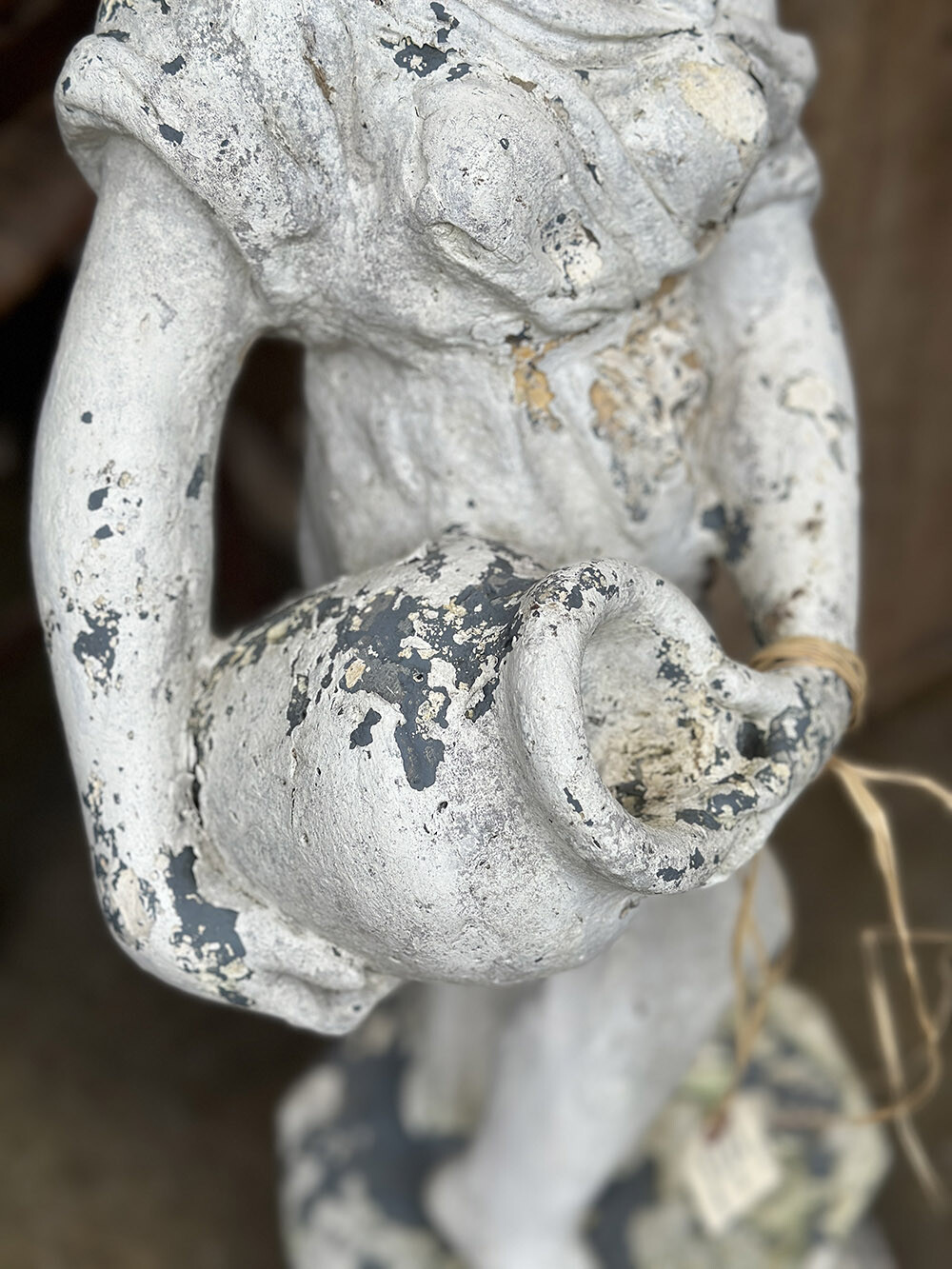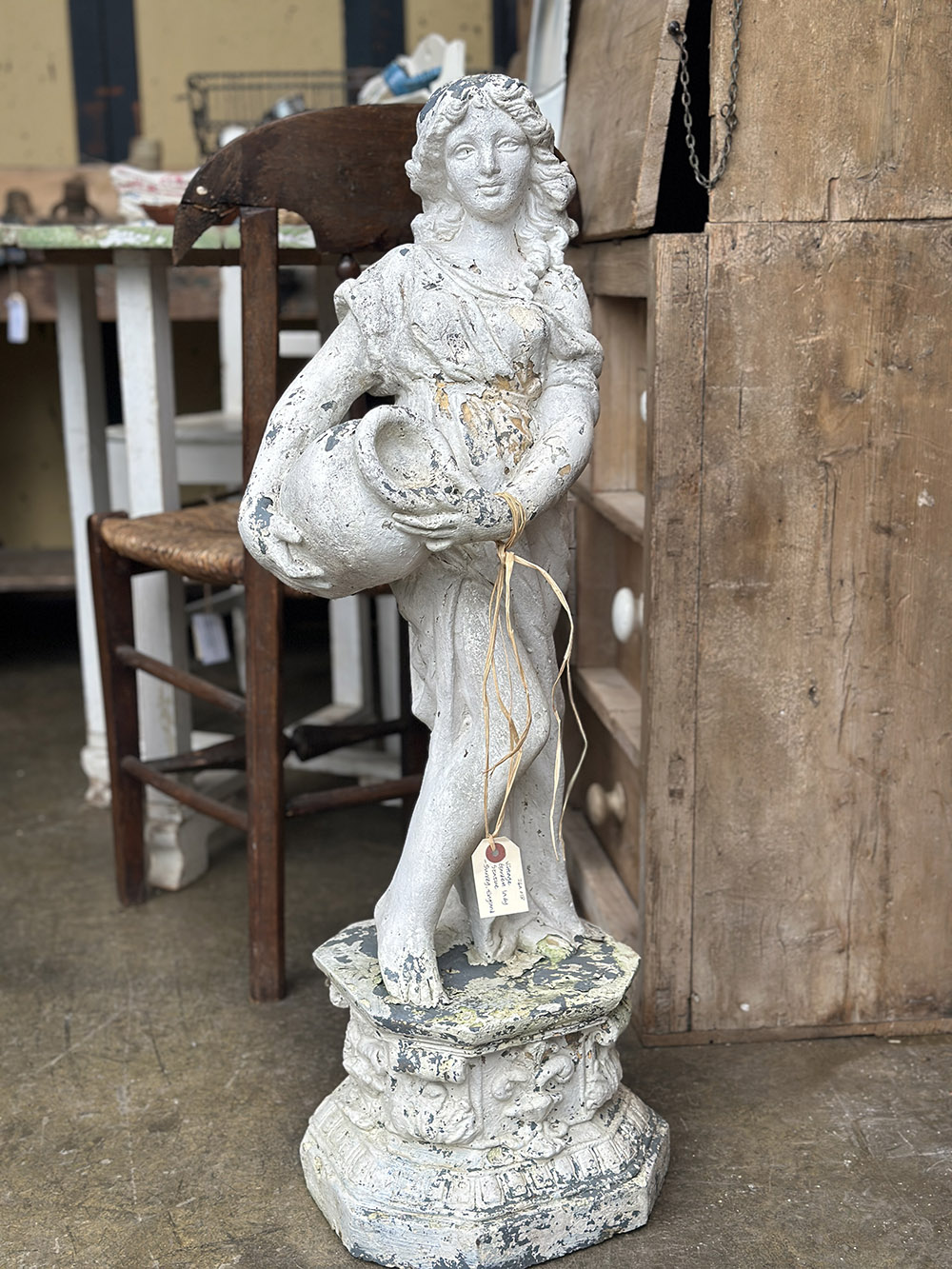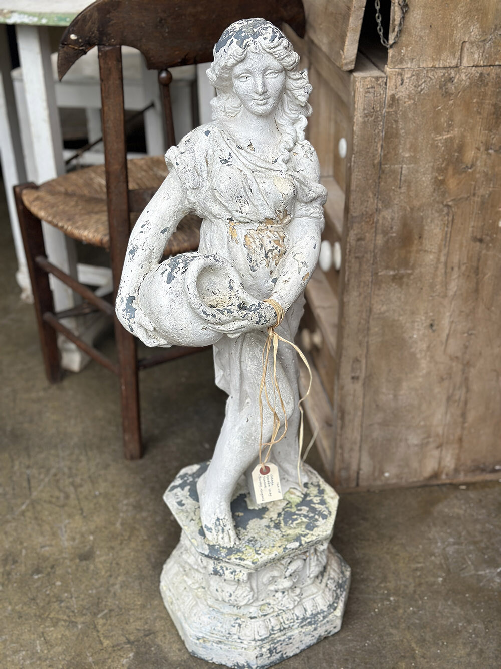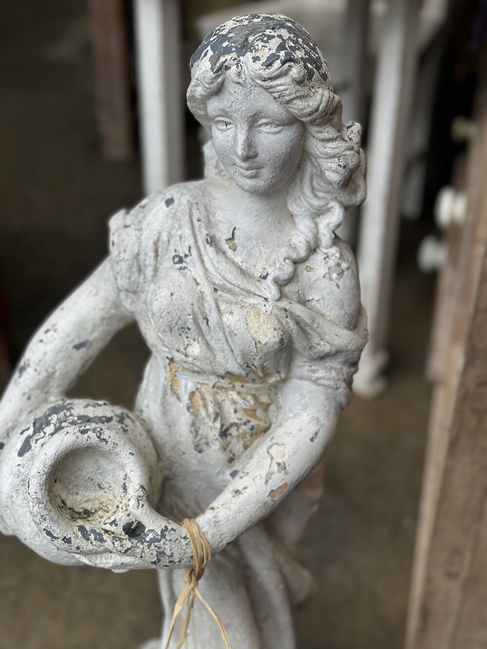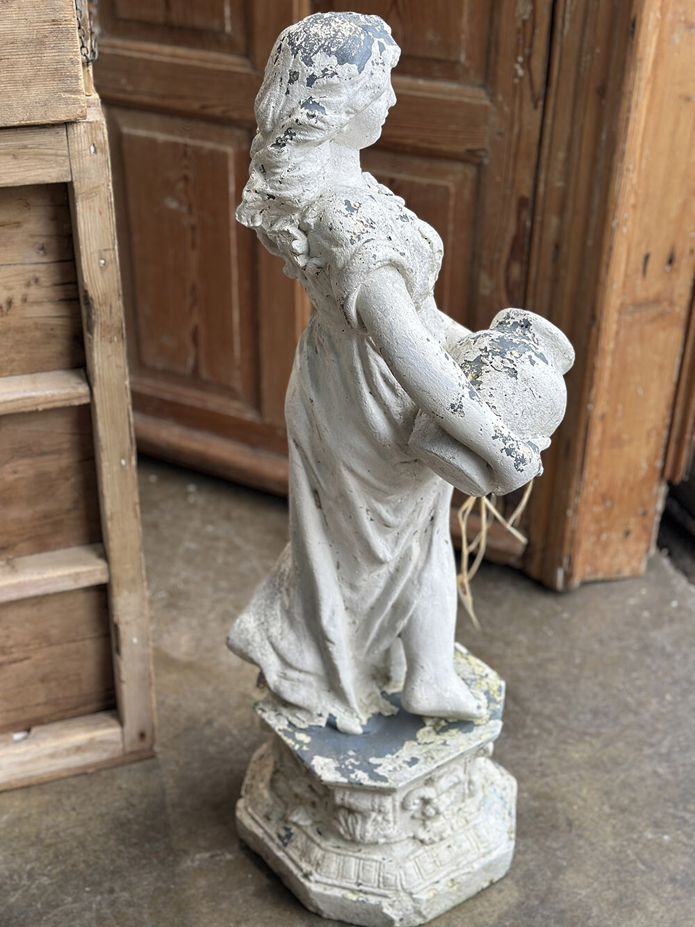 빈티지 가든 스테츄로, 로마–그리스 시대의 여인상을 연상시키는 신고전주의적 형상이 담긴 오브제입니다. 한 손에 항아리를 들고 있는 포즈와 유려하게 흐르는 드레이퍼리 표현이 특징으로, 단순한 장식물을 넘어 당시 미감과 조형 언어를 일상 공간 안으로 끌어오는 역할을 하죠. 하부 베이스까지 함께 구성되어 있어 독립적인 조형물로서의 안정감도 잘 갖추고 있습니다.