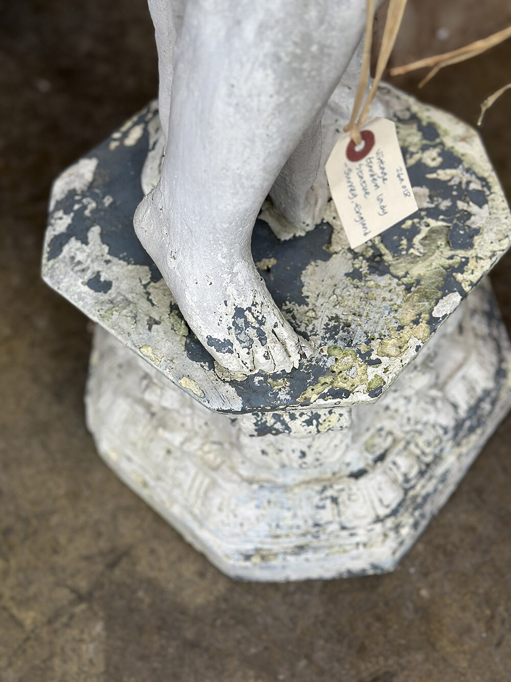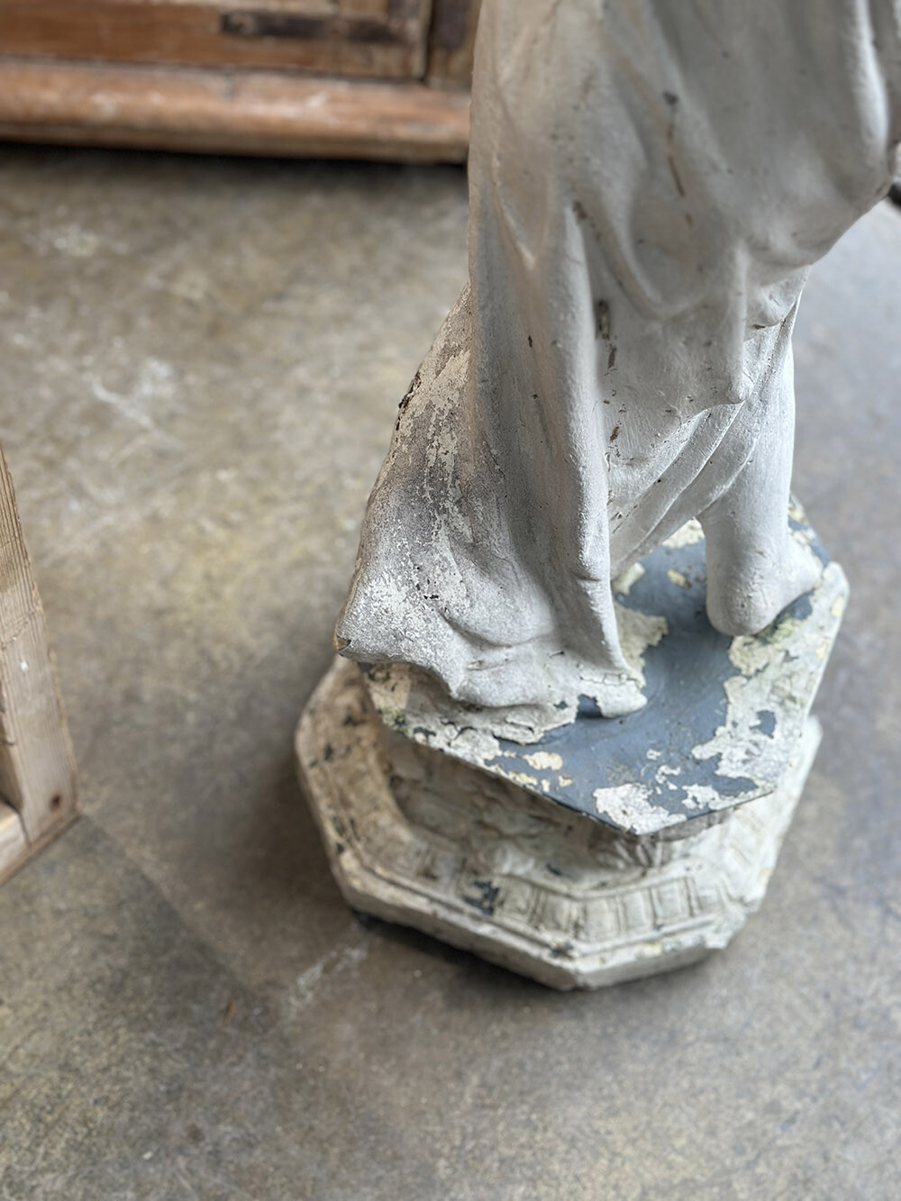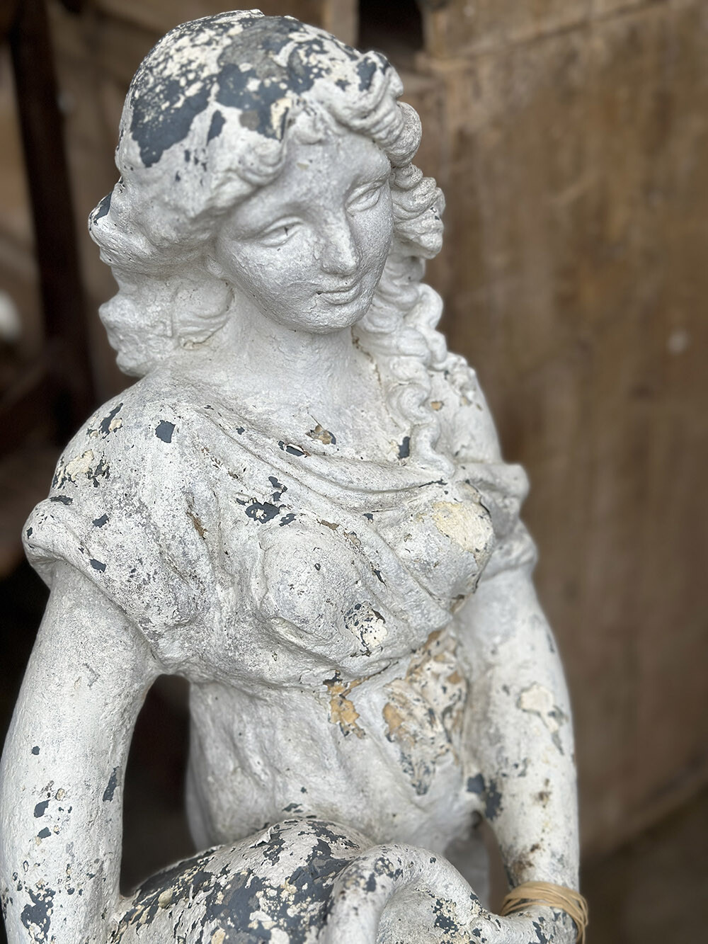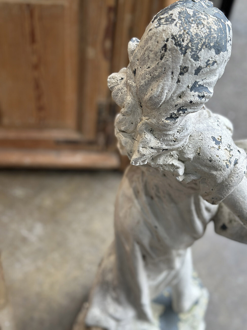 소재는 몰탈로 제작되었으며, 표면에는 여러 겹의 페인트가 덧입혀졌다가 시간이 지나며 자연스럽게 벗겨진 흔적들이 층층이 남아 있습니다. 그 아래로 드러나는 질감과 색의 변화가 만들어내는 깊은 파티나가 이 피스의 핵심적인 매력이라 할 수 있고, 실내는 물론 정원이나 테라스와 같은 외부 공간에서도 자연스럽게 녹아드는 존재감을 보여주죠. 시간이 만들어낸 표면의 풍경 자체가 하나의 완성된 미감으로 느껴지는 오브제입니다.