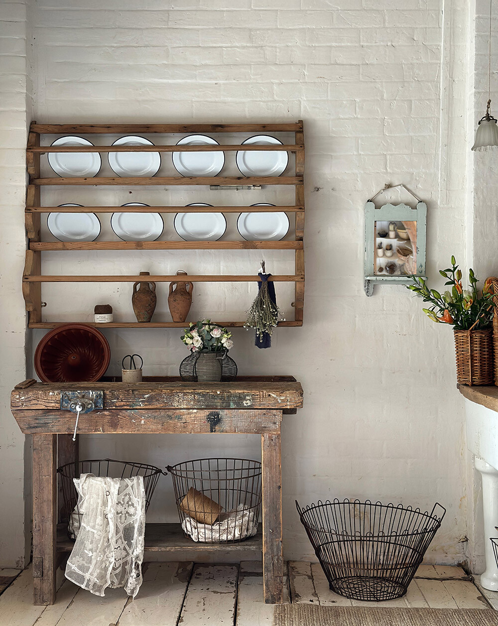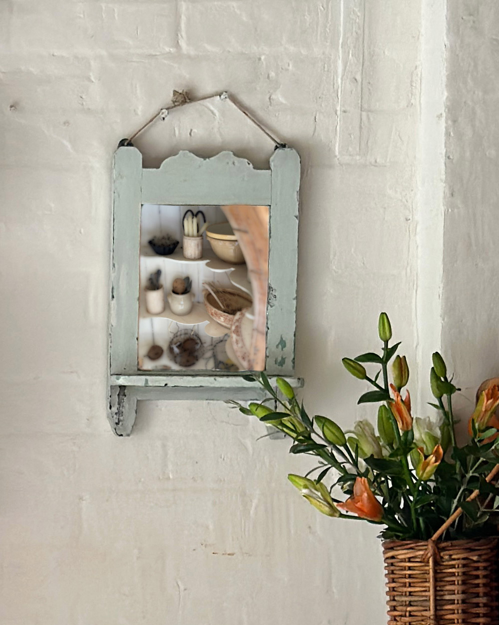 빈티지 월 행잉 미러로, 부드러운 민트 컬러 페인팅이 인상적인 피스입니다. 벽에 걸거나 기대어서 사용하는 구조로, 단순한 거울 이상의 역할을 하며 공간에 색감과 분위기를 더해주죠. 과하지 않은 컬러감이어서 다양한 공간에 자연스럽게 스며들면서도, 은은하게 시선을 끌어주는 존재감을 갖고 있습니다. 하단 부에는 선반이 마련되어 있어요.