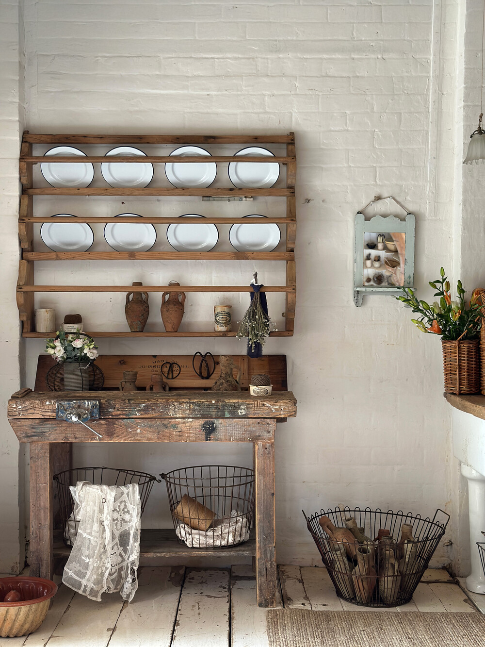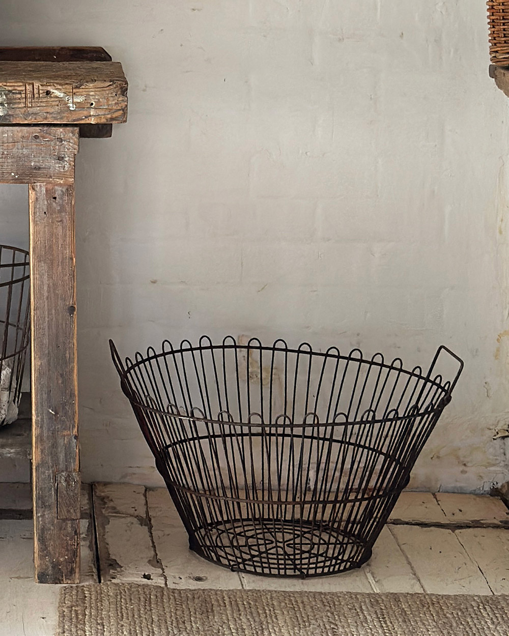 빈티지 와이어 메쉬 바스켓으로, 철선을 촘촘하게 엮어 만든 구조가 인상적인 피스입니다. 위로 갈수록 넓어지는 벌어진 형태와 양옆의 손잡이는 실사용을 전제로 한 디자인이면서도, 공간 안에서는 자연스럽게 볼륨감을 만들어주는 요소로 작용하죠. 시간의 흐름 속에서 형성된 금속 표면의 산화와 어두운 색감은 깊이 있는 파티나로 남아 있으며, 담아두는 물건에 따라 분위기가 달라지는 유연한 오브제로 활용하기 좋습니다.