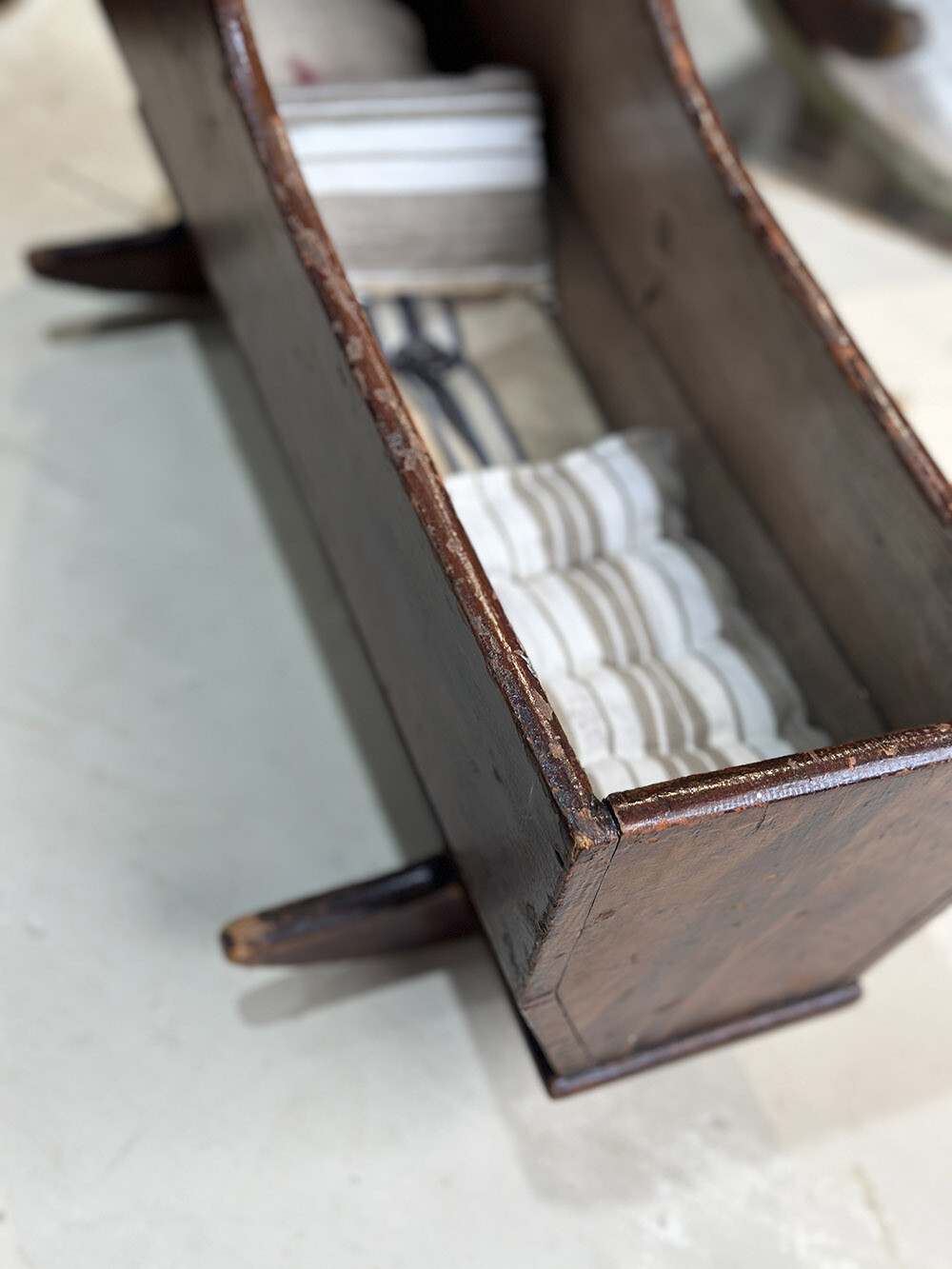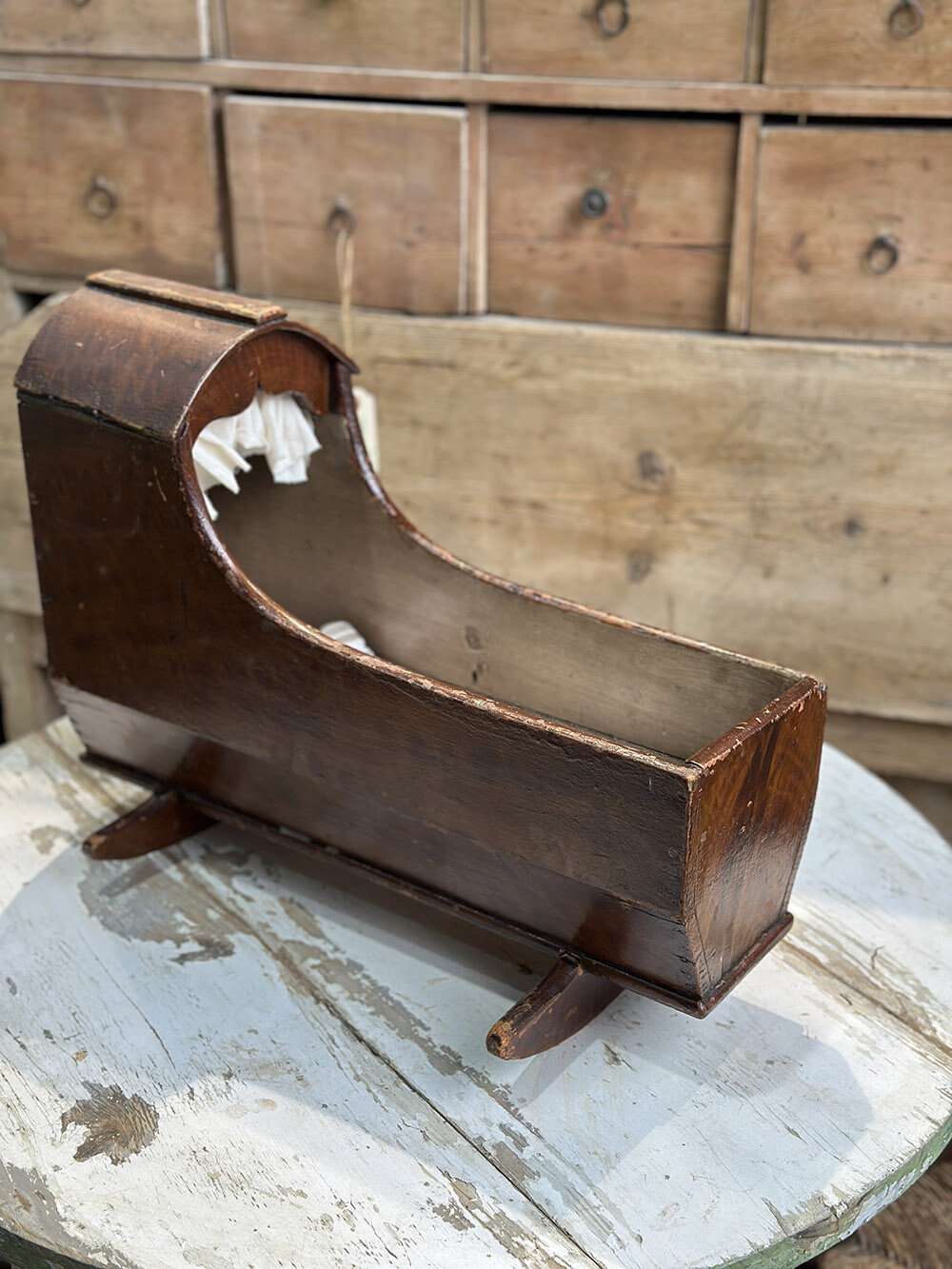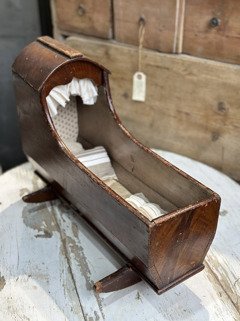 26a-032 Antique Teddy cradle with mattress and cushions