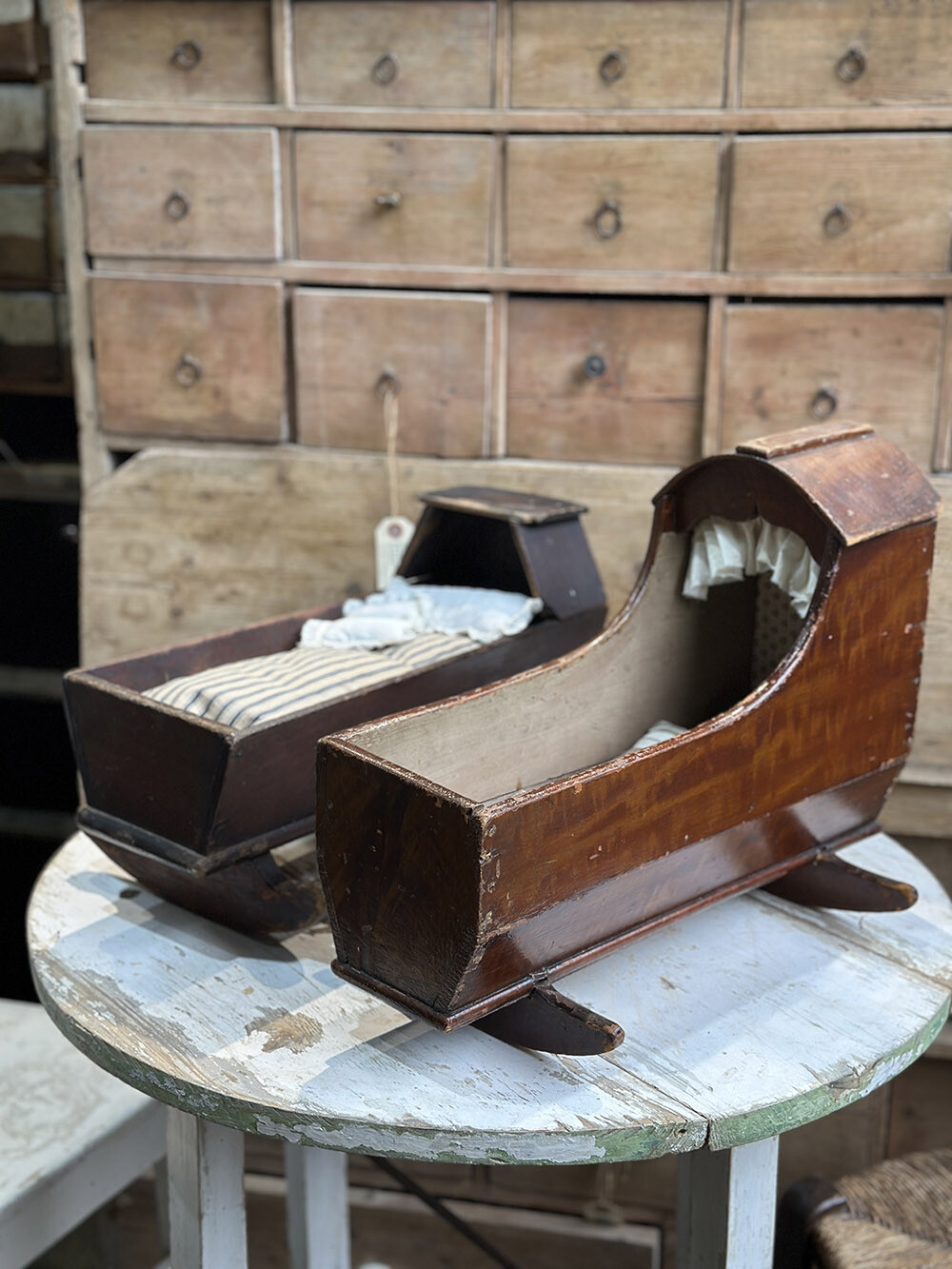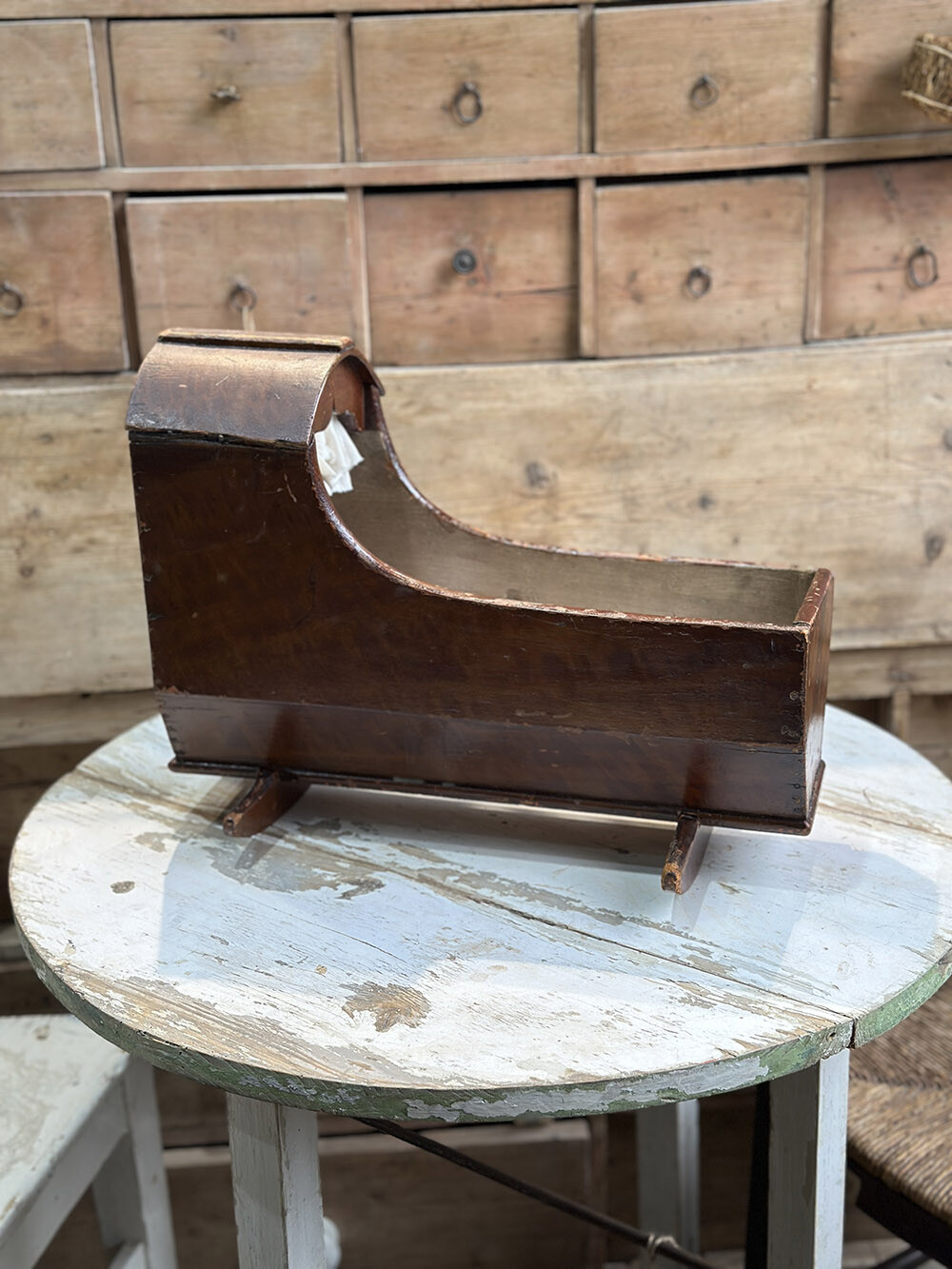 1800년대 후반에 제작된 조지안 스타일의 테디 베어 요람입니다. 수공으로 가공된 구조는 단순하면서도 견고하며, 고운 곡선과 비례에서 조지안 특유의 단아한 미감이 드러납니다. 아이들이 인형이나 테디 베어를 눕히고 소꿉장난을 하기 위한 용도로 제작된 토이 크래들이지만, 제법 크기가 있는 편입니다. 사진에 보이는 매트리스와 쿠션이 모두 포함되어 있으며, 전체가 원목으로 제작되어 있습니다.