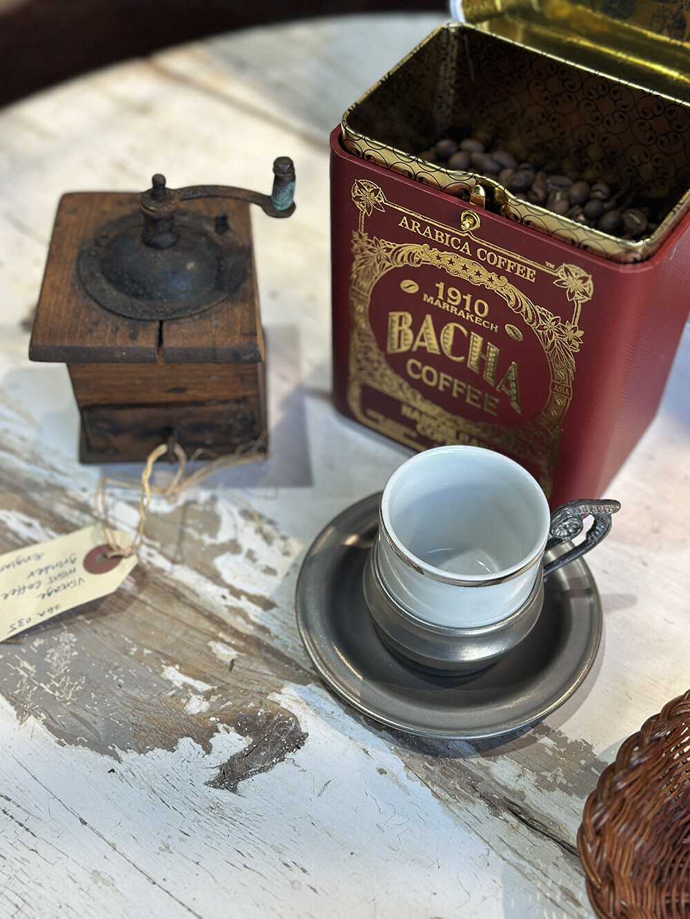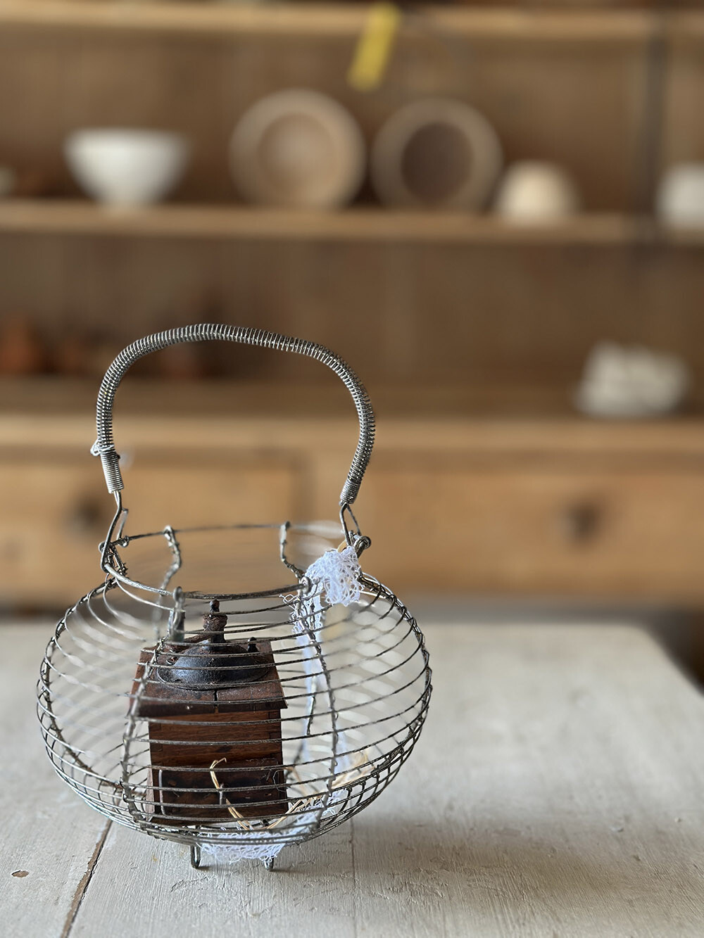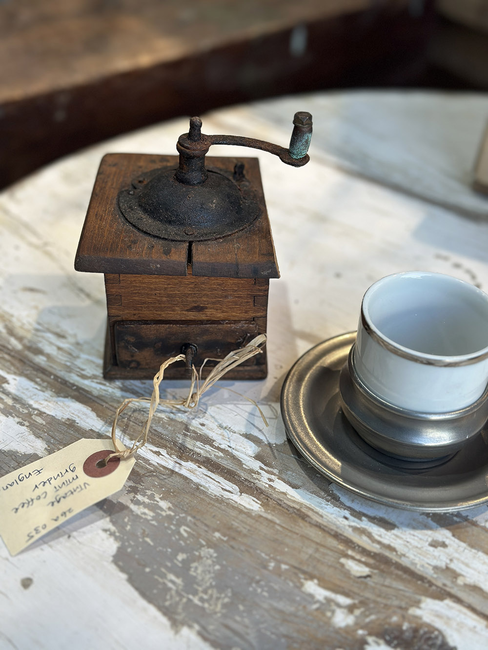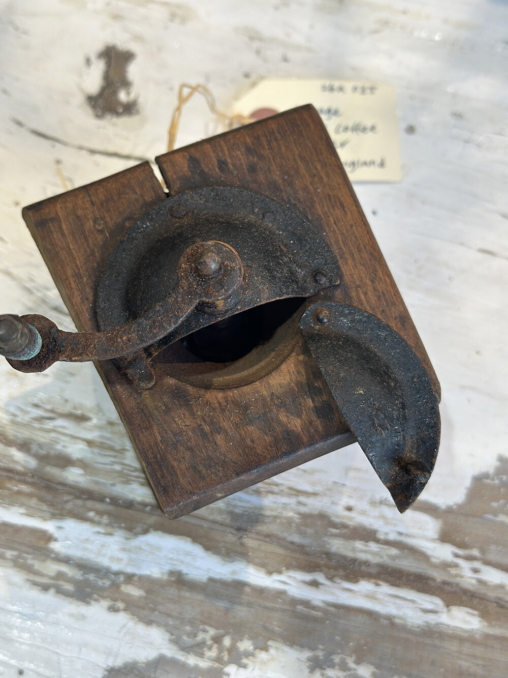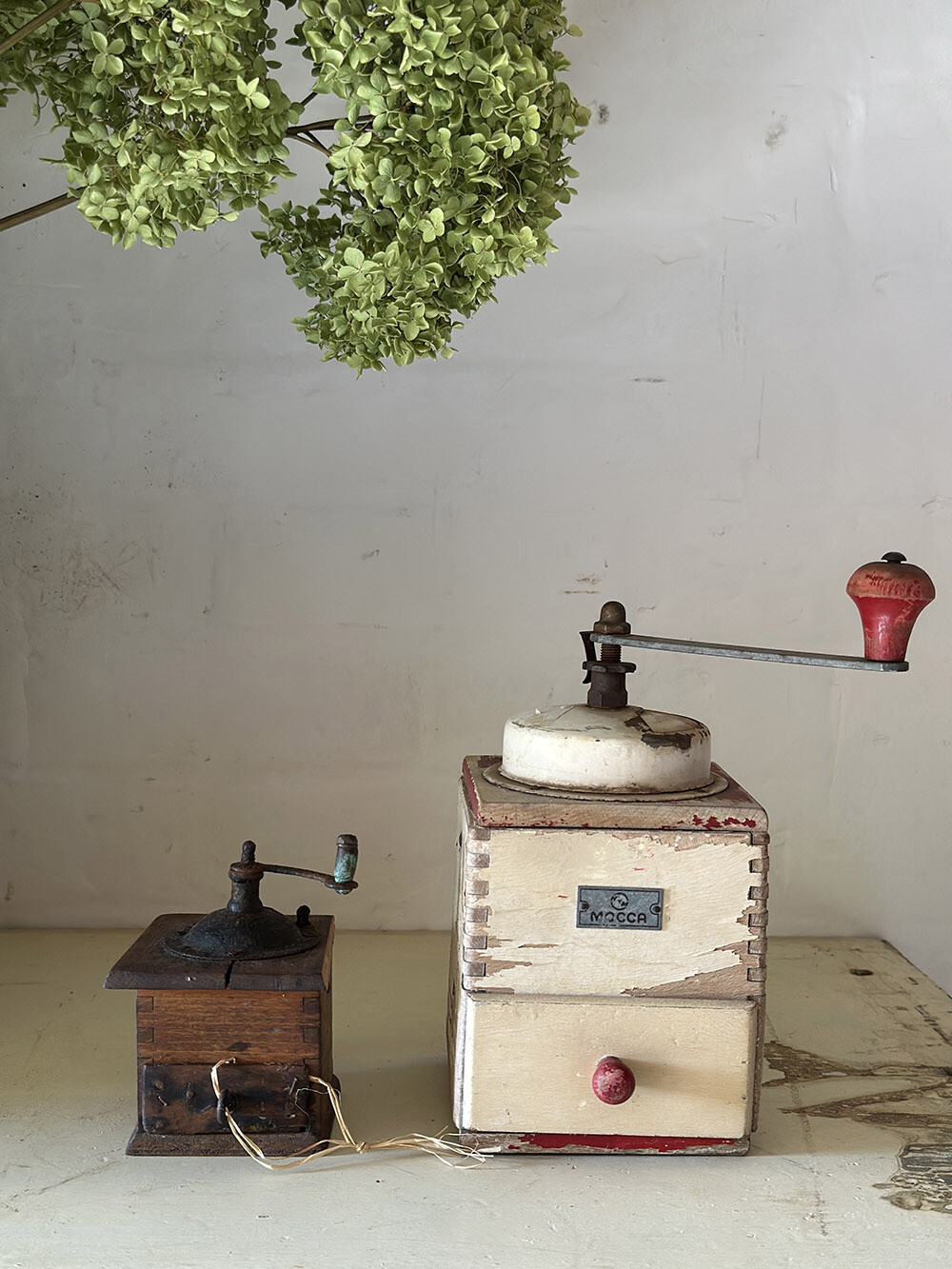 목재는 오랜 사용을 거치며 깊게 어두워진 색감과 마모 흔적이 남아 있고, 철제 상부 유닛 역시 산화된 질감이 자연스러운 파티나를 만들어내고 있습니다. 실제 생활 도구로 쓰이며 축적된 시간의 흔적이 고스란히 남아 있어, 주방이나 커피 코너에 두기 좋은 빈티지 키친 오브제로도 매력적인 물건입니다.