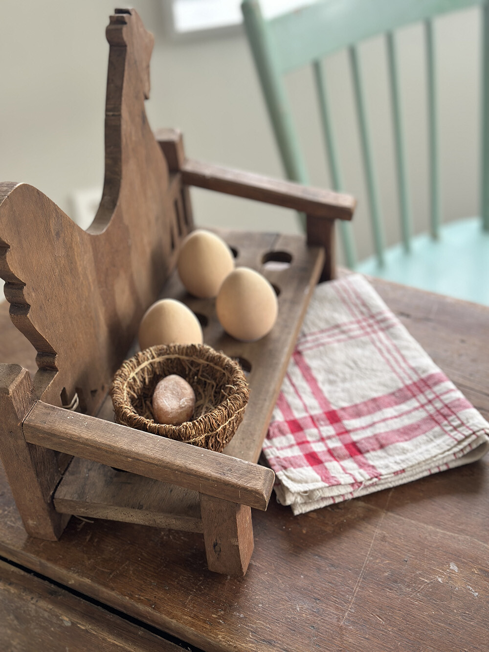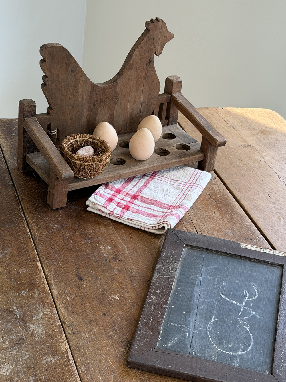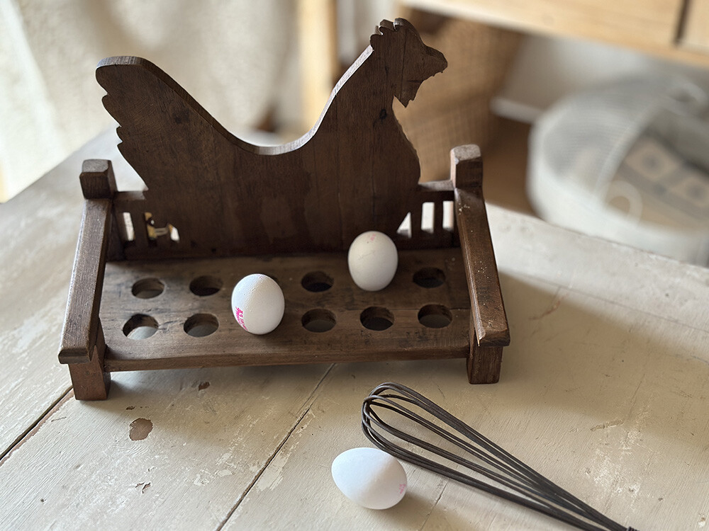빈티지 우든 에그 스토리지입니다. 원목으로 제작된 구조 위에 계란 12개를 안정적으로 수납할 수 있도록 홀을 파낸 형태로, 주방에서의 실사용을 전제로 만들어진 소품이예요. 뒤쪽에는 닭의 실루엣을 형상화한 장식 패널이 더해져, 단순한 보관 도구를 넘어 컨트리적인 분위기를 자연스럽게 만들어 줍니다.
