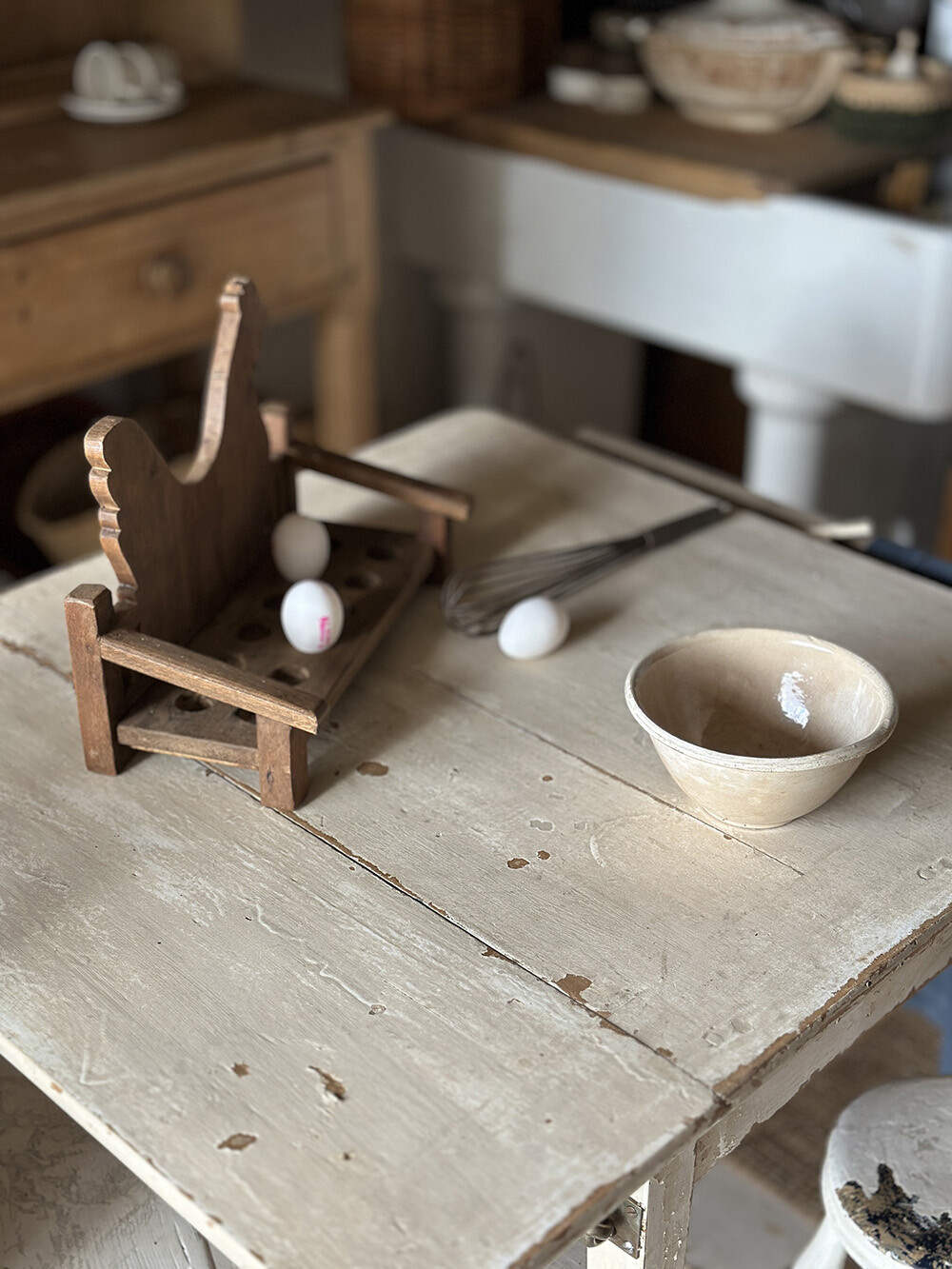 표면에는 오랜 사용을 거치며 쌓인 파티나와 미세한 마모가 고르게 남아 있어, 원목의 질감과 색감이 깊이 있게 드러납니다. 키친 한 켠에 두는 것만으로도 공간의 온도를 바꿔주는 소품으로, 계란 보관은 물론 작은 오브제를 올려두는 디스플레이 용도로 활용해도 좋겠죠.