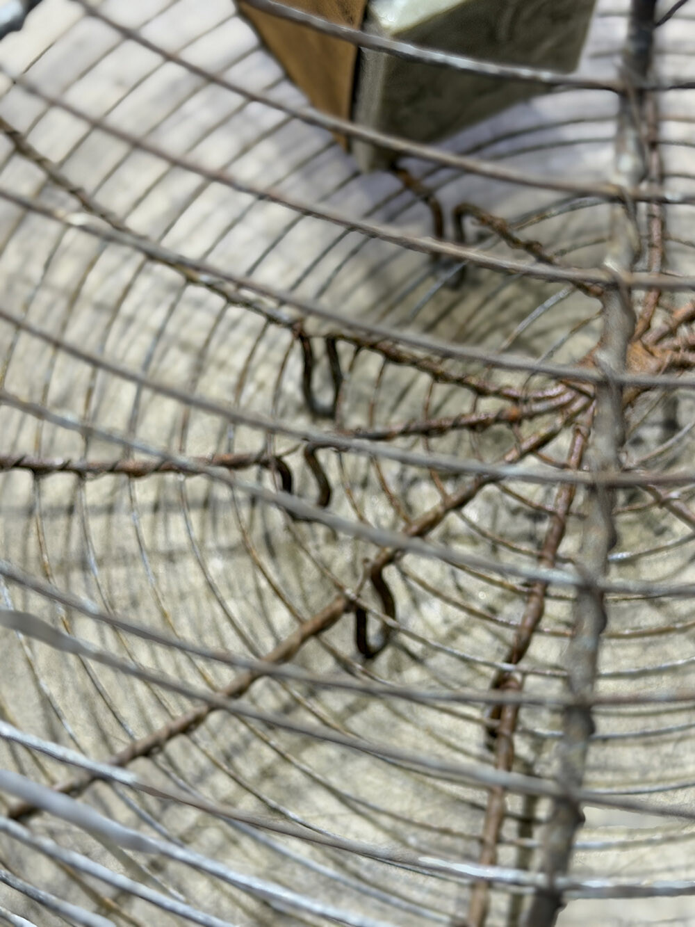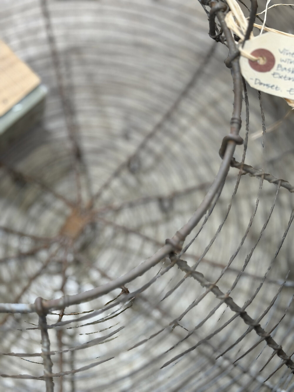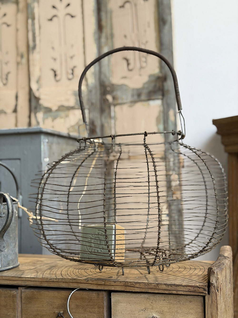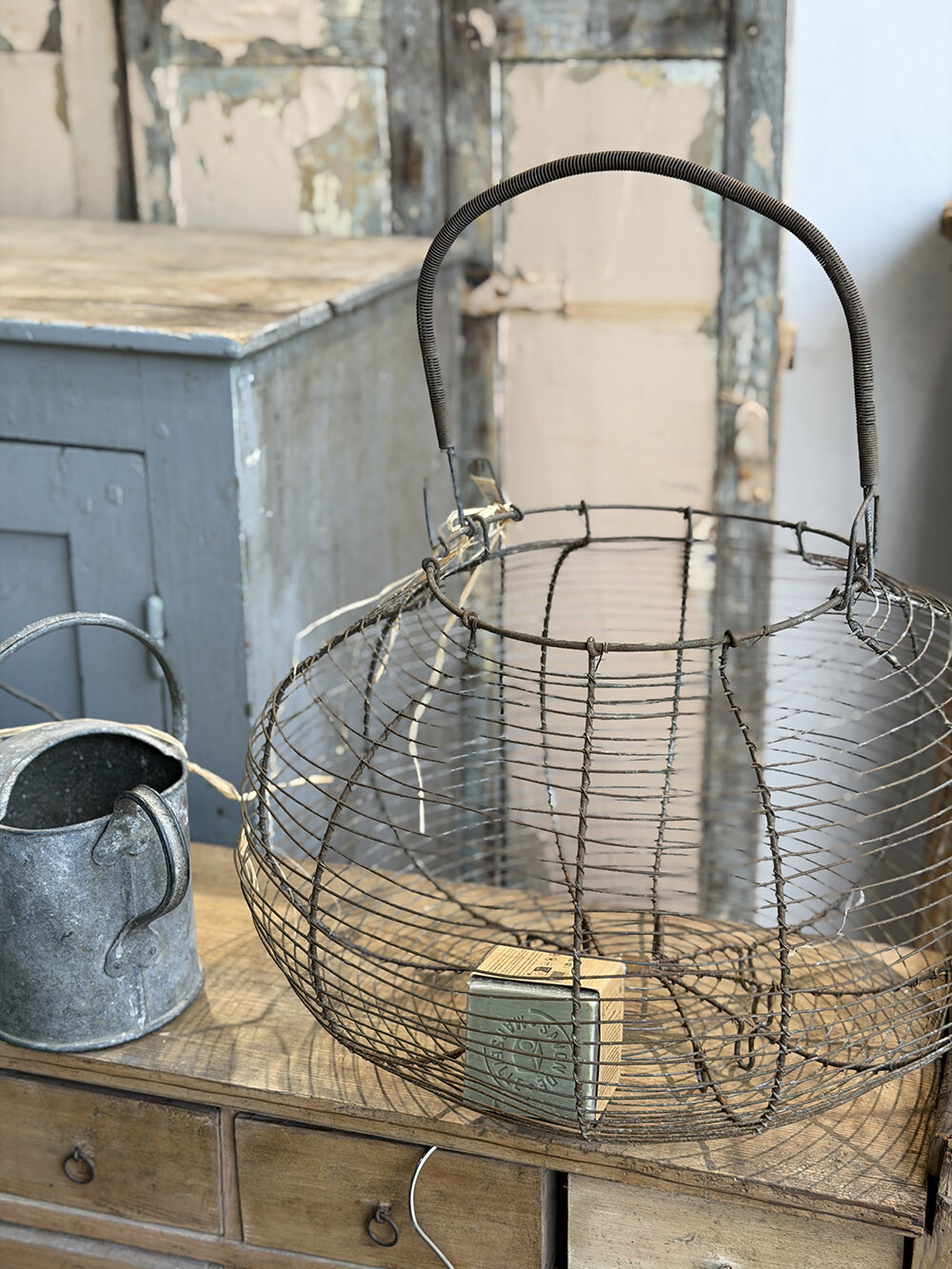 빈티지 와이어 메쉬 바스켓으로, 좀처럼 보기 어려운 대형 사이즈의 피스입니다. 철 와이어를 엮어 만든 구조에 아치형 손잡이가 더해진 형태로, 본래는 수확물이나 장작, 생활 물품 등을 담아 옮기기 위한 용도로 사용되었을 가능성이 높죠. 사이즈가 큰 만큼 구조에 가해진 하중과 시간의 영향으로 완전한 타원 구체의 형태는 약간 흐트러져 있지만, 그 변형 자체가 오히려 일상 속에서 쓰여 온 흔적과 자연스러운 균형감을 만들어냅니다. 멀리서 보면 비교적 정돈된 실루엣을 유지하고 있으면서도, 가까이에서는 와이어의 미세한 뒤틀림과 산화가 만들어낸 질감이 분명하게 드러나며 세월의 축적을 느끼게 하는 피스예요.