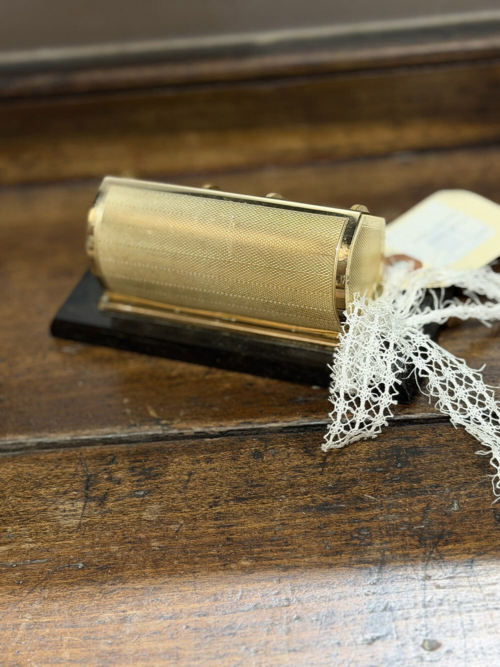 작은 사이즈로 책상 위에 두고 사용하는 데스크탑 캘린더입니다. 각 컬럼마다 독립적으로 구성된 휠을 손으로 돌려 요일, 날짜, 월을 맞추는 방식으로, 전기가 아닌 순수한 기계적 구조로 작동하는 점이 이 피스의 핵심입니다. 골드 톤 메탈 바디에는 촘촘한 기요쉐 패턴이 들어가 있어 빛을 받는 각도에 따라 은은하게 표정이 달라지고, 블랙 페인트의 페데스탈 위에 올려진 대비가 전체적인 인상을 또렷하게 잡아줍니다.