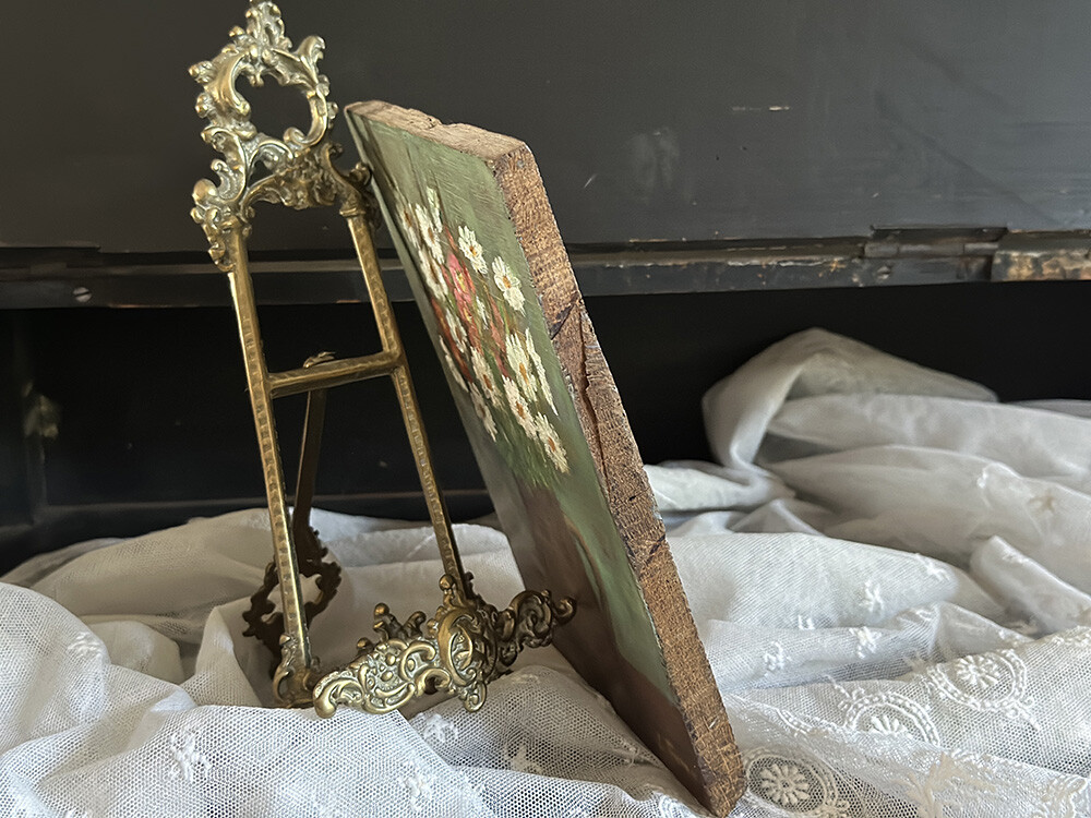 두께 약 1.5cm의 솔리드 우드 패널 위에 직접 그려진 빈티지 페인팅입니다. 캔버스가 아닌 나무 판을 바탕으로 한 작품이라, 표면에 물감이 스며든 질감과 붓질의 흔적이 비교적 또렷하게 남아 있습니다.