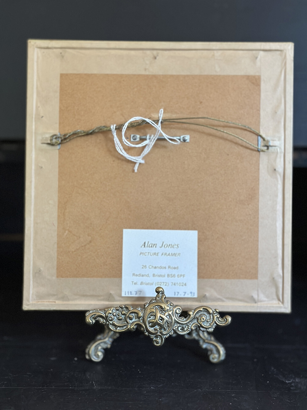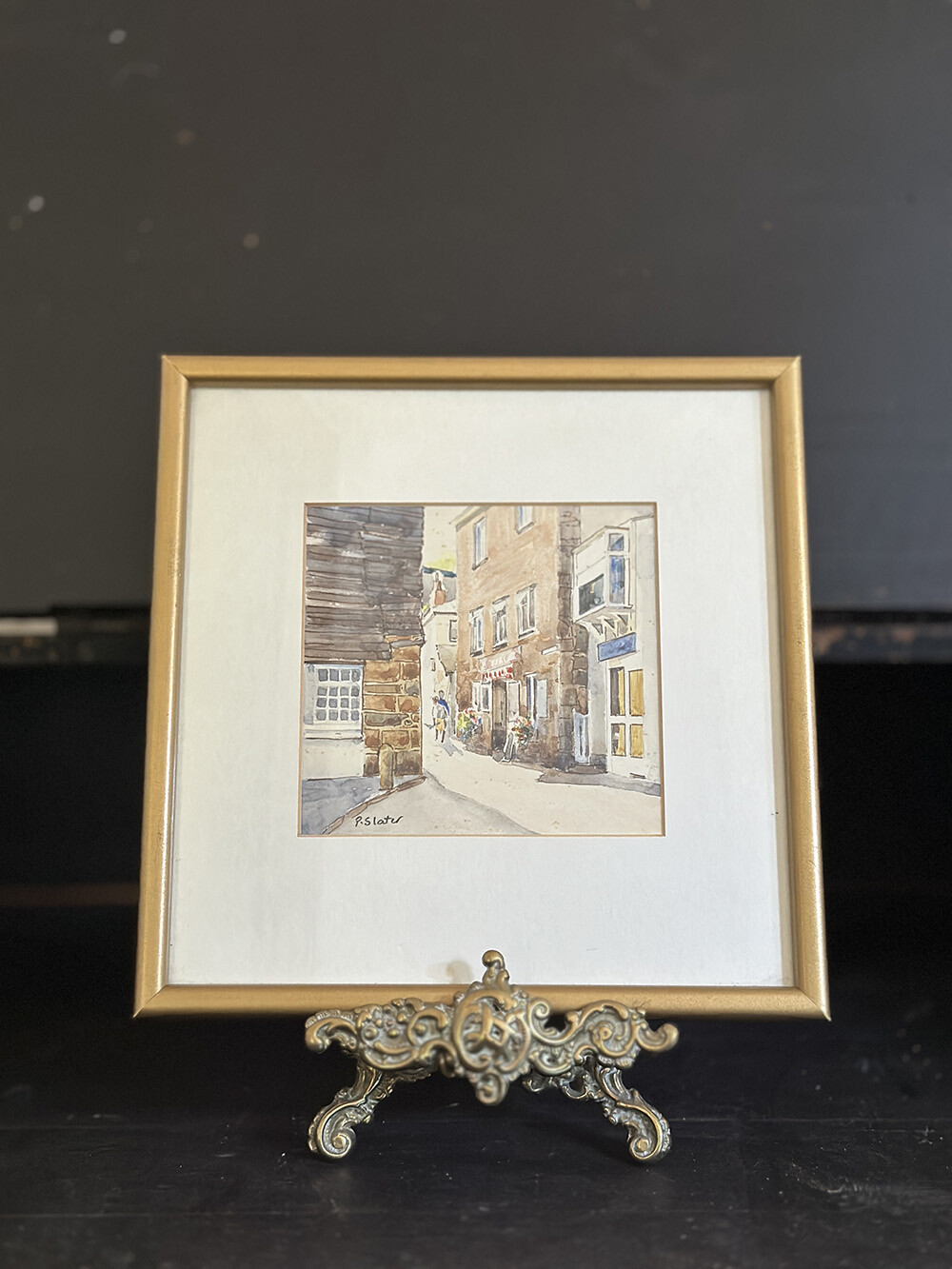 작품 좌측 하단에는 P. Slater의 서명이 확인되며, 소형 사이즈의 작업으로 액자 표구된 상태입니다.책장 위, 콘솔이나 데스크 상부처럼 가까운 거리에서 감상하는 위치에 두기 좋은 그림이에요.