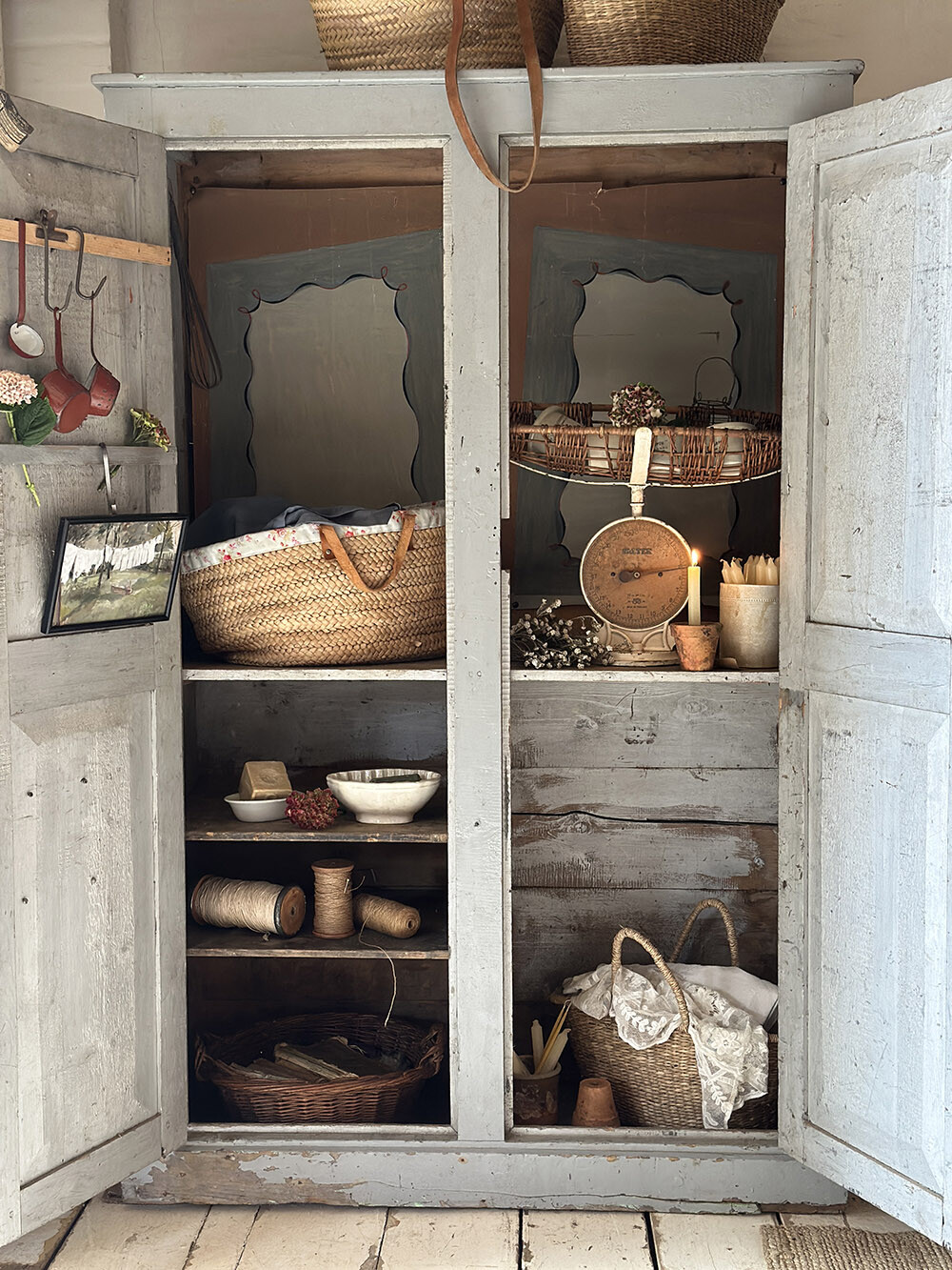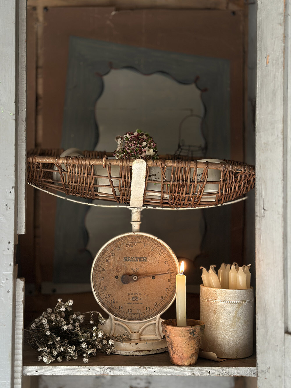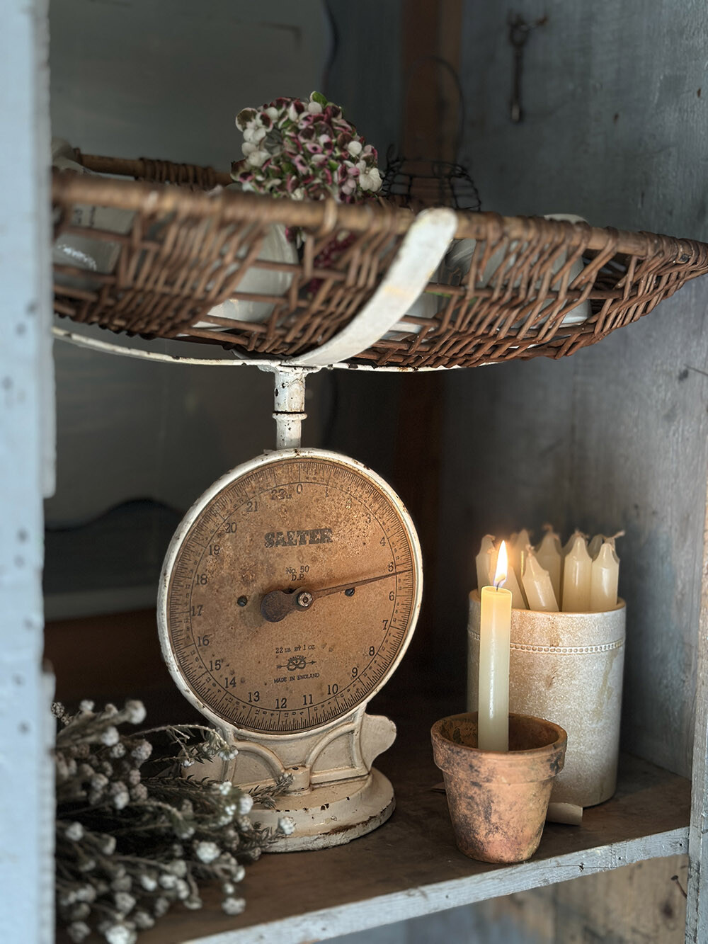 솔터(SALTER)사의 기계식 저울입니다. 주물로 만들어진 저울의 몸체는 매우 묵직한 안정감이 있는데요, 그 위에 얹혀진 옆으로 길죽한 위커 바구니는 아주 어린 아기의 체중을 재기 위한 것이었죠. 윌로우(버드나무를 쪼개 엮을 수 있게끔 한 초경공예 재료)로 엮어진 바구니의 물성과 주물 철의 물성이 서로 어우러져, 그위에 입혀진 세월감이 특유의 분위기를 자아내요. 저울의 계량 기능은 아직 정상적으로 작동한다는 점도 매력적이구요.
