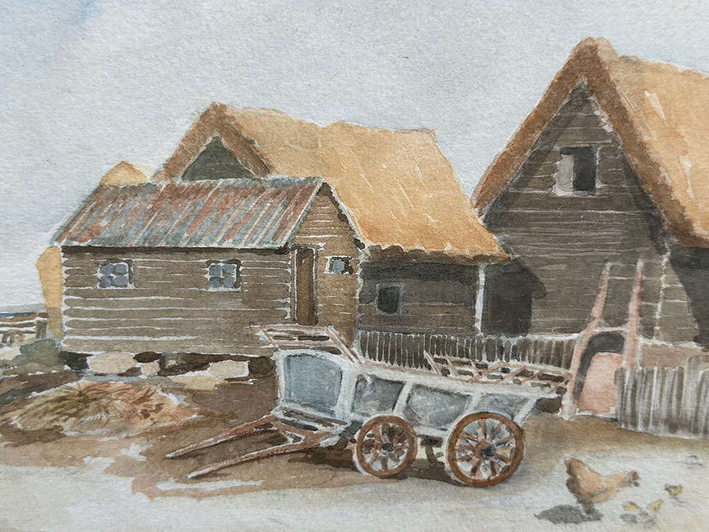 영국 바닷가 지역의 풍경을 담은 빈티지 수채화입니다. 초가지붕을 얹은 목조 건물과 흙길, 닭과 수레까지 소박하게 배치되어 있고, 멀리 수평선과 바다가 은은하게 열려 있습니다. 세밀하게 묘사하기보다는 번짐과 여백을 살린 수채 특유의 터치로 정리되어 있어, 일상의 장면을 조용히 기록한 드로잉에 가깝죠. 색감은 채도를 낮춘 브라운과 오커 계열 위주라 공간에 부담 없이 스며드는 톤입니다.