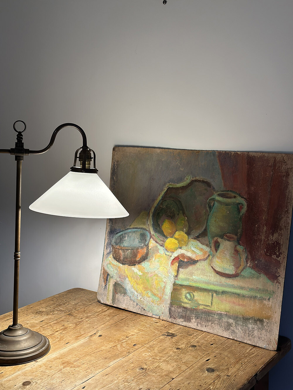 테이블 위 저그와 과일을 정물로 풀어낸 빈티지 양면 회화입니다. 한쪽 면은 그린과 오커, 레드 브라운이 짙게 대비되며 묵직한 분위기를 만들고, 다른 한쪽은 옐로우 톤이 중심이 되어 보다 밝고 일상적인 장면으로 정리되어 있습니다. 같은 테이블 구조 안에서 색감과 공기의 밀도를 다르게 가져가고 있어, 한 작가의 실험적 과정처럼 보이기도 하죠. 형태를 또렷하게 마감하기보다는 색면을 겹쳐 올리는 방식이라 붓질의 흔적이 그대로 살아 있습니다.