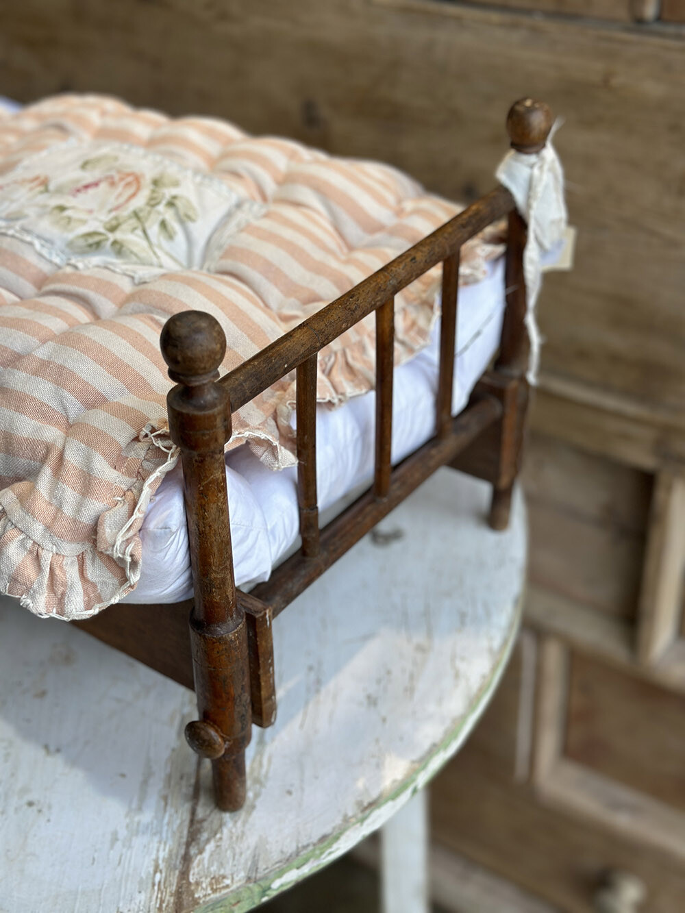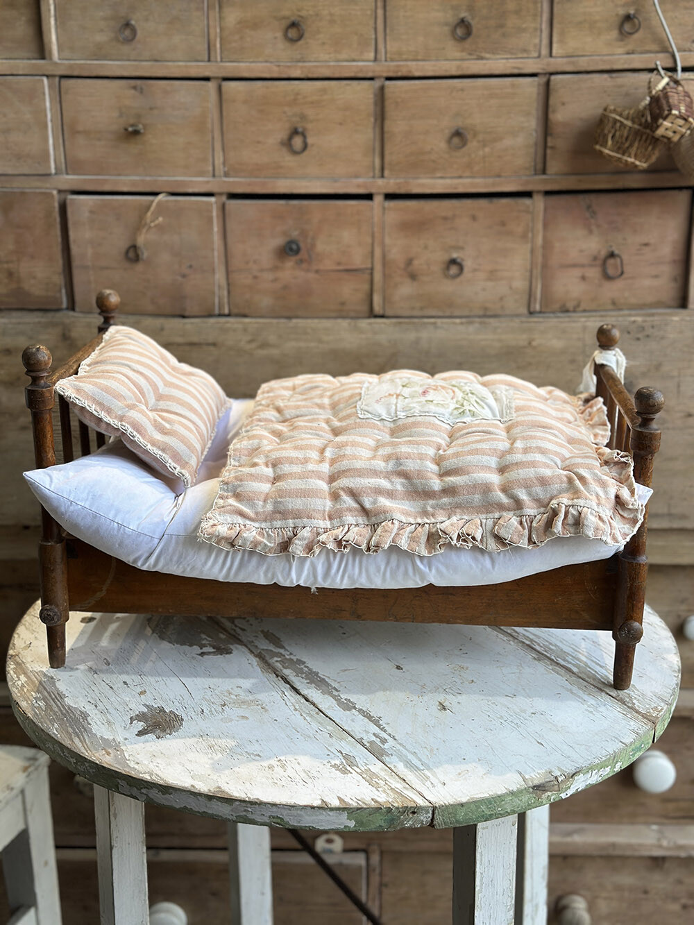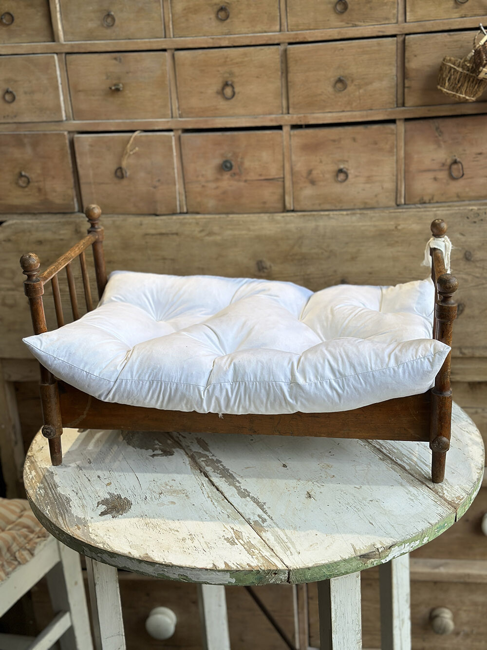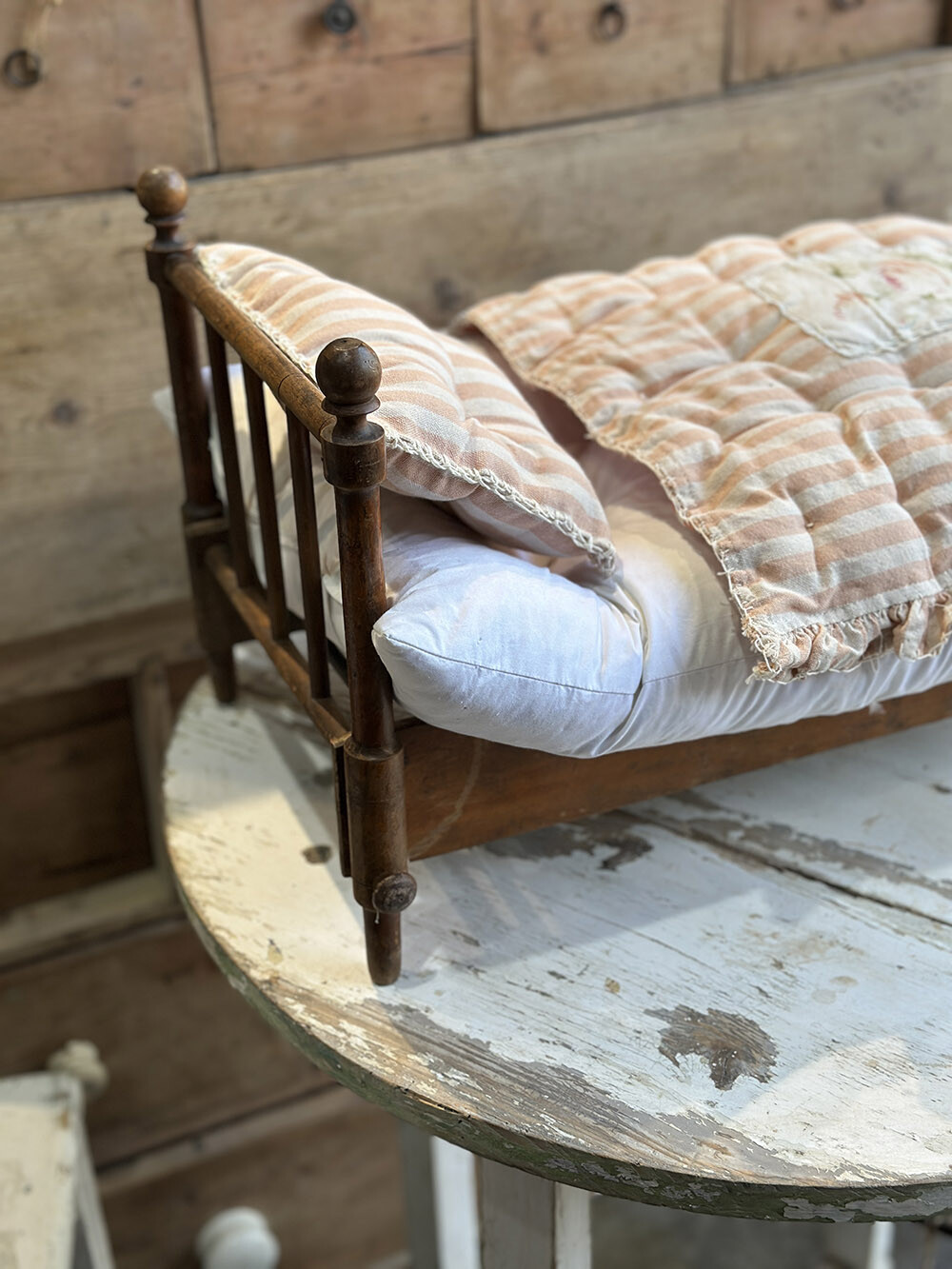 영국 프렌셤 지역에서 수집된 빈티지 폴딩 돌스 베드로, 원목으로 제작된 아담한 사이즈의 인형용 침대입니다. 접이식 구조로 만들어져 사용하지 않을 때에는 간결하게 접어 보관할 수 있고, 필요할 때에는 쉽게 펼쳐 사용할 수 있는 실용적인 설계가 특징이죠. 매트리스와 이불, 베개까지 함께 구성되어 있어 하나의 완성된 작은 침실 풍경을 그대로 담아낸 듯한 구성을 갖추고 있습니다.