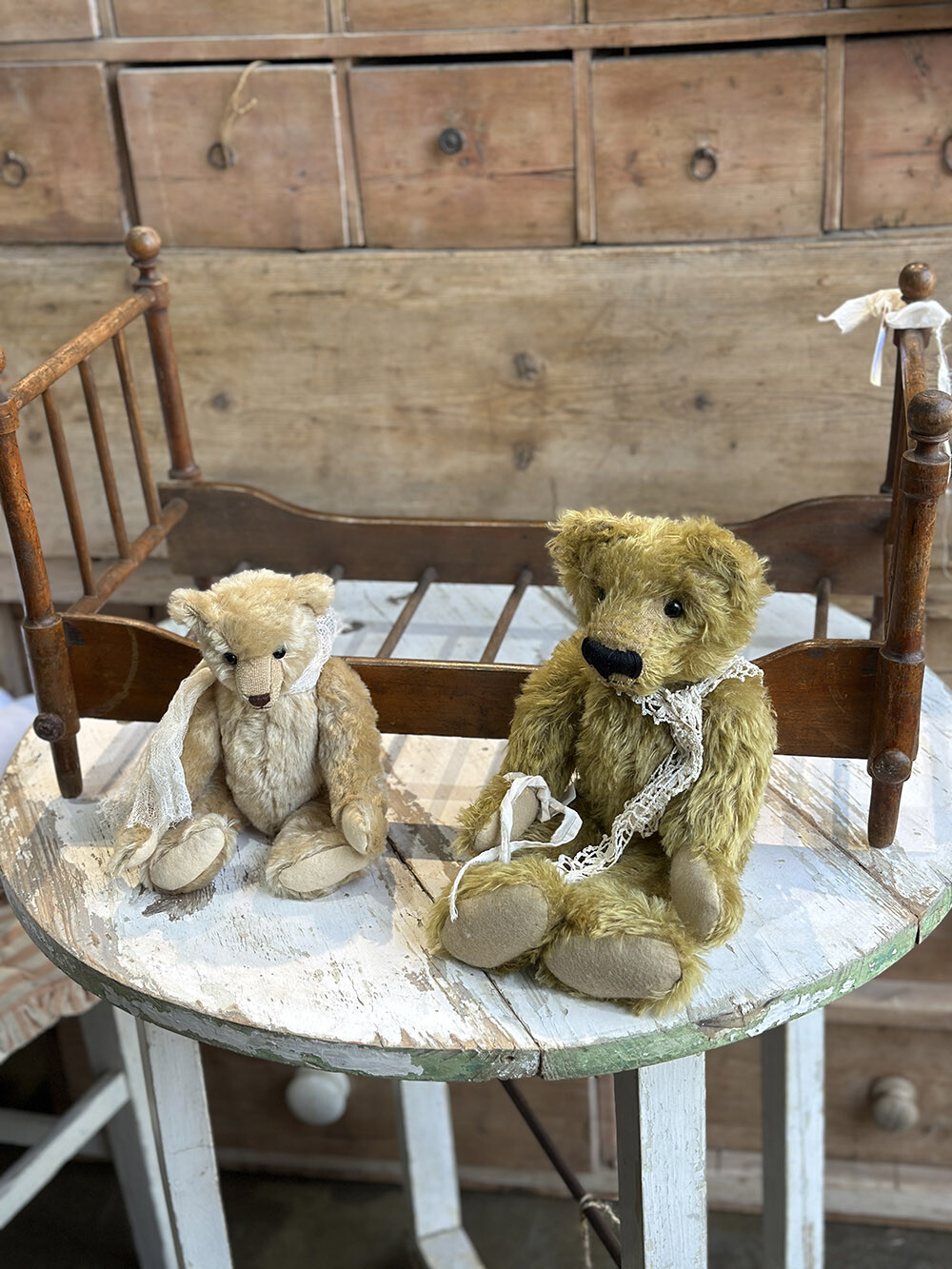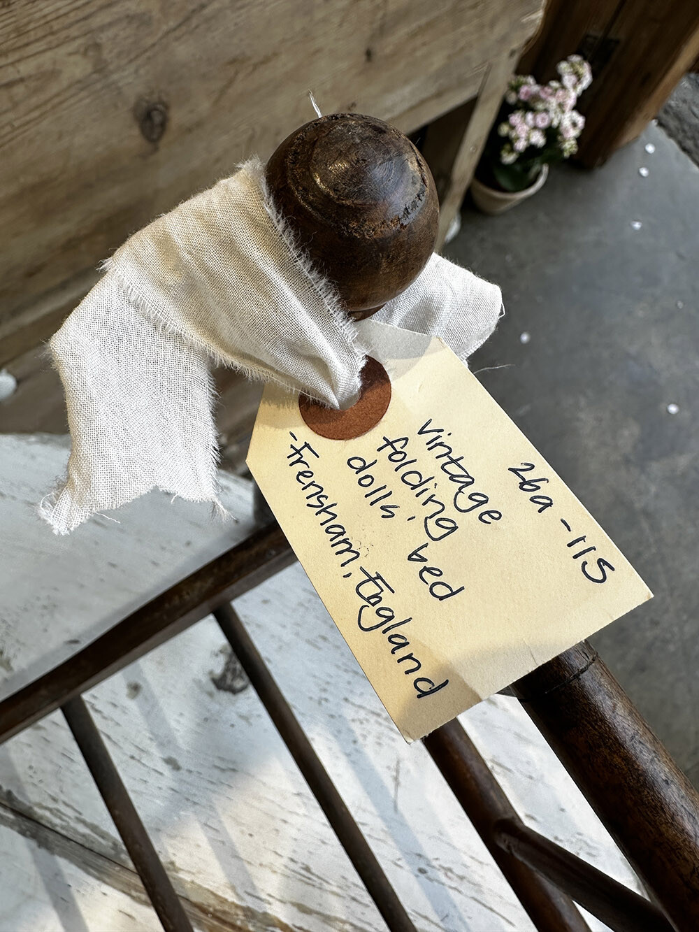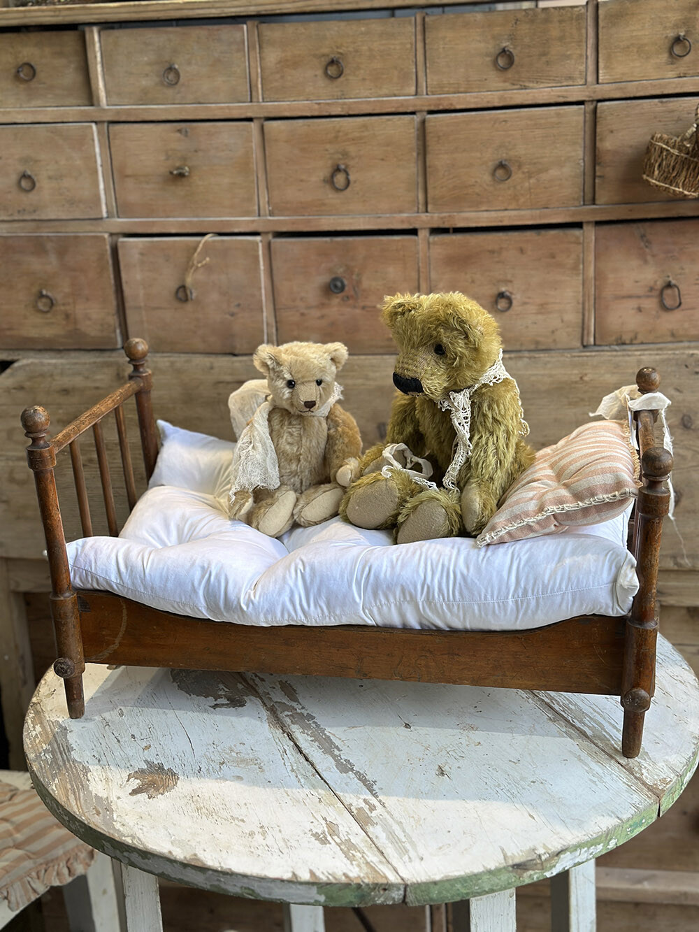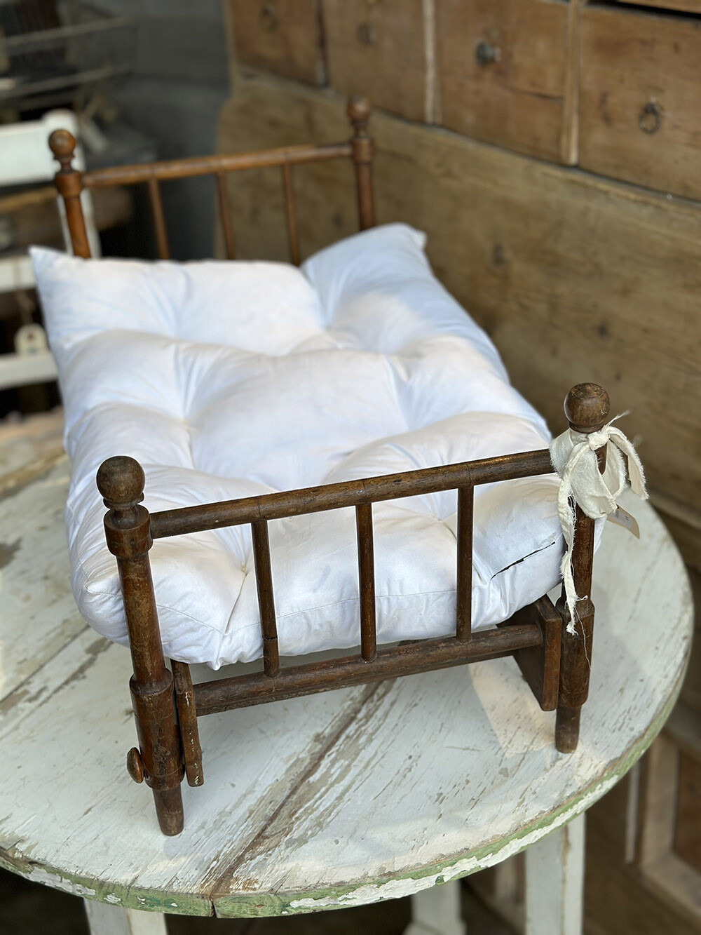 영국 프렌셤 지역에서 수집된 빈티지 폴딩 돌스 베드로, 원목으로 제작된 아담한 사이즈의 인형용 침대입니다. 접이식 구조로 만들어져 사용하지 않을 때에는 간결하게 접어 보관할 수 있고, 필요할 때에는 쉽게 펼쳐 사용할 수 있는 실용적인 설계가 특징이죠. 매트리스와 이불, 베개까지 함께 구성되어 있어 하나의 완성된 작은 침실 풍경을 그대로 담아낸 듯한 구성을 갖추고 있습니다.