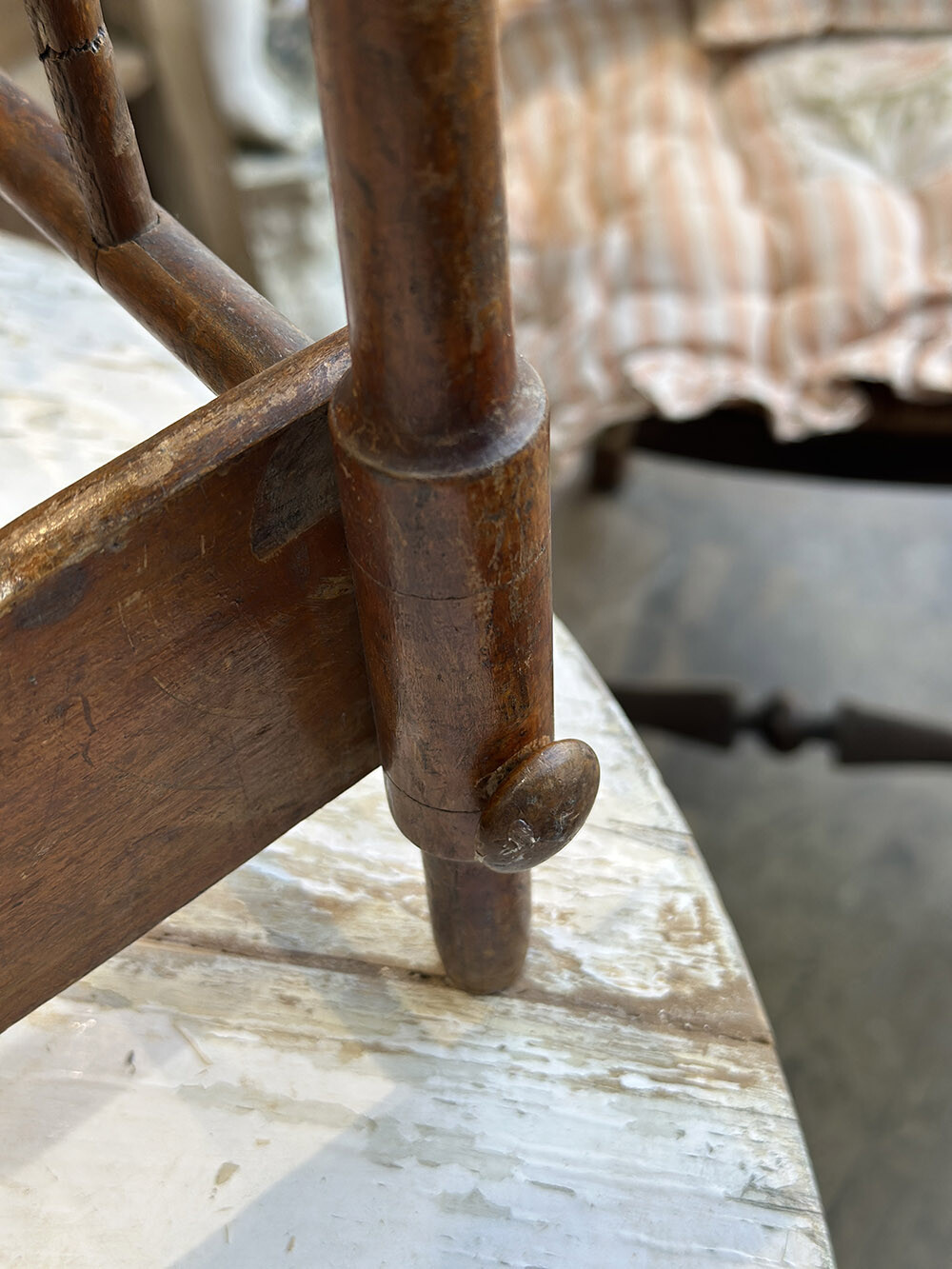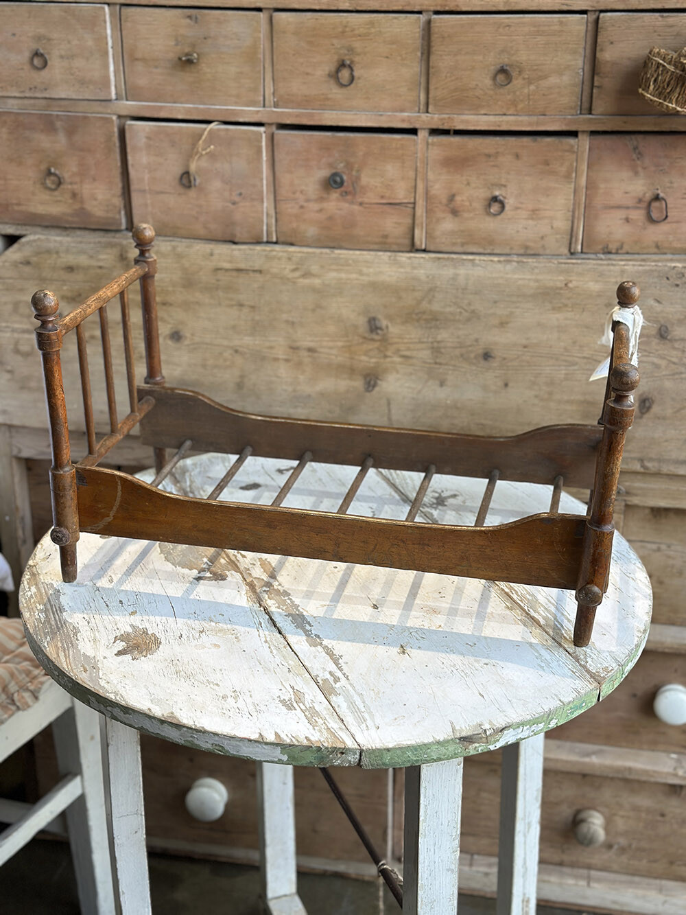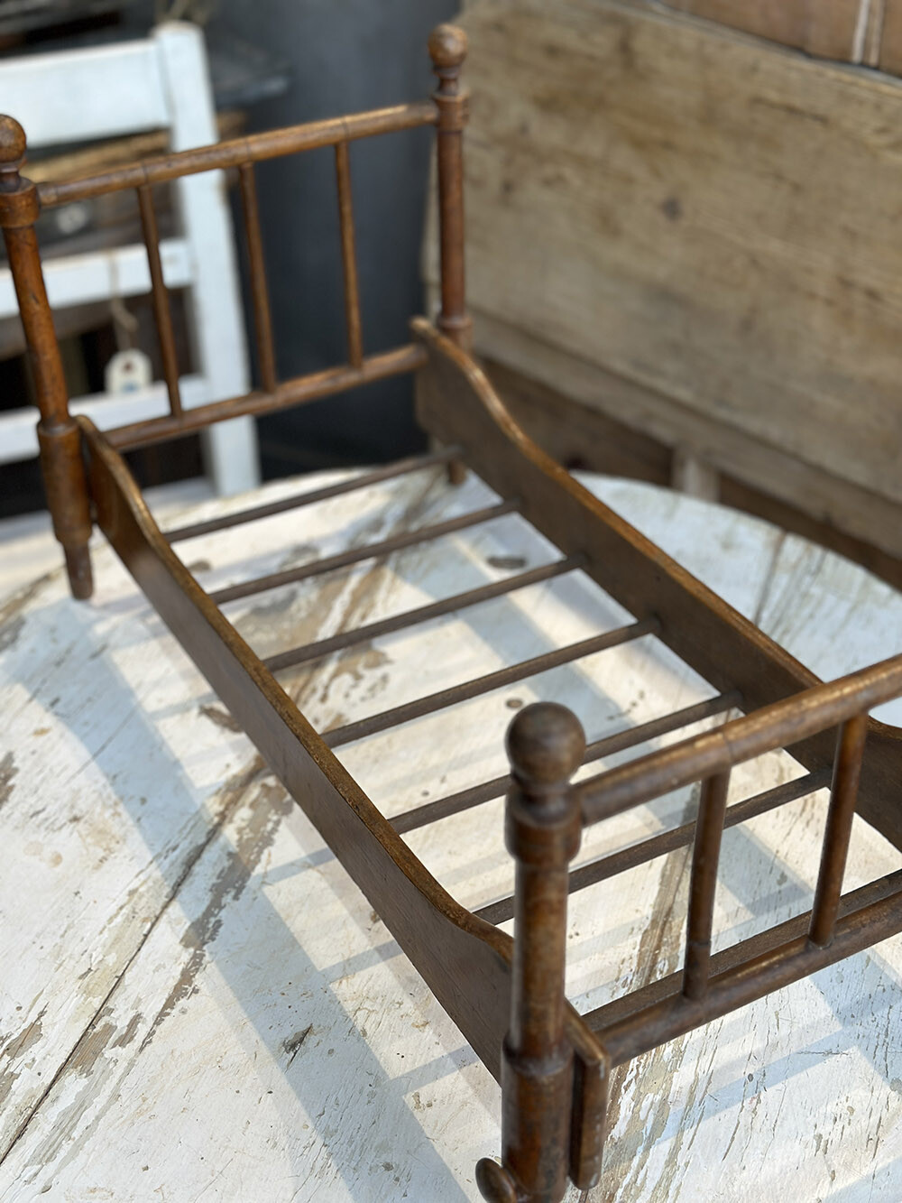 헤드와 풋보드에 적용된 간결한 스핀들 구조와 부드럽게 굴곡진 사이드 라인이 소형 가구임에도 안정적인 비례감을 만들어내며, 사용되며 자연스럽게 깊어진 목재의 색감과 표면의 흔적들이 이 피스가 지나온 시간을 조용히 드러냅니다. 단순한 소품을 넘어, 작은 스케일 안에서 하나의 생활 장면을 완성해내는 오브제로서의 매력이 분명한 피스입니다.