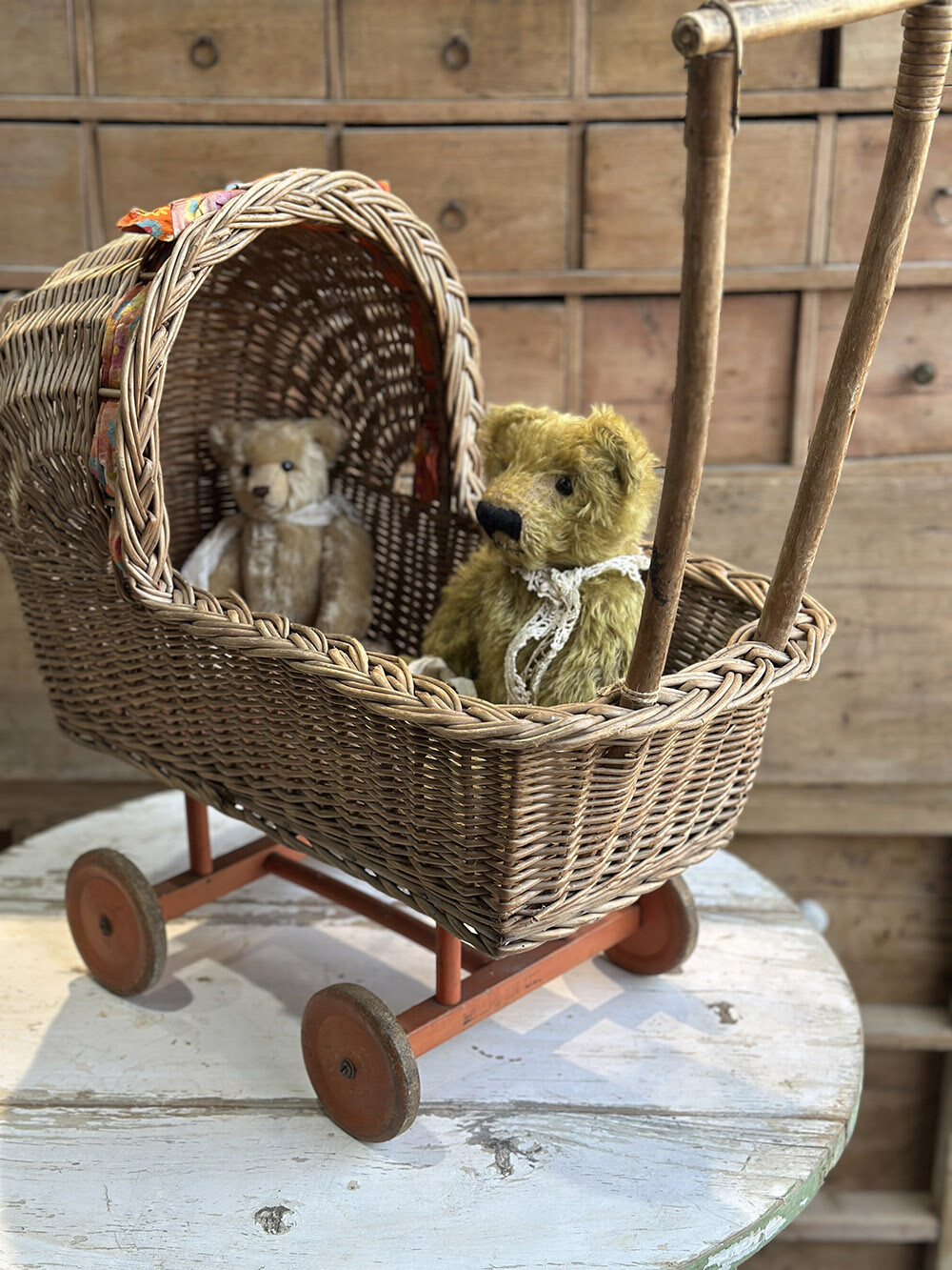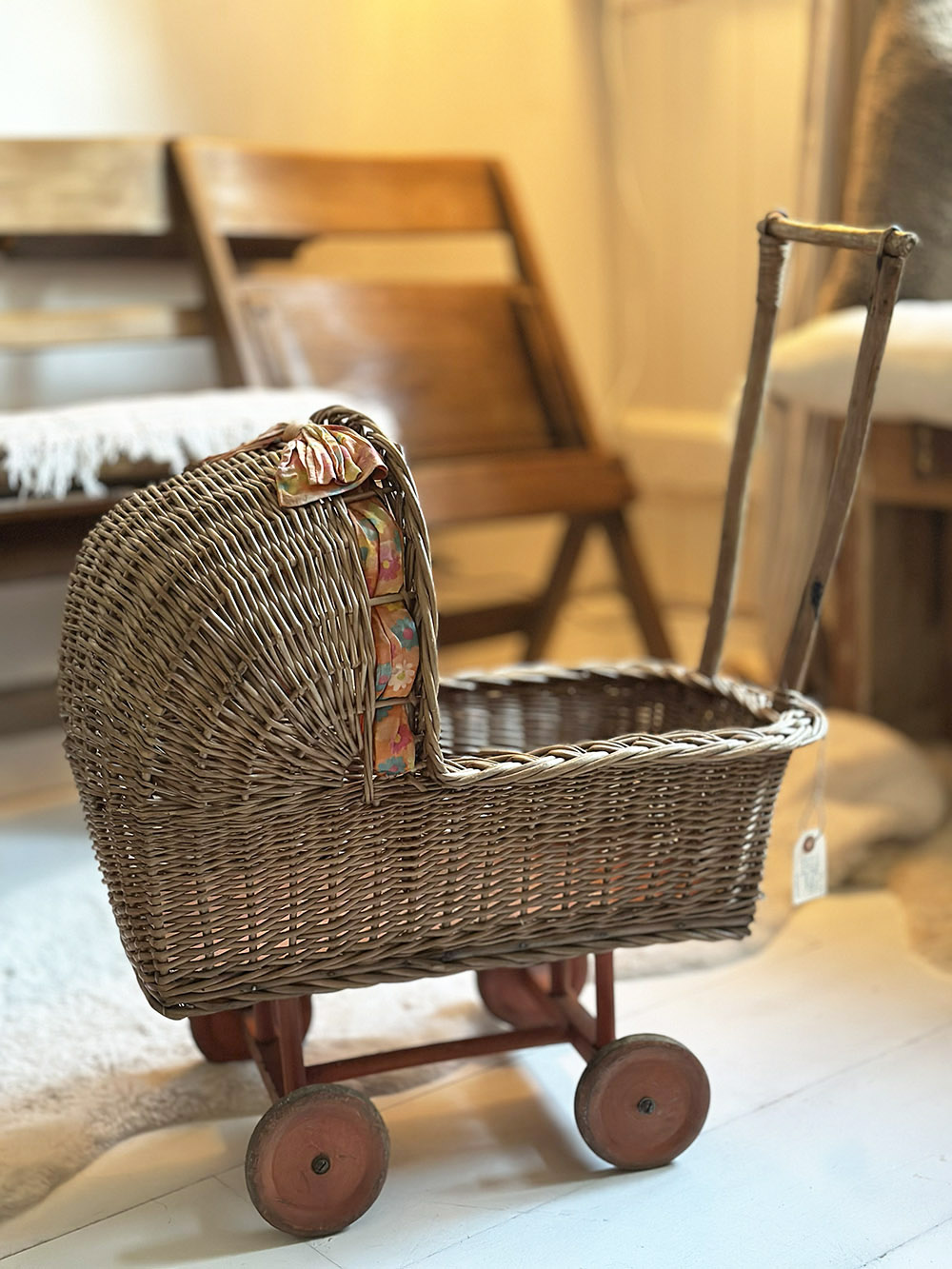 시간이 지나며 자연스럽게 톤이 깊어진 위커의 색감과, 원목 바퀴에 남아 있는 마모 흔적이 이 피스의 가장 큰 매력입니다. 단순한 장난감이라기보다 실제 생활 속에서 쓰이던 오브제였다는 점이 그대로 전해지죠. 키즈룸이나 쇼윈도, 혹은 공간의 한 켠에 두는 것만으로도 따뜻한 분위기를 만들어주며, 인형이나 패브릭을 담아 연출하기에도 좋은 빈티지 피스입니다.
