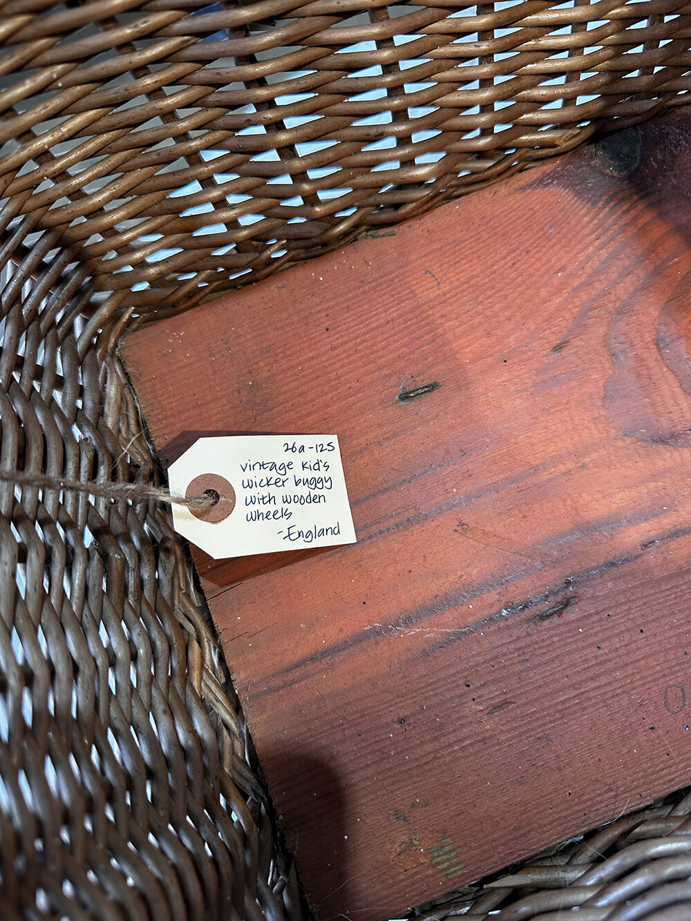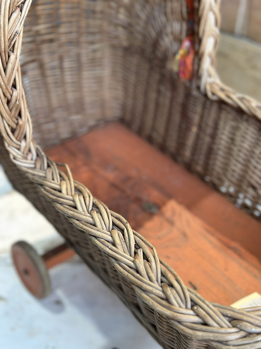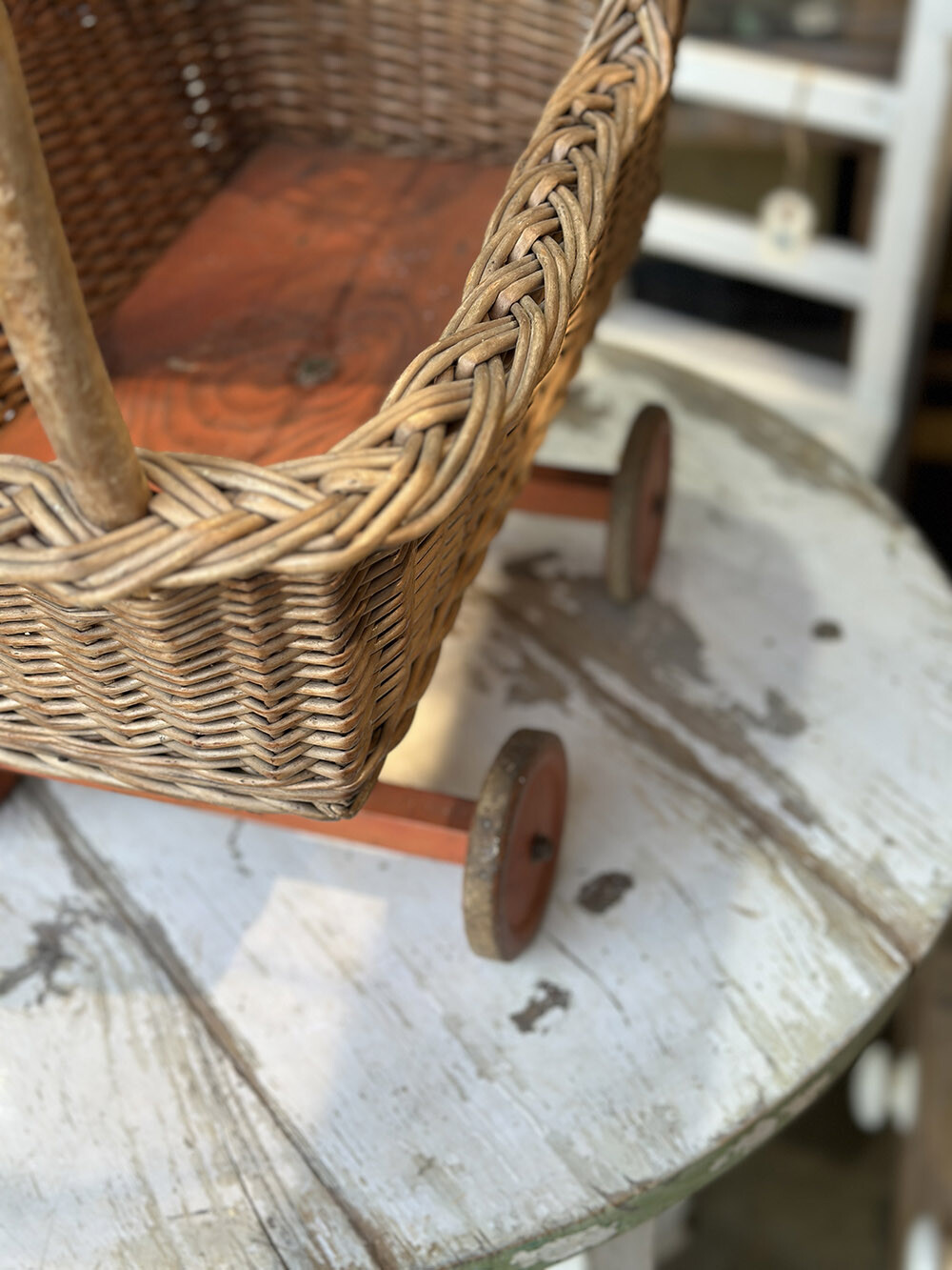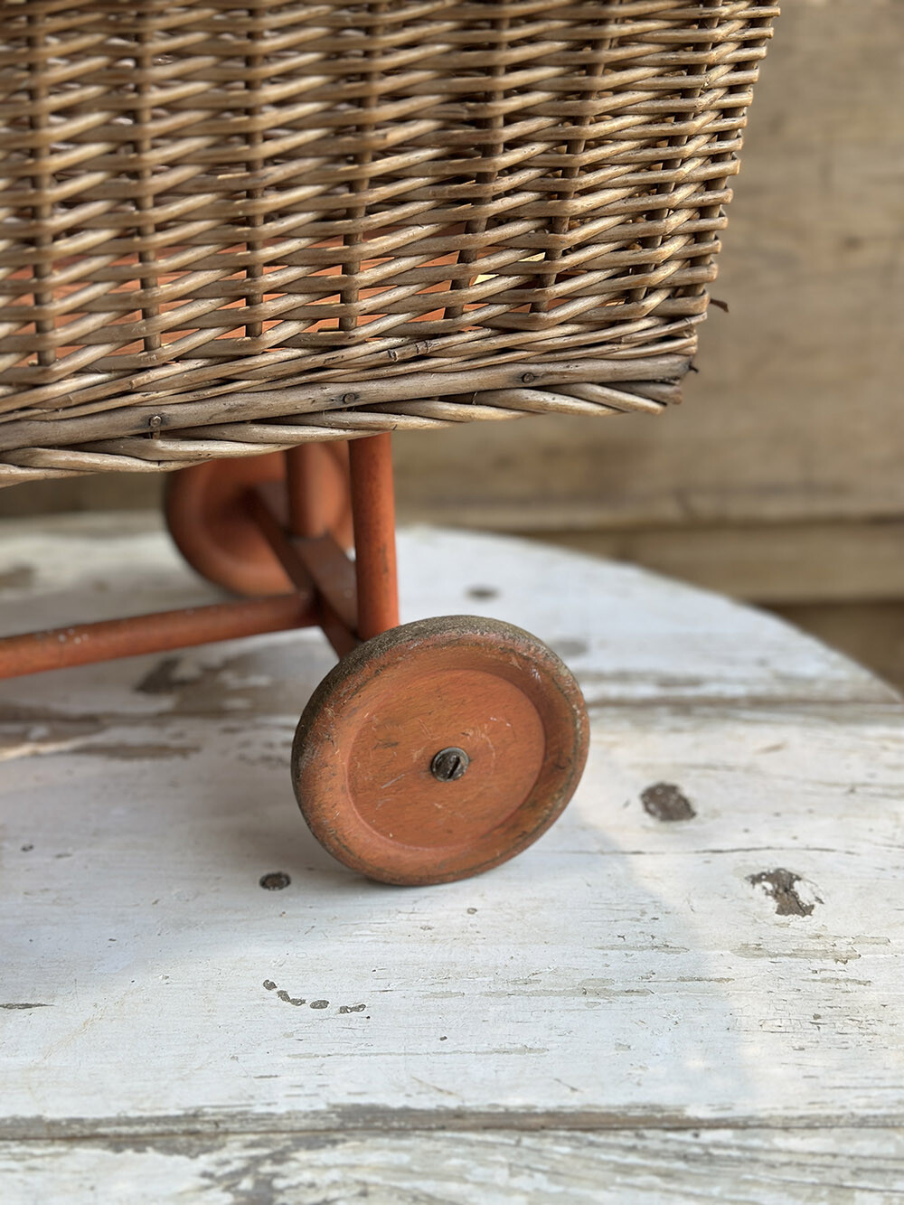 26a-125 Vintage kid's wicker buggy with wooden wheels