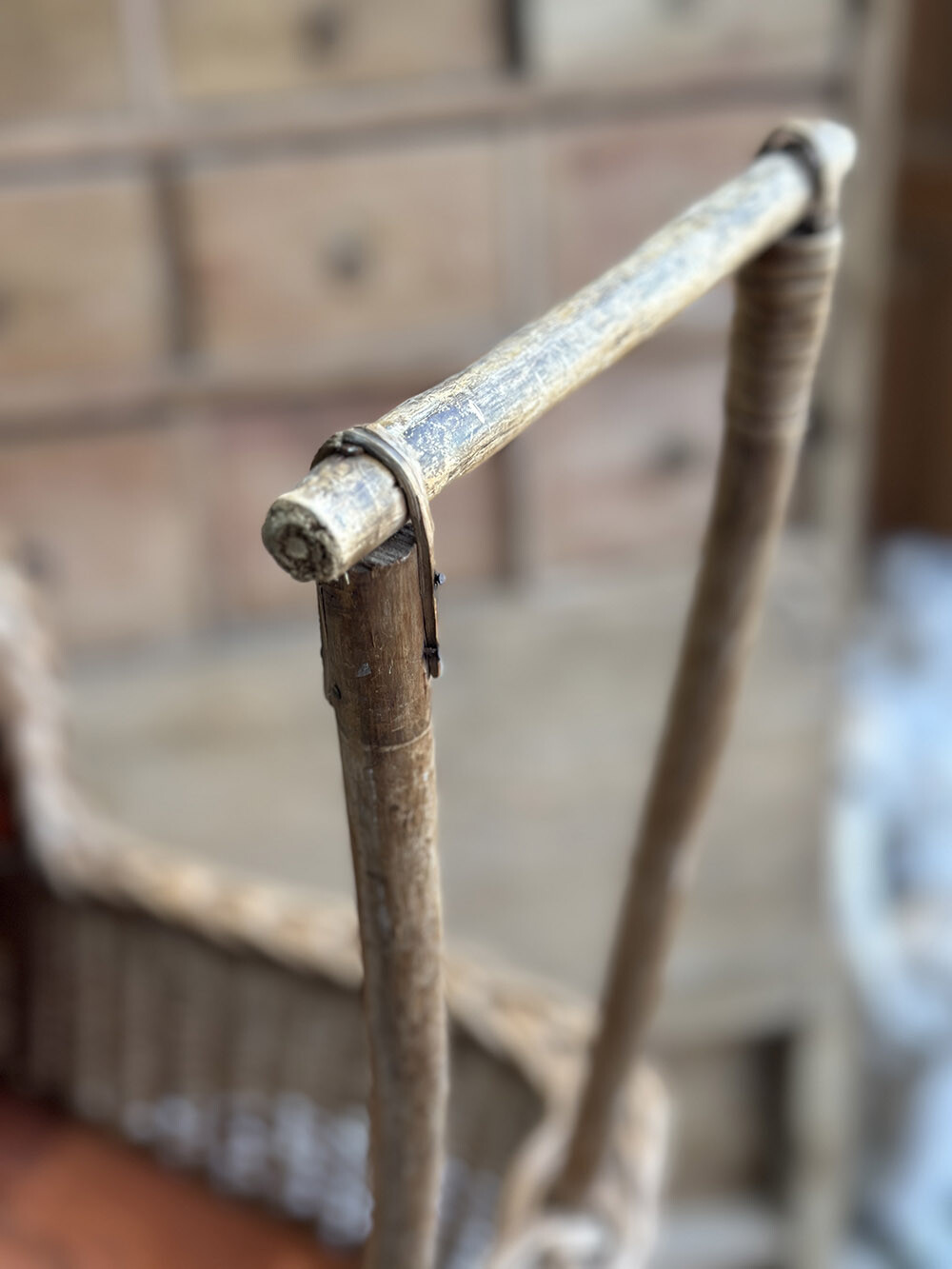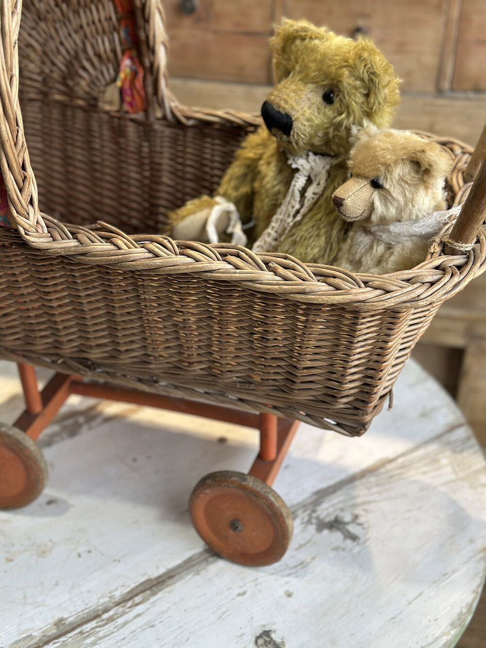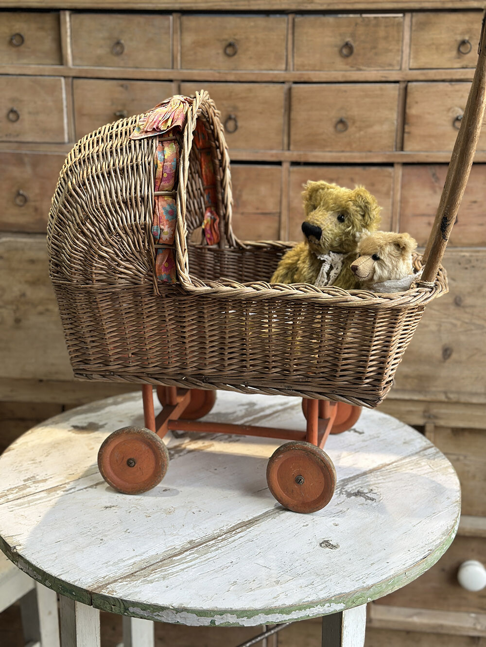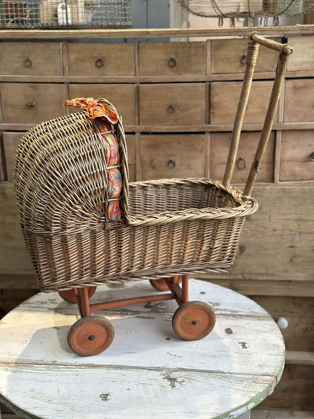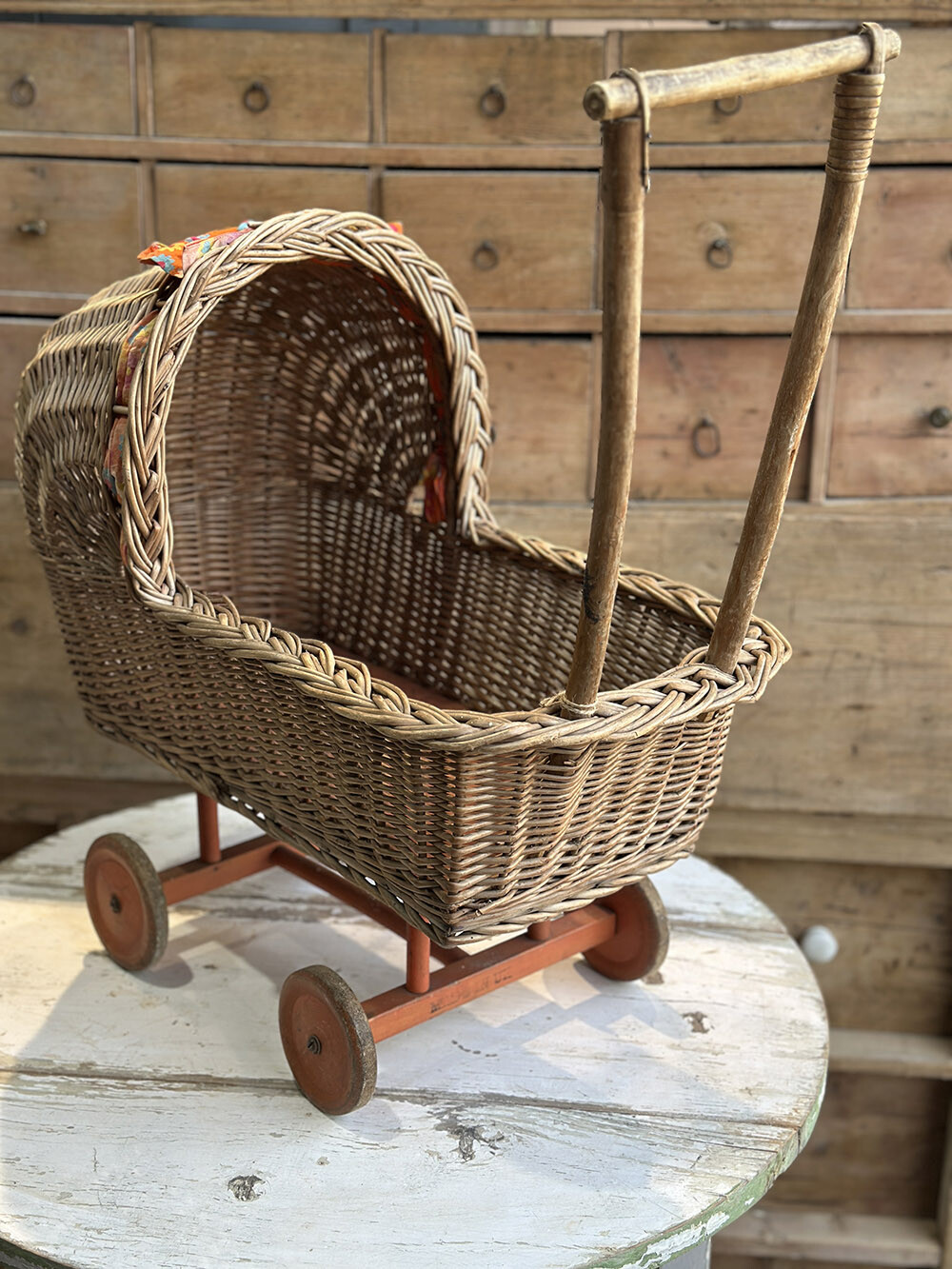 26a-125 Vintage kid's wicker buggy with wooden wheels