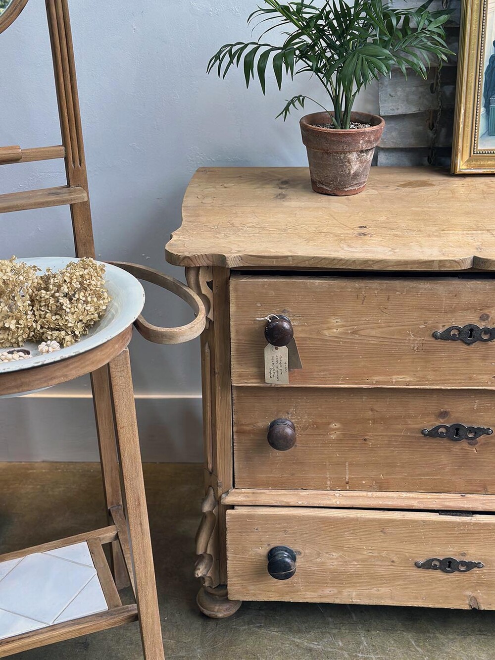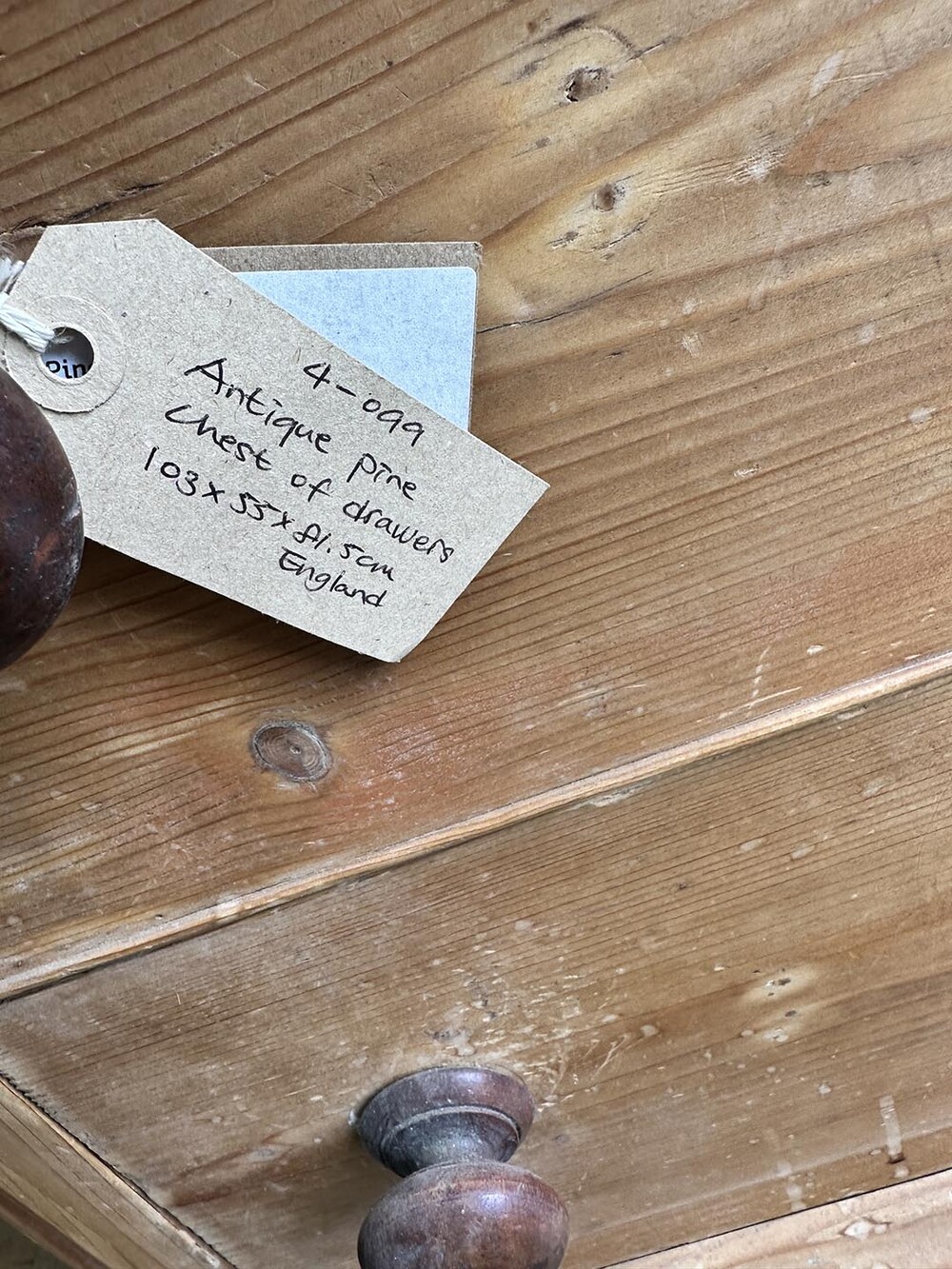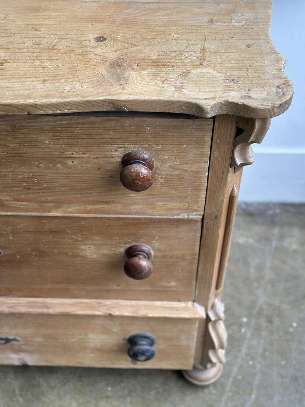 이 체스트는 소나무(pine)로 만들어졌지만, 가구의 전체적인 형태에서는 당시 유행하던 마호가니 체스트의 기품 있는 디자인이 느껴집니다. 안정감 있게 자리 잡은 번(bun) 레그와 서랍 중앙에 달린 오물루(ormolu) 키홀 장식은, 제작자가 단순한 실용성을 넘어 고급스러운 가구를 지향했다는 흔적을 보여주지요. 손잡이는 19세기 가구에서 흔히 볼 수 있는 플레인 놉(plain knob)으로 달려 있어 소박하면서도 시대의 감각이 고스란히 전해집니다. 오래된 파인의 따뜻한 결에 고급 양식을 차용한 디자인이 어우러져, 이 체스트는 단순한 수납 가구를 넘어 공간에 매혹적인 빈티지 감성을 불어넣어 줄 아이템이라 할 수 있습니다.