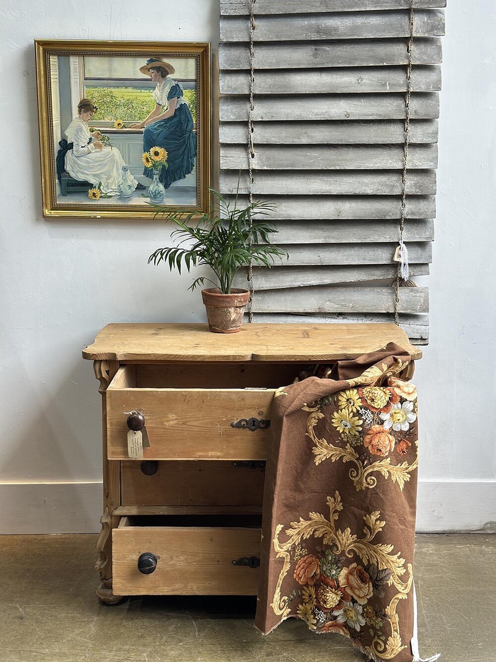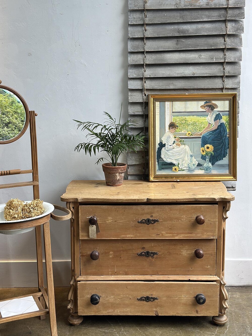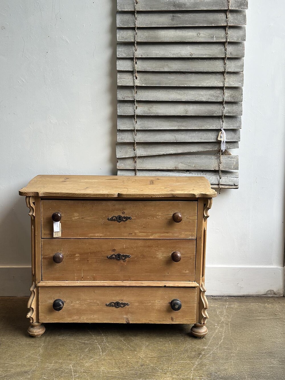 이 체스트는 소나무(pine)로 만들어졌지만, 가구의 전체적인 형태에서는 당시 유행하던 마호가니 체스트의 기품 있는 디자인이 느껴집니다. 안정감 있게 자리 잡은 번(bun) 레그와 서랍 중앙에 달린 오물루(ormolu) 키홀 장식은, 제작자가 단순한 실용성을 넘어 고급스러운 가구를 지향했다는 흔적을 보여주지요. 손잡이는 19세기 가구에서 흔히 볼 수 있는 플레인 놉(plain knob)으로 달려 있어 소박하면서도 시대의 감각이 고스란히 전해집니다. 오래된 파인의 따뜻한 결에 고급 양식을 차용한 디자인이 어우러져, 이 체스트는 단순한 수납 가구를 넘어 공간에 매혹적인 빈티지 감성을 불어넣어 줄 아이템이라 할 수 있습니다.