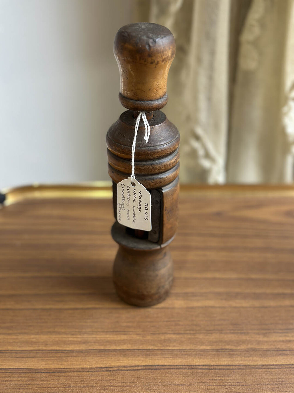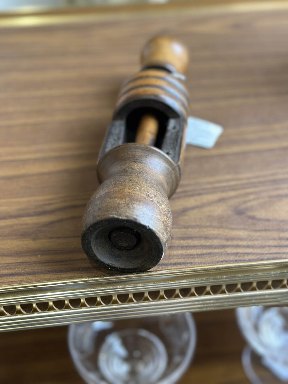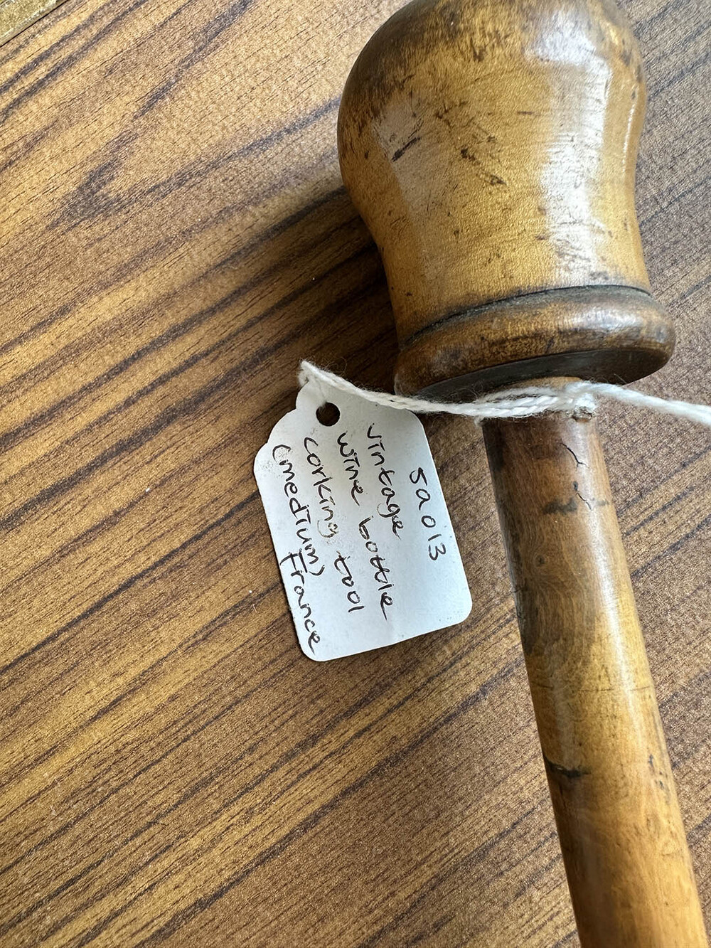 코르크 마개를 밀어 넣어서 와인 보틀을 밀봉할 때에 썼던 옛 도구로, 주로 와이너리에서 사용되었습니다. 피스톤처럼 생긴 손잡이를 위로 잡아 당기고, 가운데 홀에 코르크 마개를 넣은 다음, 와인 보틀 주둥이 대고 힘껏 밀어 넣는 방식으로 작동 합니다. 주로 참나무 원목을 선반으로 깎고 파내어서 제작했습니다.