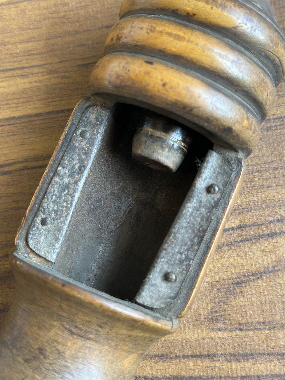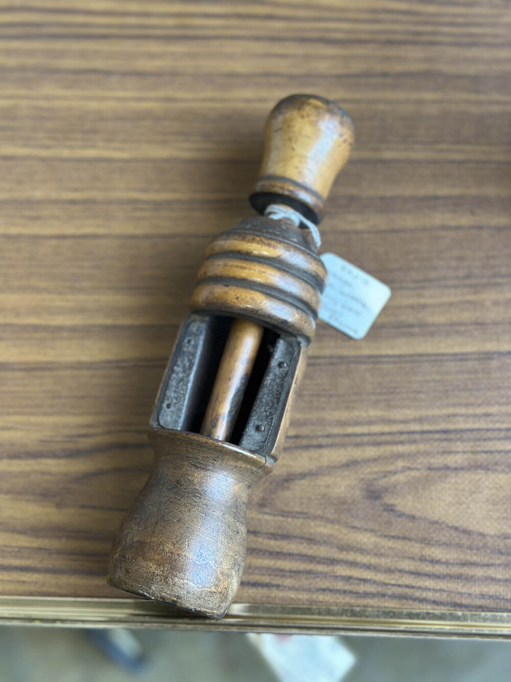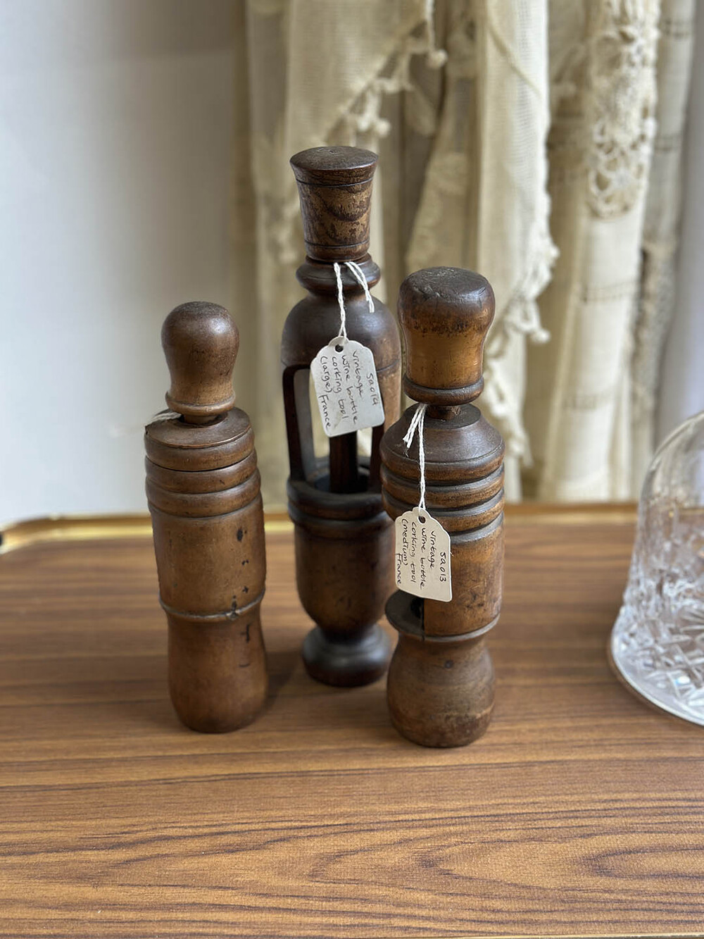 코르크 마개를 밀어 넣어서 와인 보틀을 밀봉할 때에 썼던 옛 도구로, 주로 와이너리에서 사용되었습니다. 피스톤처럼 생긴 손잡이를 위로 잡아 당기고, 가운데 홀에 코르크 마개를 넣은 다음, 와인 보틀 주둥이 대고 힘껏 밀어 넣는 방식으로 작동 합니다. 주로 참나무 원목을 선반으로 깎고 파내어서 제작했습니다.