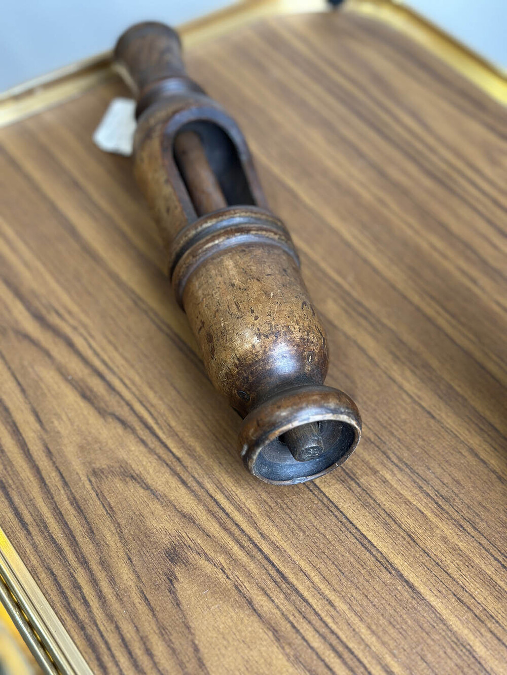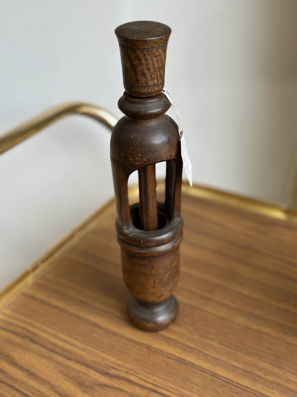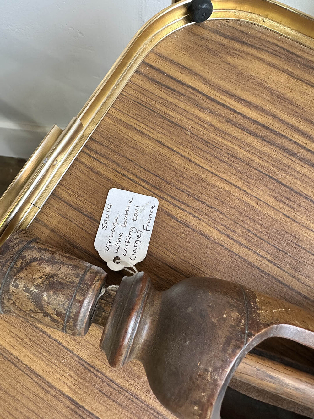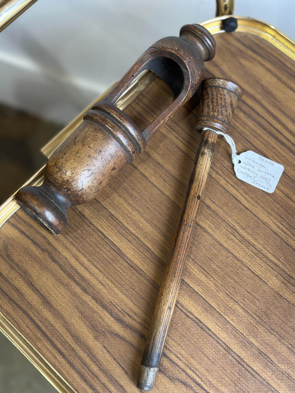 코르크 마개를 밀어 넣어서 와인 보틀을 밀봉할 때에 썼던 옛 도구로, 주로 와이너리에서 사용되었습니다. 피스톤처럼 생긴 손잡이를 위로 잡아 당기고, 가운데 홀에 코르크 마개를 넣은 다음, 와인 보틀 주둥이 대고 힘껏 밀어 넣는 방식으로 작동 합니다. 주로 참나무 원목을 선반으로 깎고 파내어서 제작했습니다.