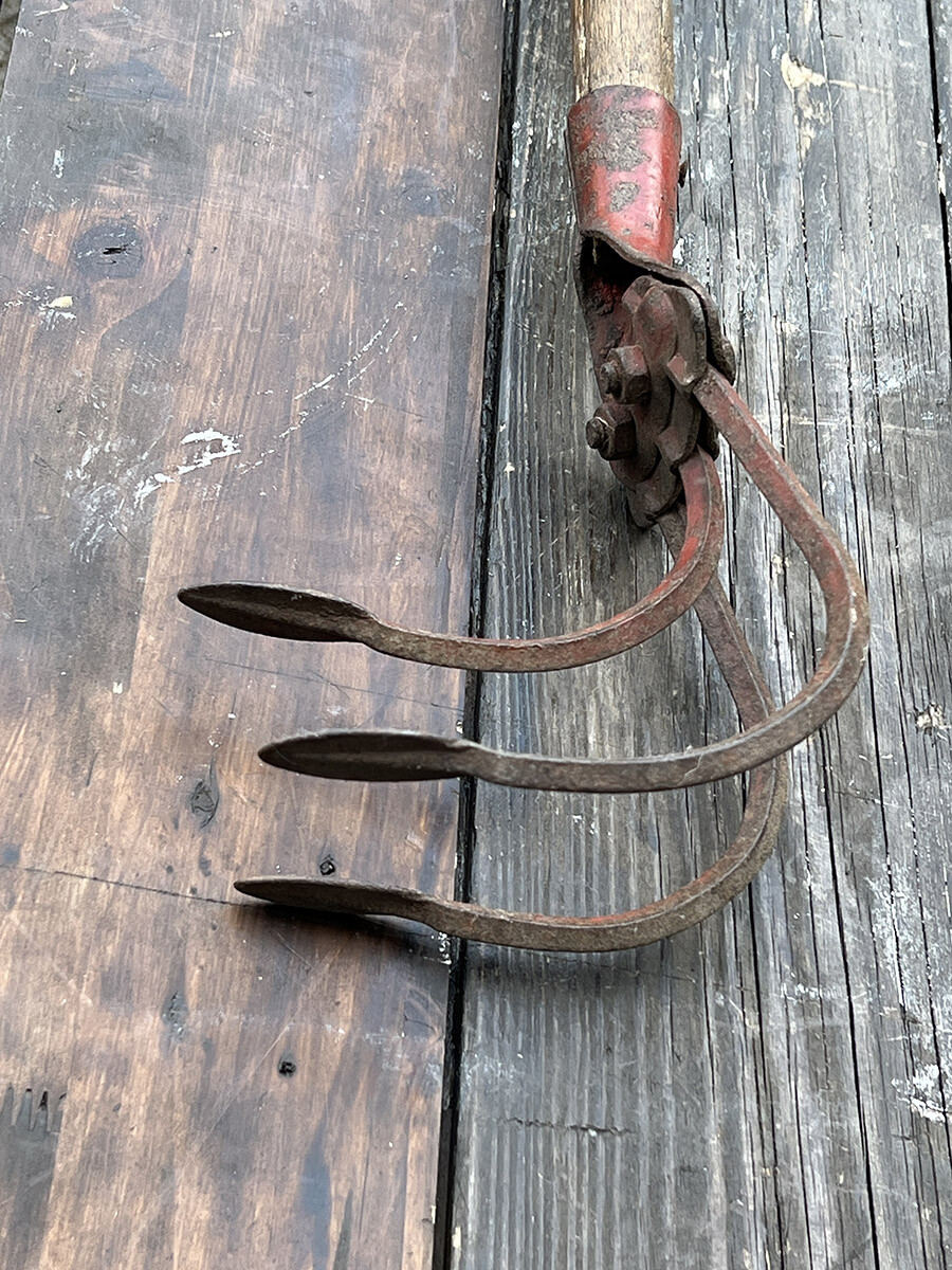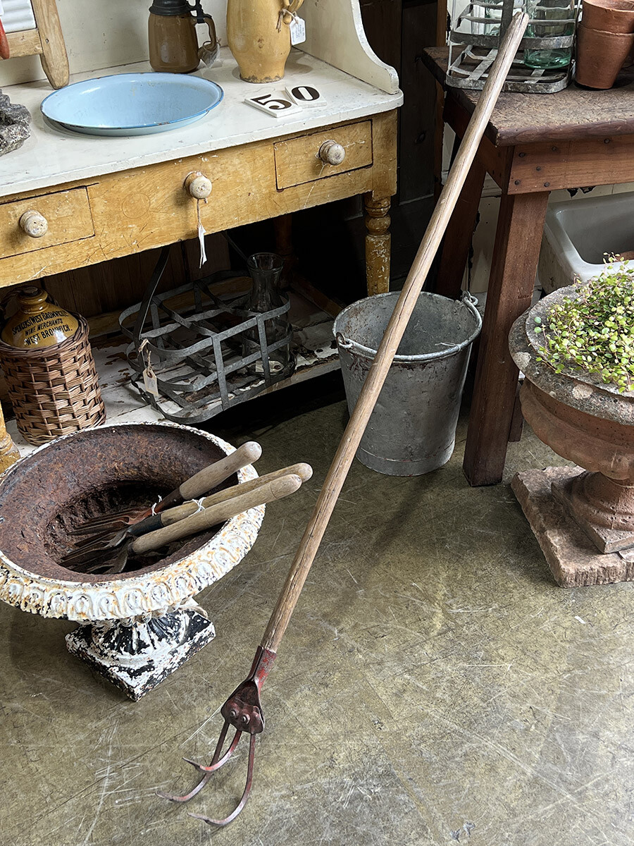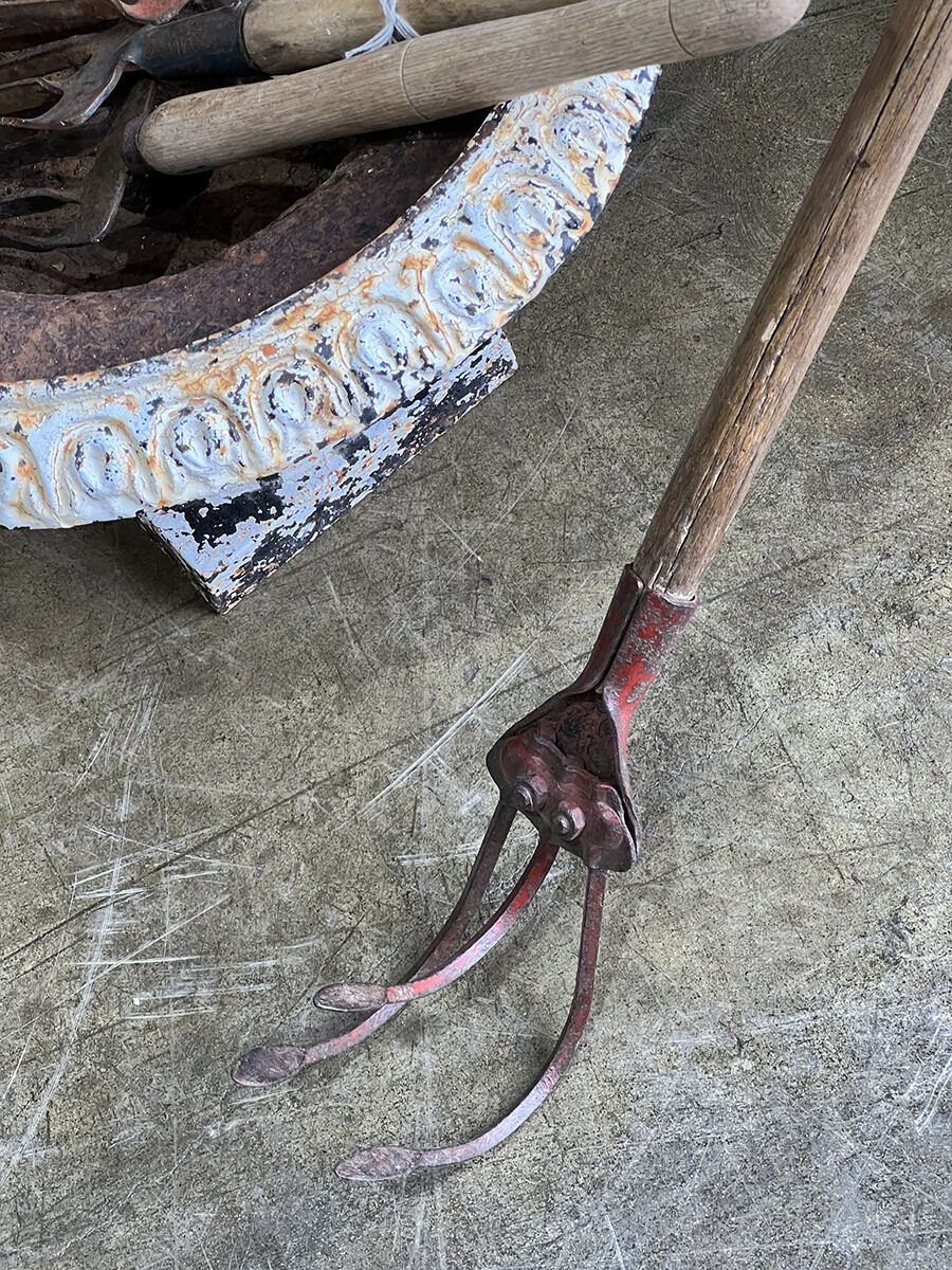 정원과 가드닝의 나라 영국. 오래전 장인에 의해서 하나 하나 제작되었던 앤틱-빈티지 가드닝 툴은 그 내구성과 만듦새가 훌륭한 것은 물론, 긴 시간의 파티나가 덧입혀져 쉽게 볼 수 없는 캐릭터를 자아냅니다. 쇠붙이나 날붙이는 묵직한 카스트 아이언(철제 주물)으로 일일이 대장간에서 두드려 제작했고, 원목을 선반으로 세심하게 깎아서 손잡이를 달아 두었기에 장인의 정성어린 손길을 느낄 수 있습니다. 해당 상품은 앤틱 가드닝 롱 피치포크로 주물로 제작되어진 부분과 원목 손잡이에 모두 긴 세월에 의해 형성된 파티나가 매력적인 상품입니다. 실사용보다는 오나먼트로 사용하시기 바랍니다.