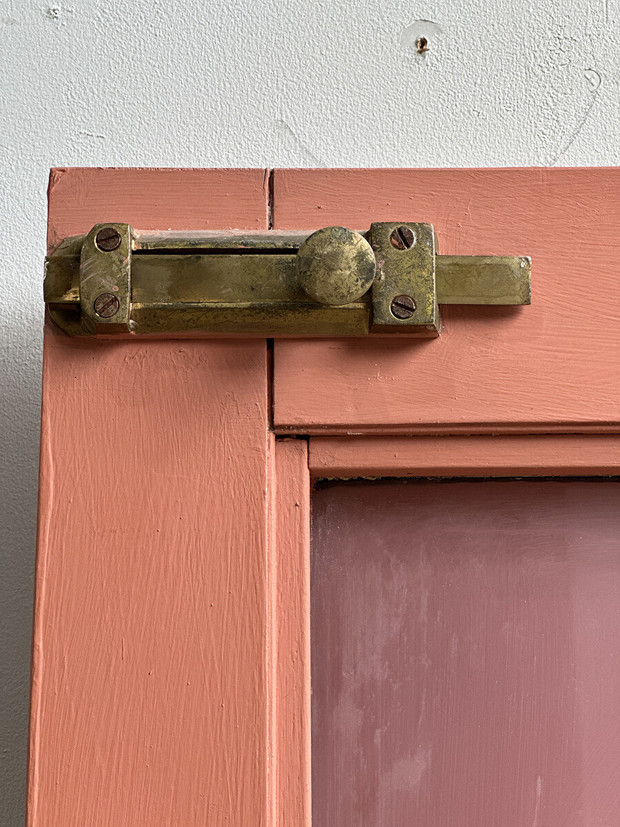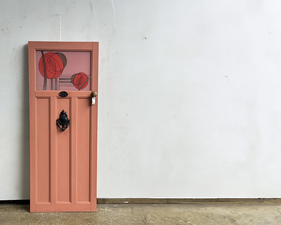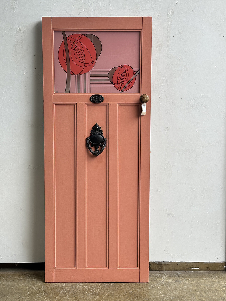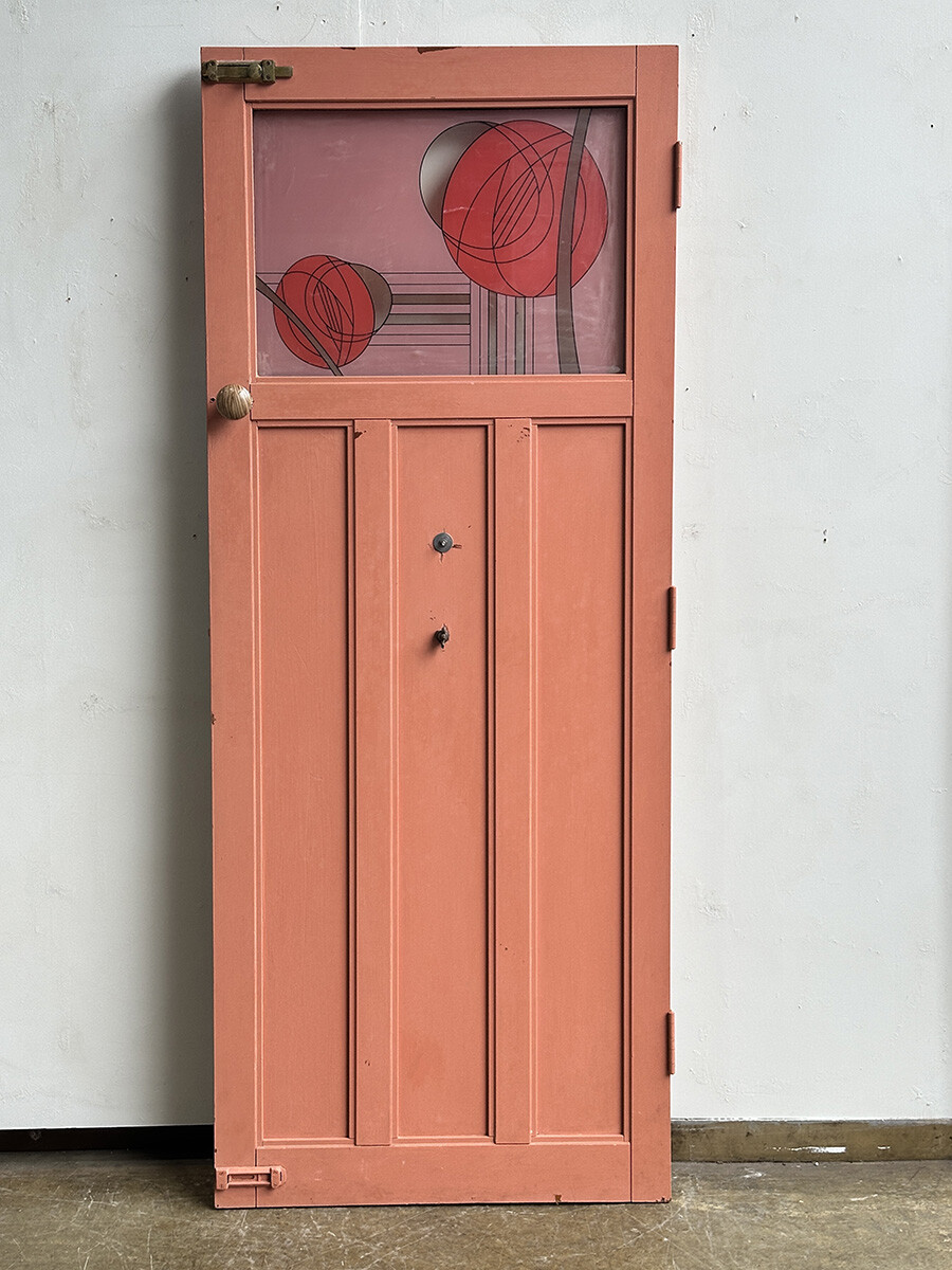 1920~1930년대 아트 데코(Art Deco ; 프랑스식 발음은 아르 데코) 시대에 제작된 오리지널 프론트 도어(현관문)입니다. 도어에 들어가 있는 글라스 장식에서 사물을 추상적인 도형과 직선으로 표현하는 당시의 양식적 특징을 볼 수 있죠. 두꺼운 원목으로 제작되어 있어 매우 묵직하며, 코랄 핑크 컬러의 바디에 스테인드 글라스까지 모두 같은 계통의 컬러를 가지고 있어서 캐릭터가 매우 유니크합니다. 또한 여기에 넘버 플레이트와 도어 노커 같은 하드웨어는 블랙 컬러로 달려 있어서 컬러의 대비효과가 강해서 더욱 캐릭터가 살아나는 느낌입니다.